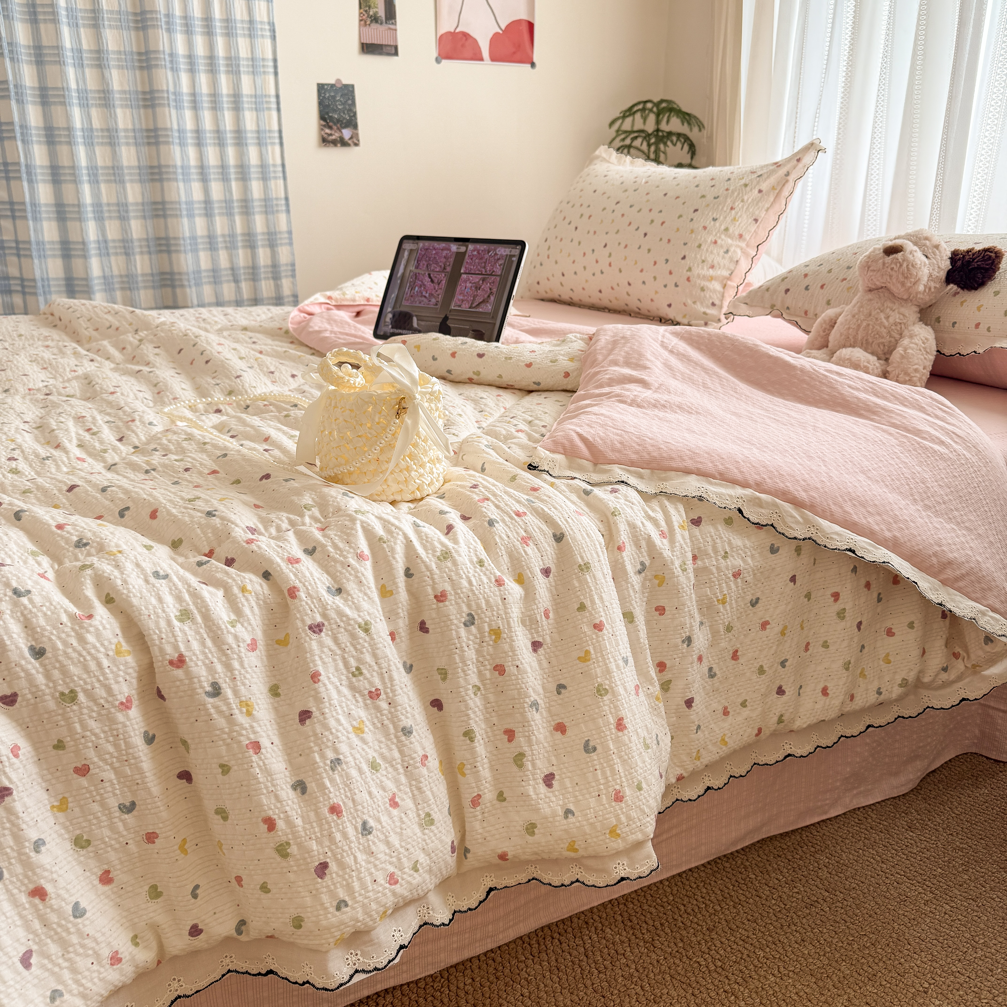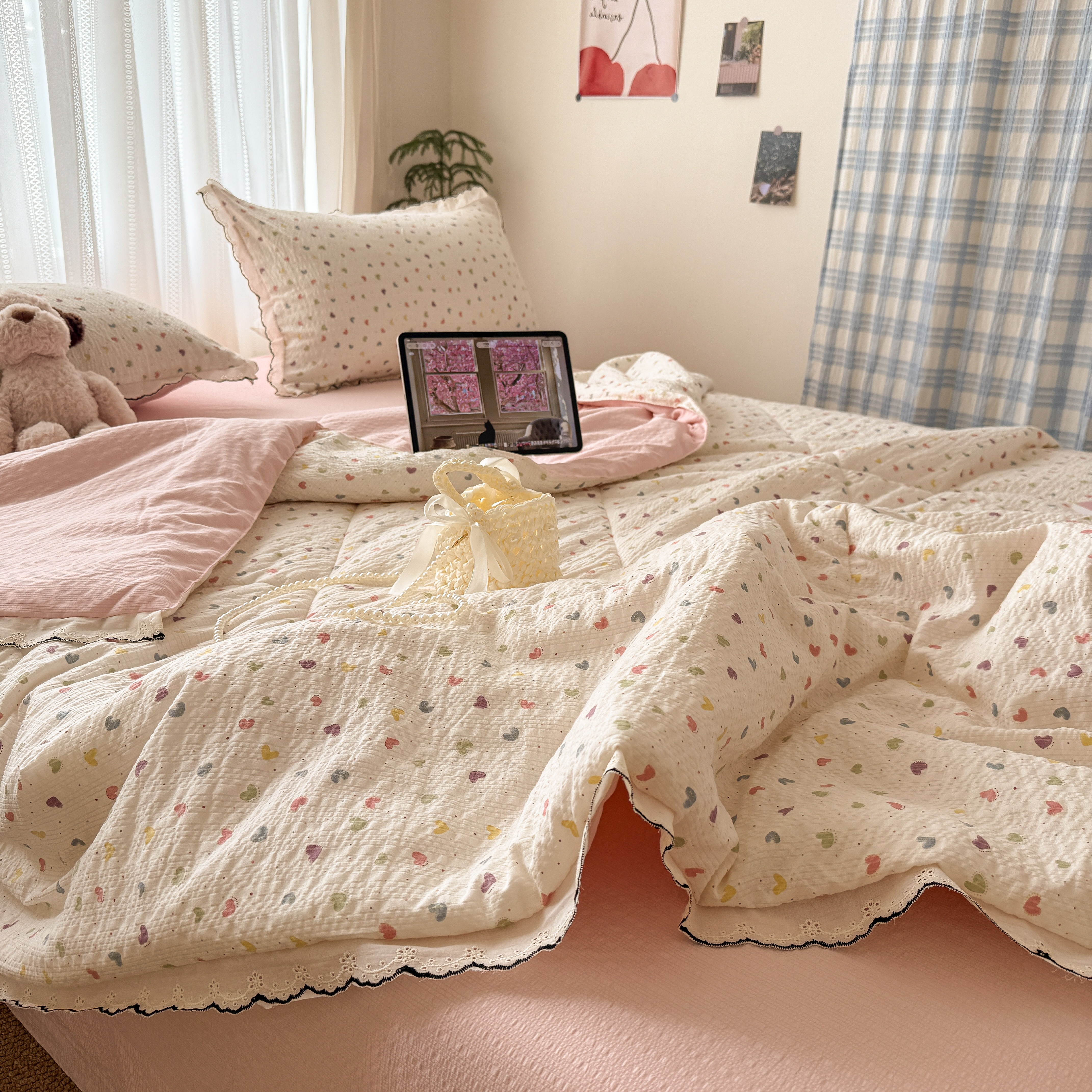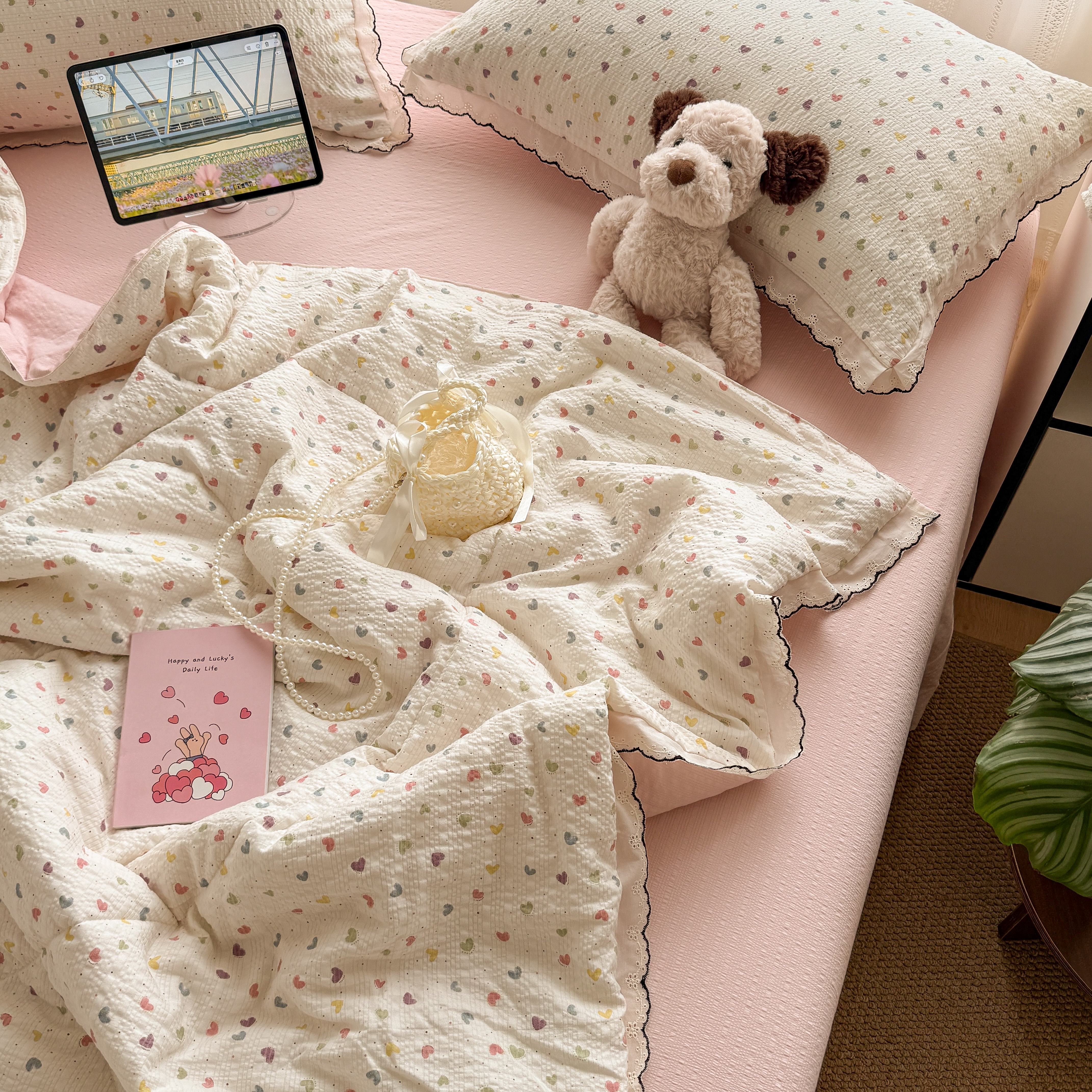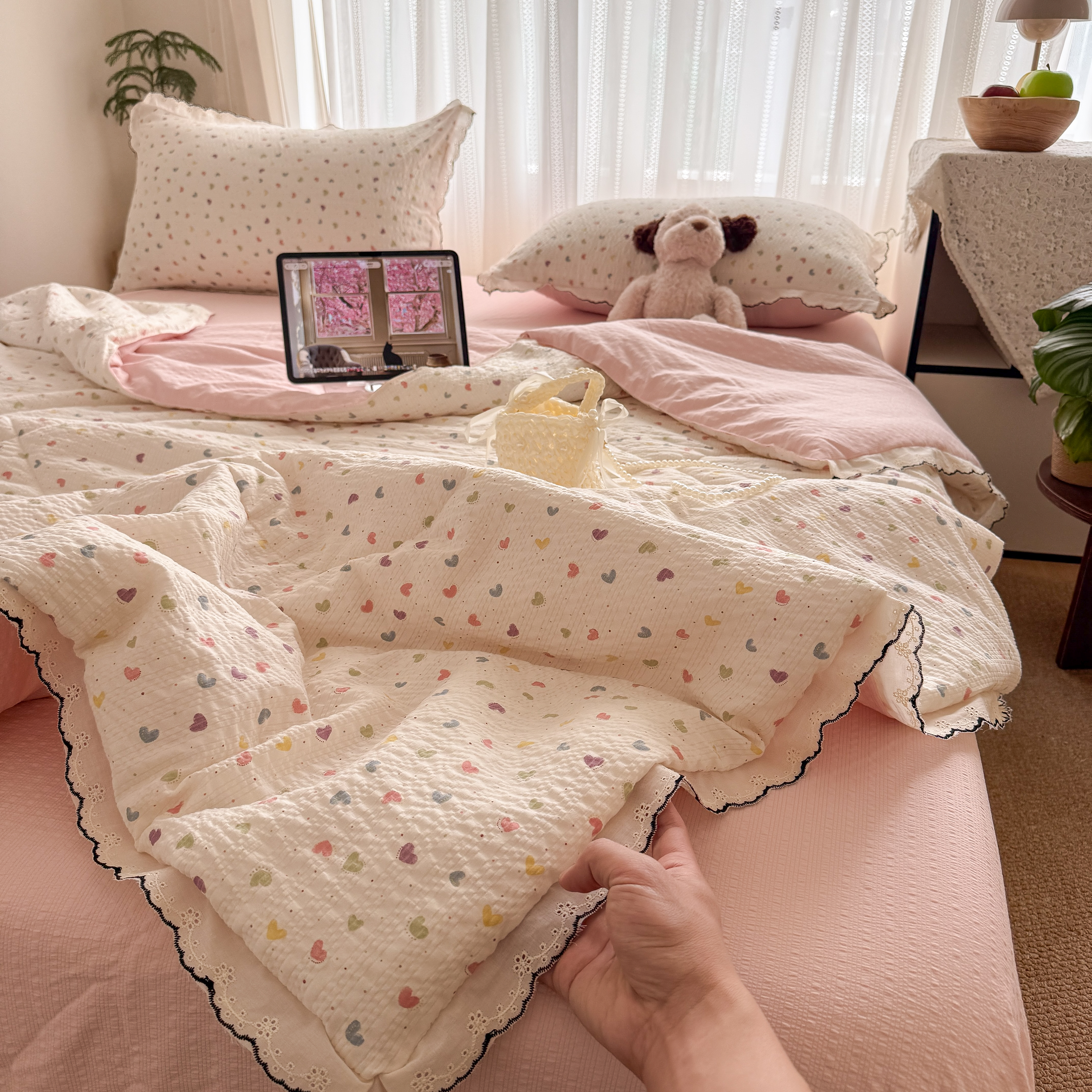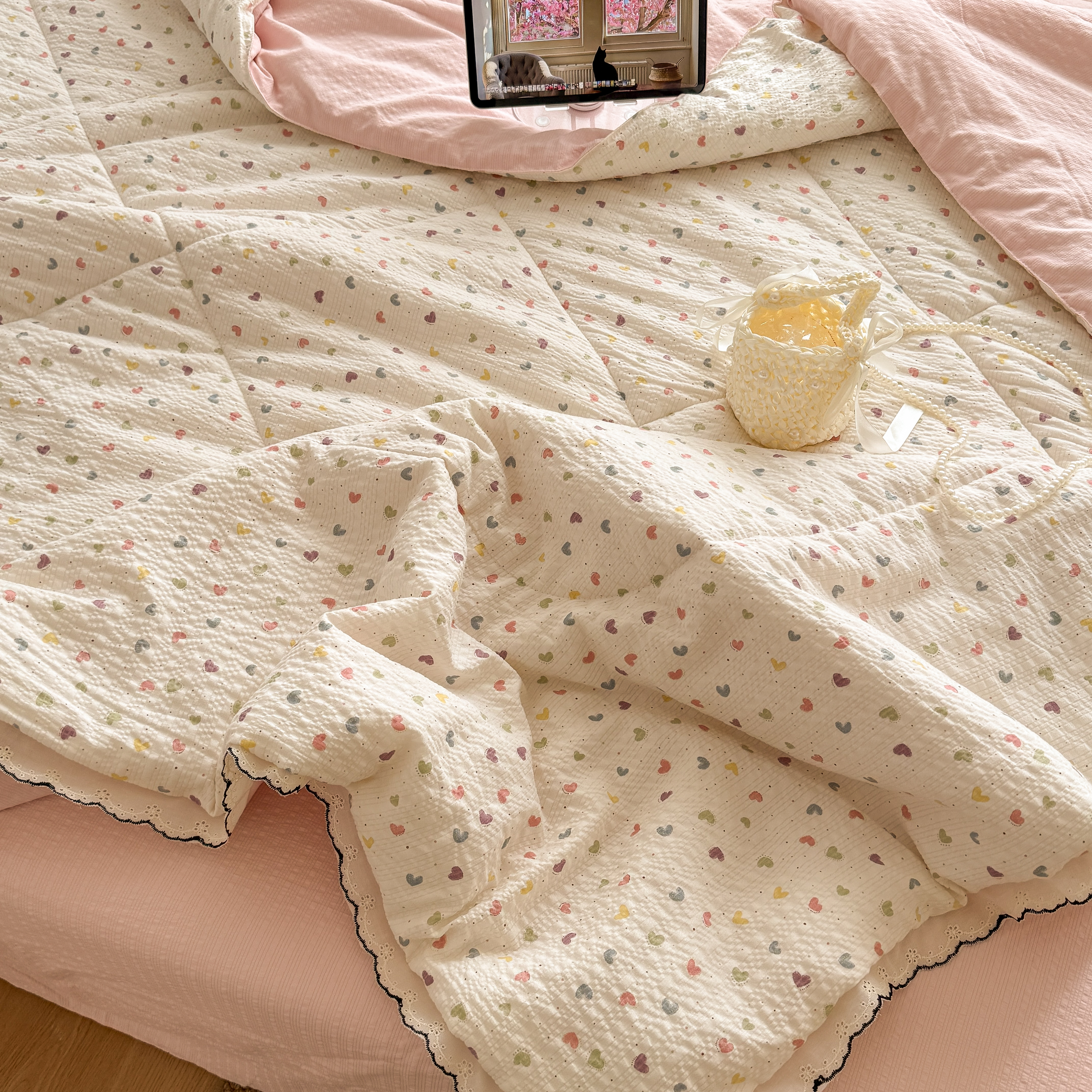 欧尚 2026新款蕾丝花边夏被款四件套 彩心点点