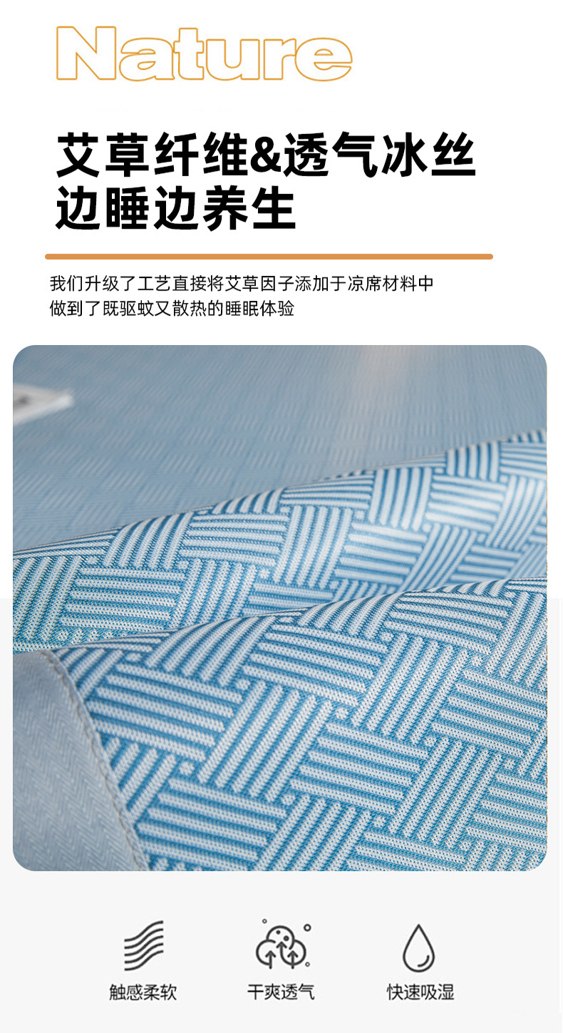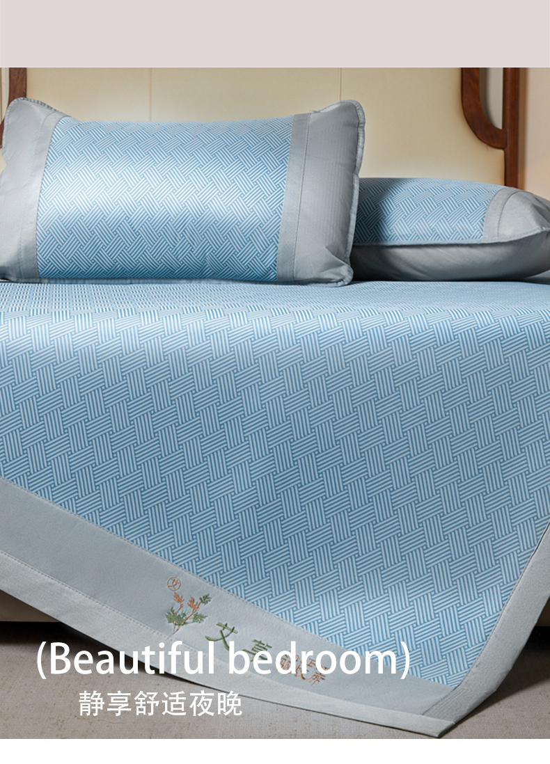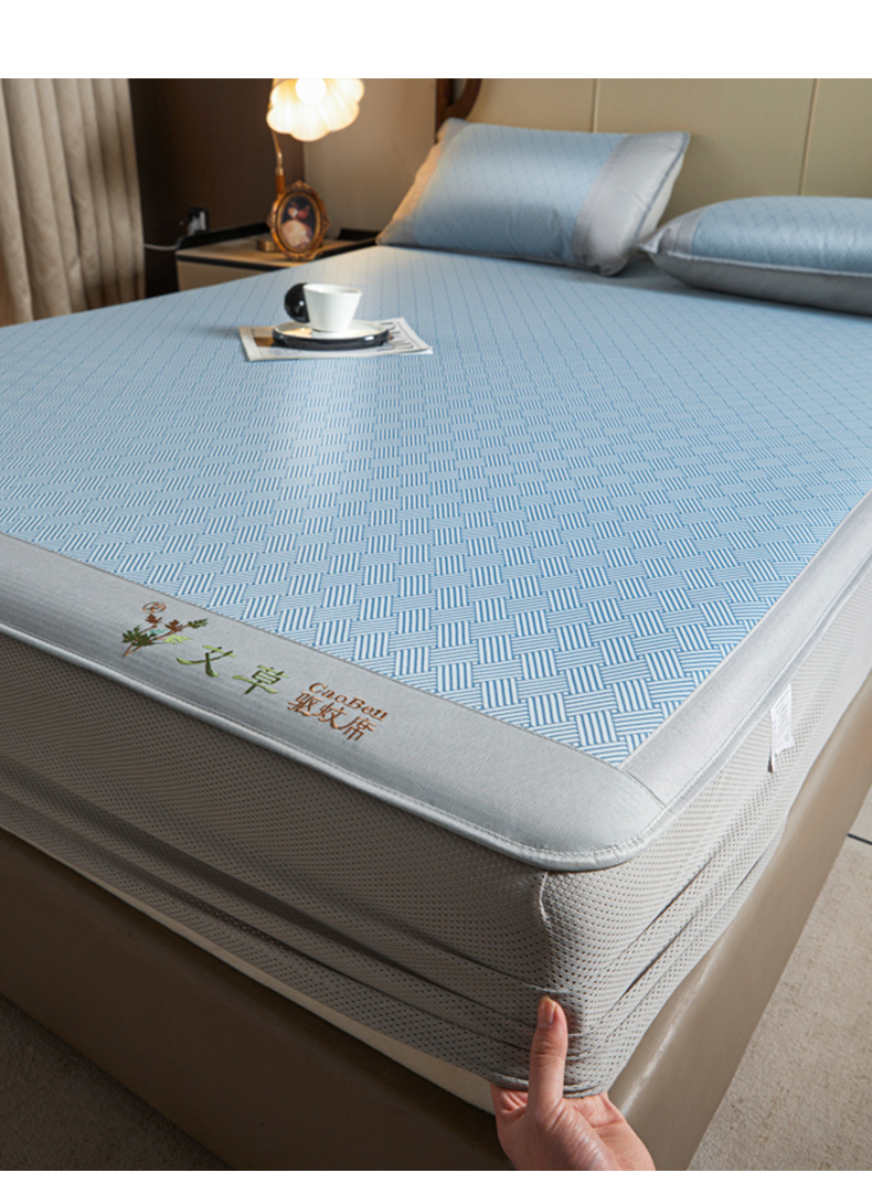 • 91家纺网 家纺一手货源 找家纺 航途席业 2026新款刺绣可水洗碳光冰丝席宽包边无纺布冰丝席艾香系列 艾香冰丝床笠饼干-蓝