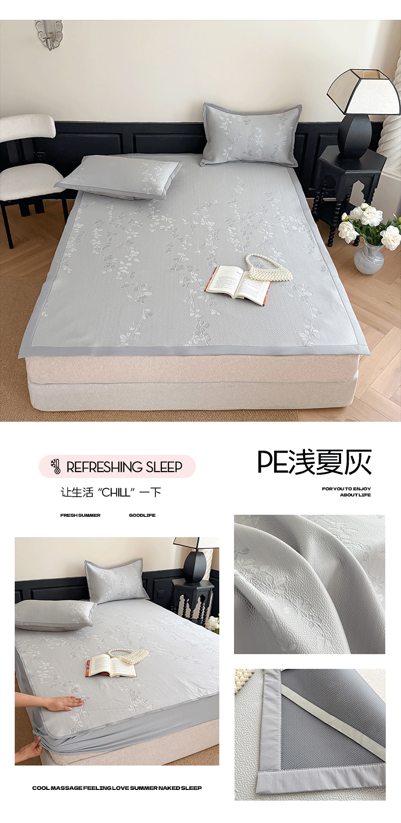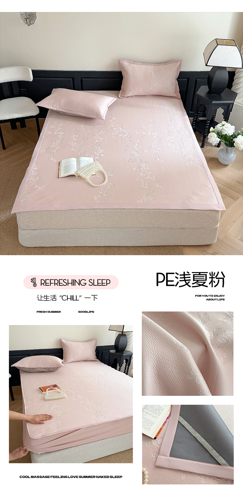 (总)吾欢心 2026新款高端复合三明治PE乙纶双面提花高克重凉席三件套浅夏系列,组合图仅供展示不可下单,PE浅夏粉-床席款,PE浅夏灰-床席款,PE浅夏蓝-床席款,PE浅夏绿-床席款,PE浅夏粉-床笠款,PE浅夏灰-床笠款,PE浅夏蓝-床笠款,PE浅夏绿-床笠款