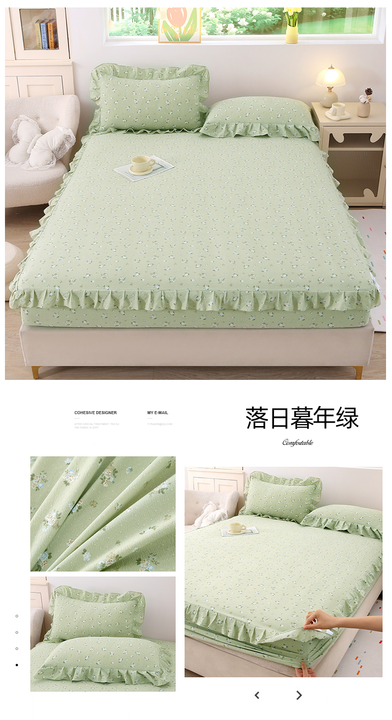 • 91家纺网 家纺一手货源 找家纺 乐逸家纺 2026新款A类母婴级韩系爆款花边款碎花床笠三件套四件套 韩系花边款床笠落日暮年绿