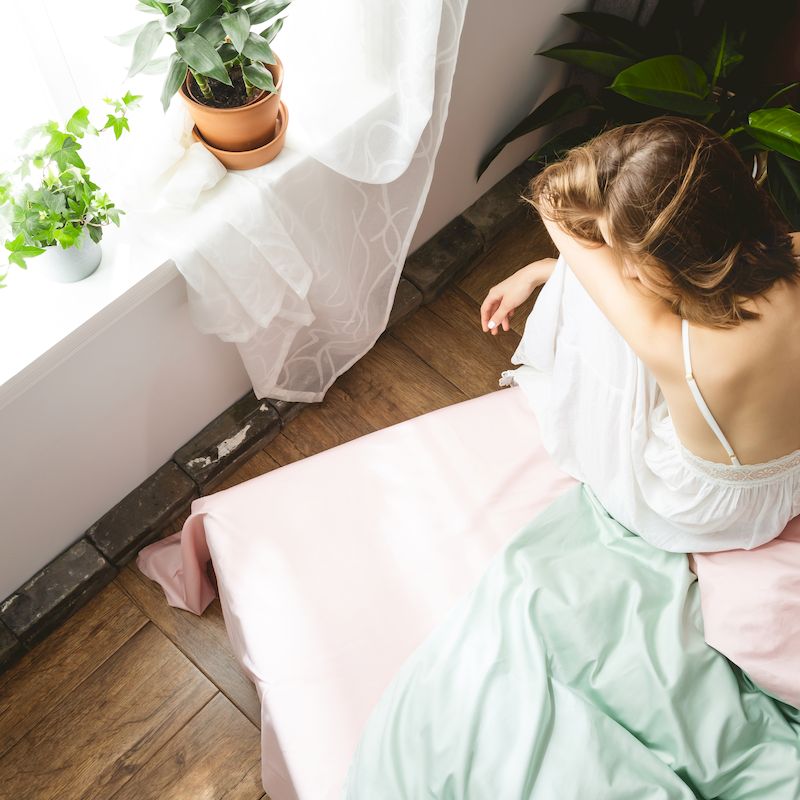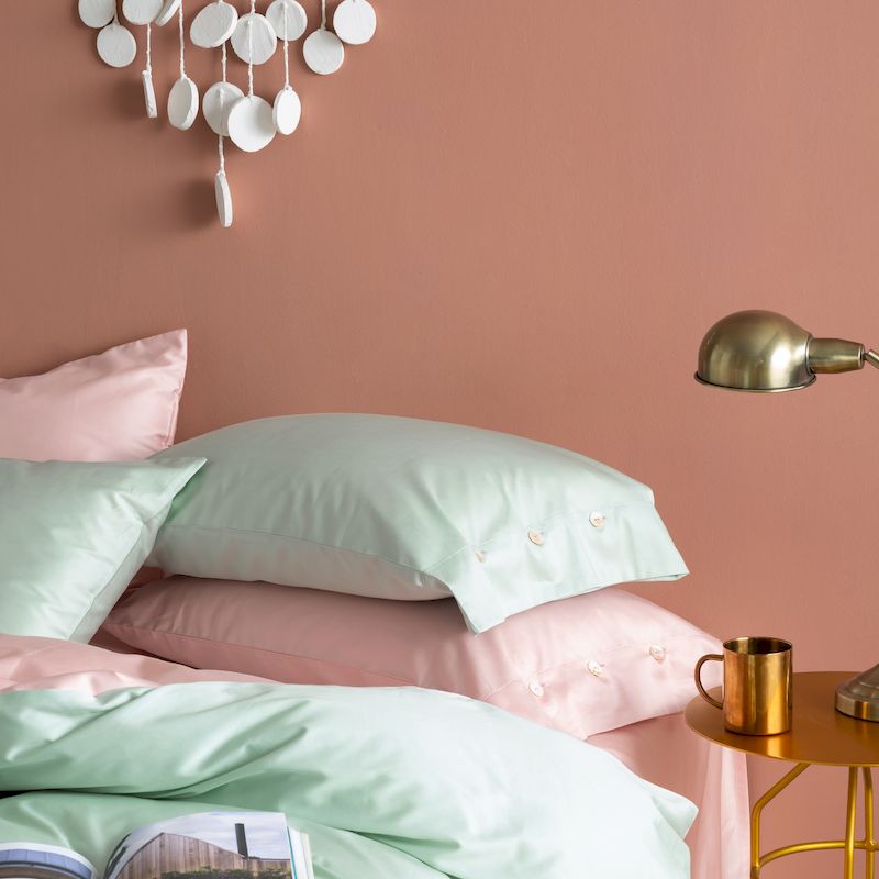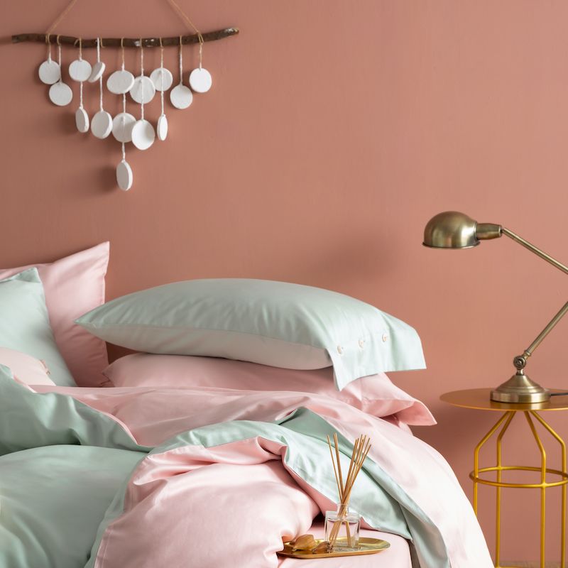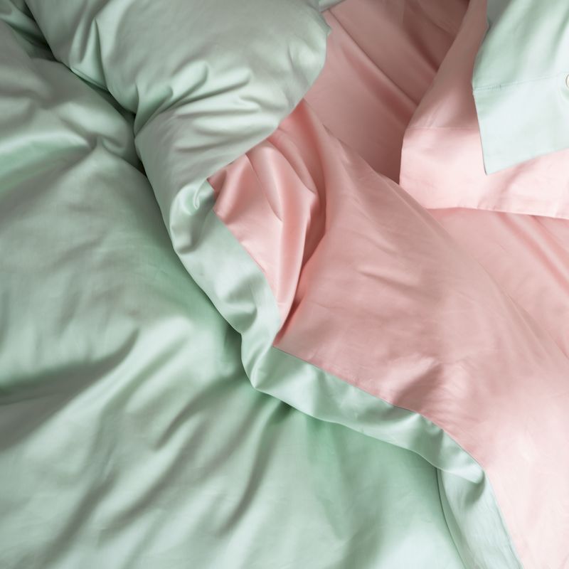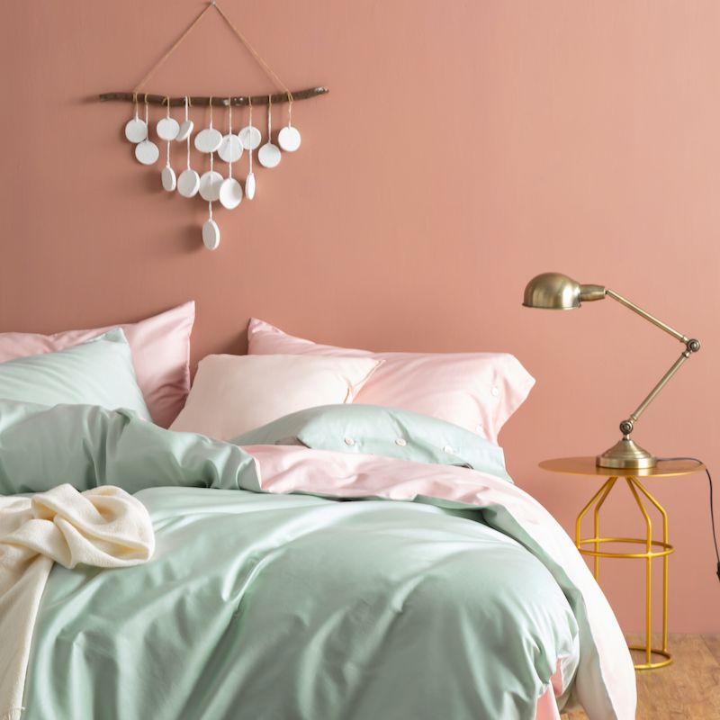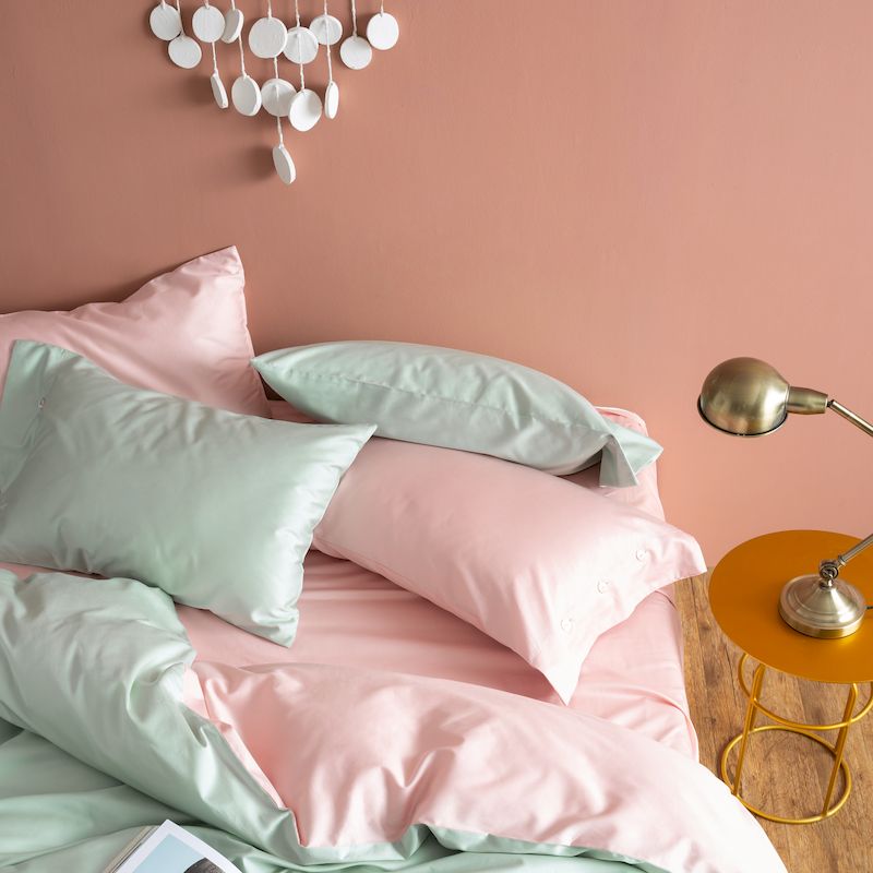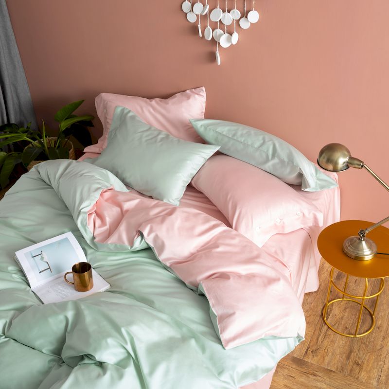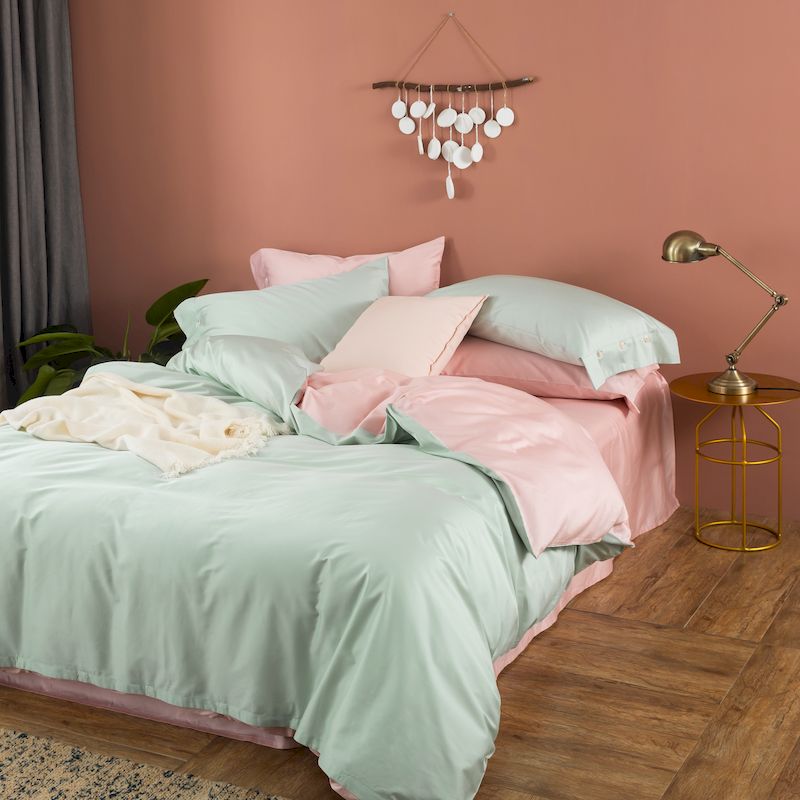 涞澳家纺2019新款60长绒棉平色二简易四件套浅藕粉配艾草绿
