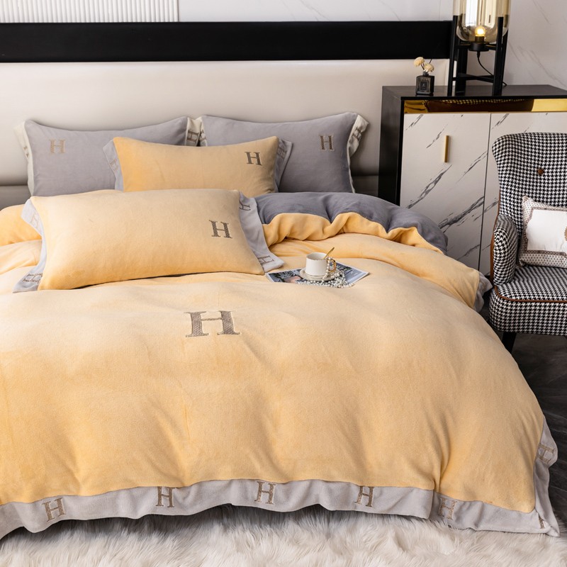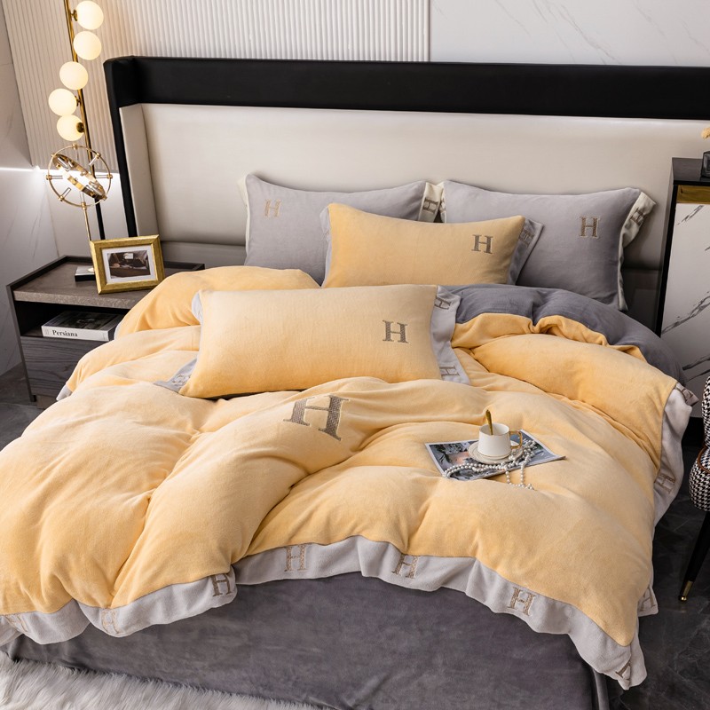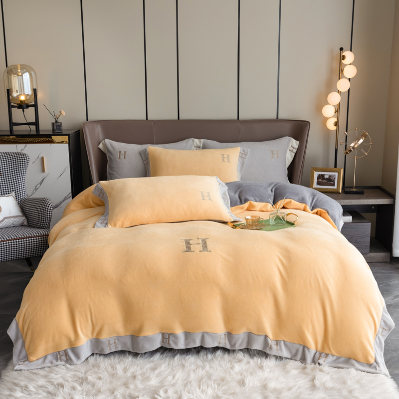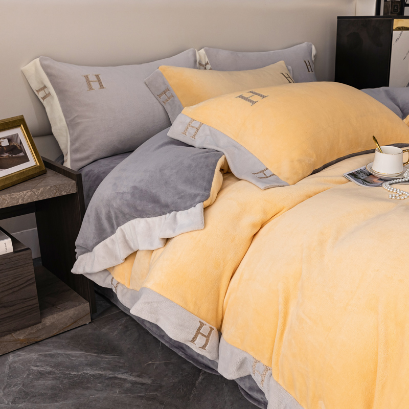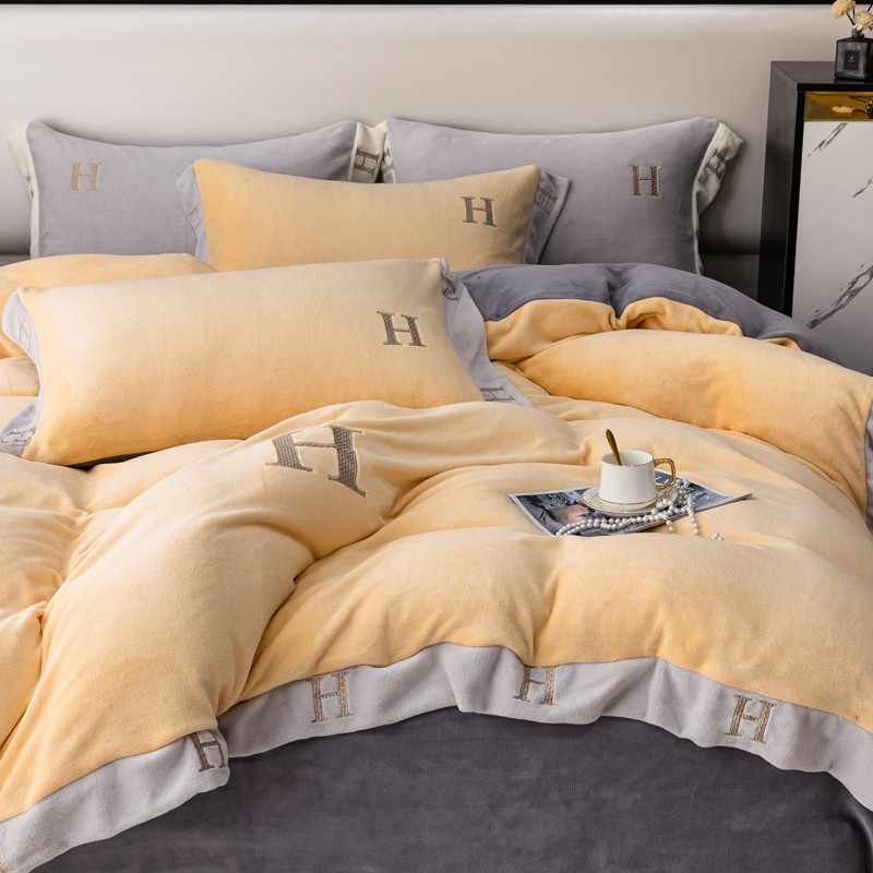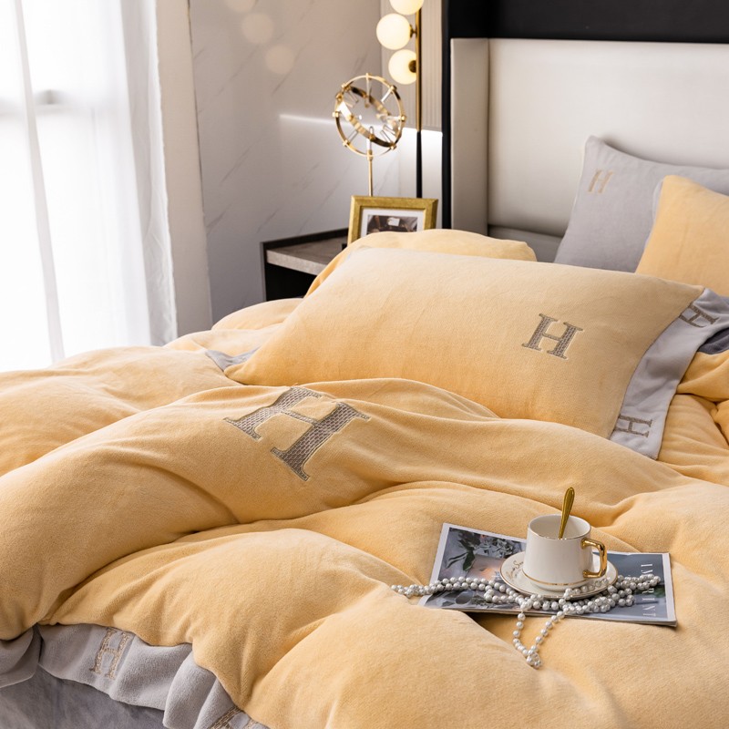芯贝儿 2021新款加厚牛奶绒轻奢宽边刺绣四件套 布丁黄
