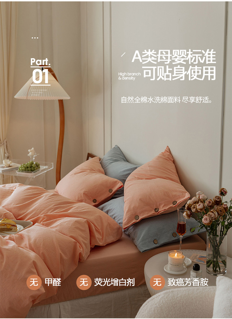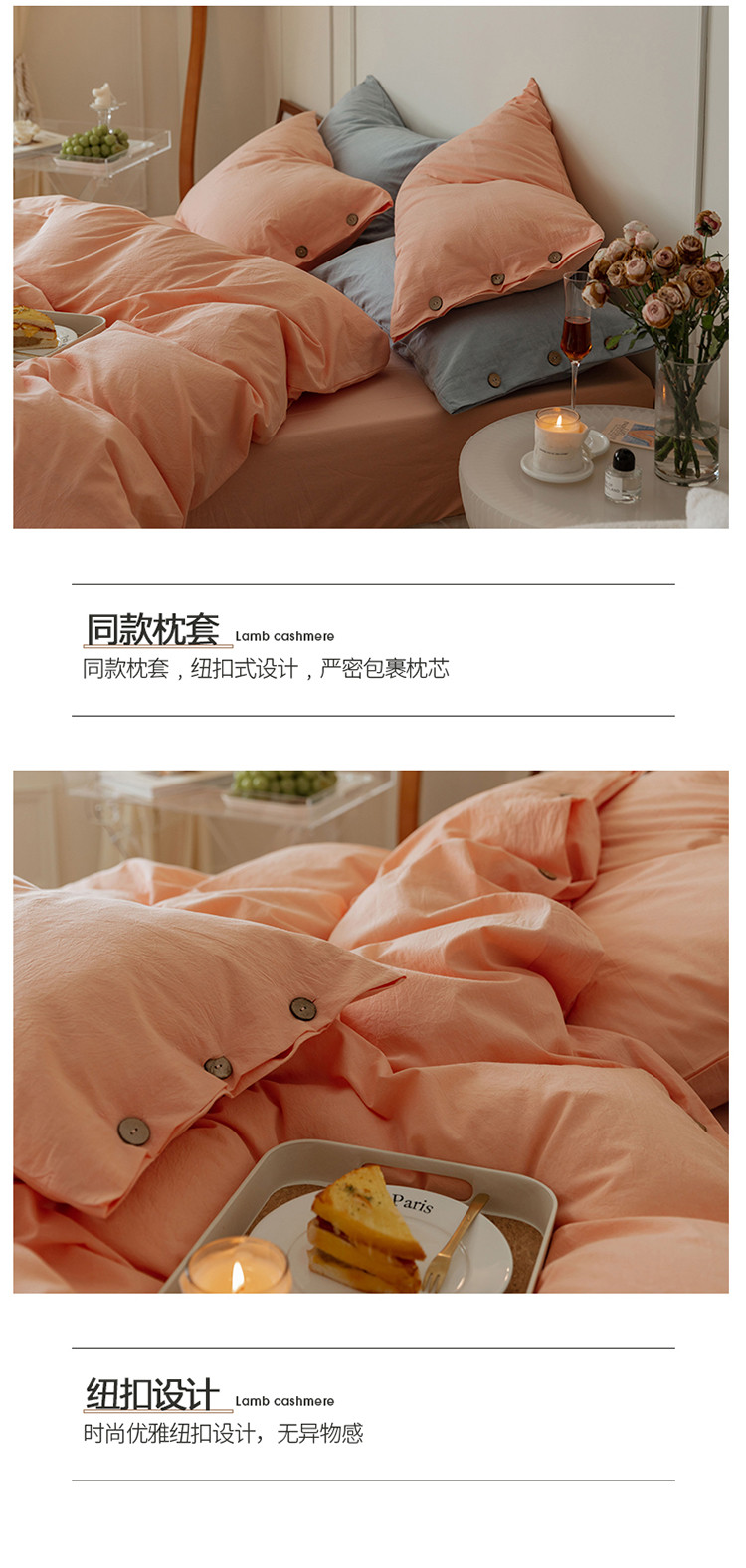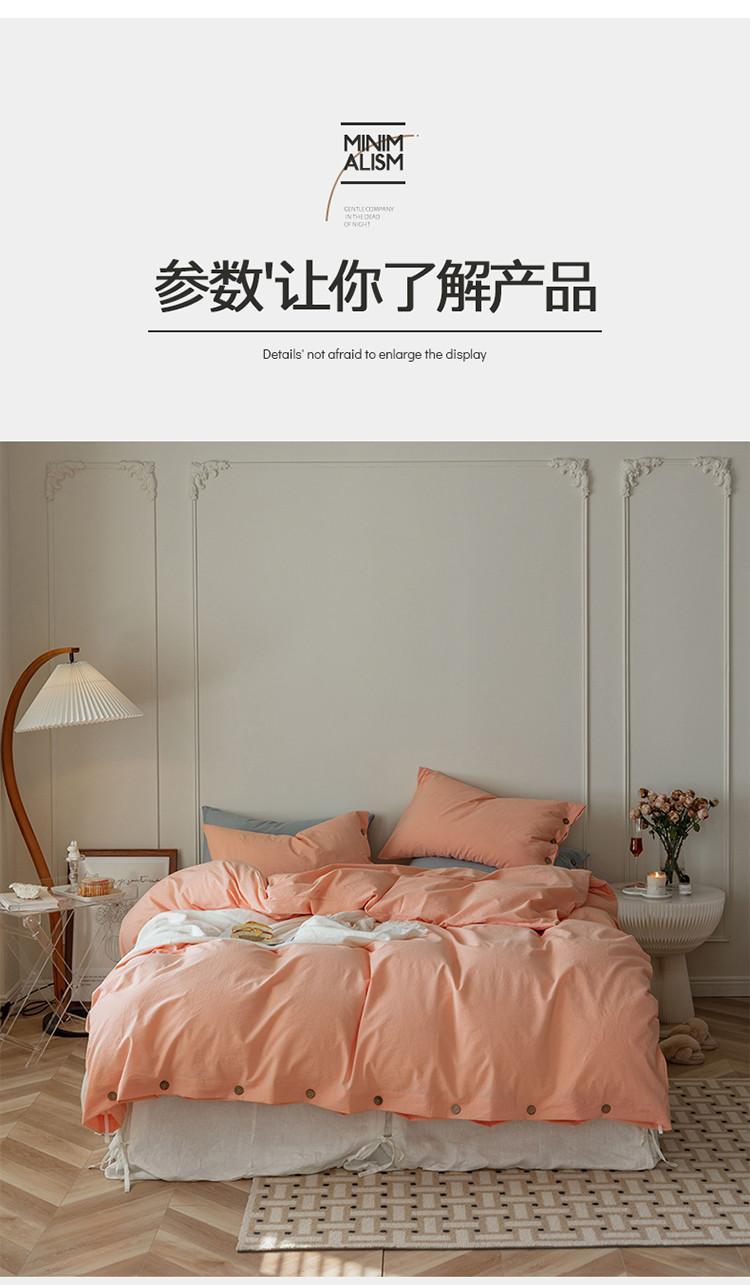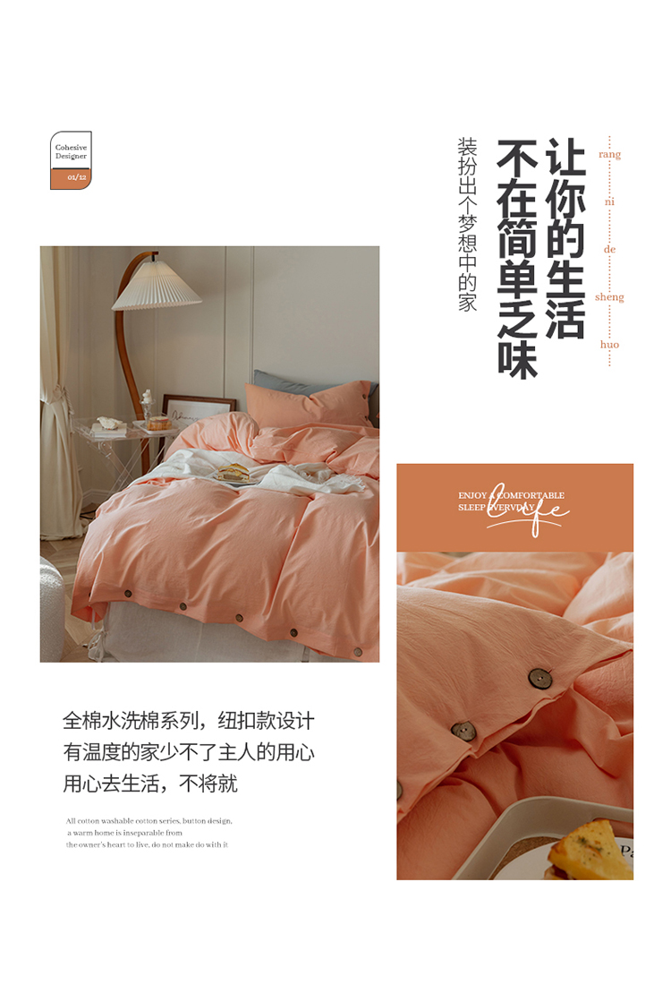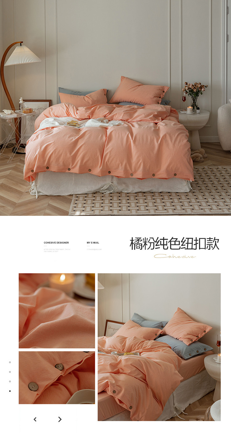 当前位置: 91家纺网 > 商品网购 > 床品套件 > 四件套 > 水洗棉四件套 > 寐眠 22年A类水洗棉全棉纽扣款四件套 橘粉纯色纽扣款