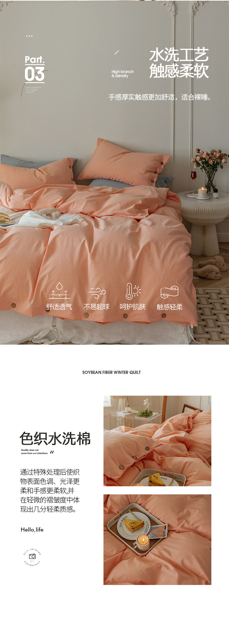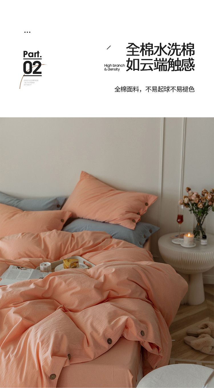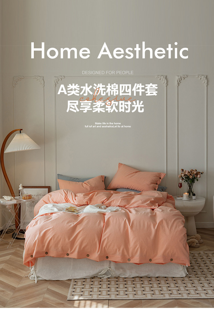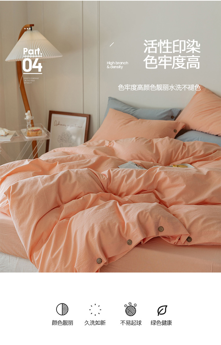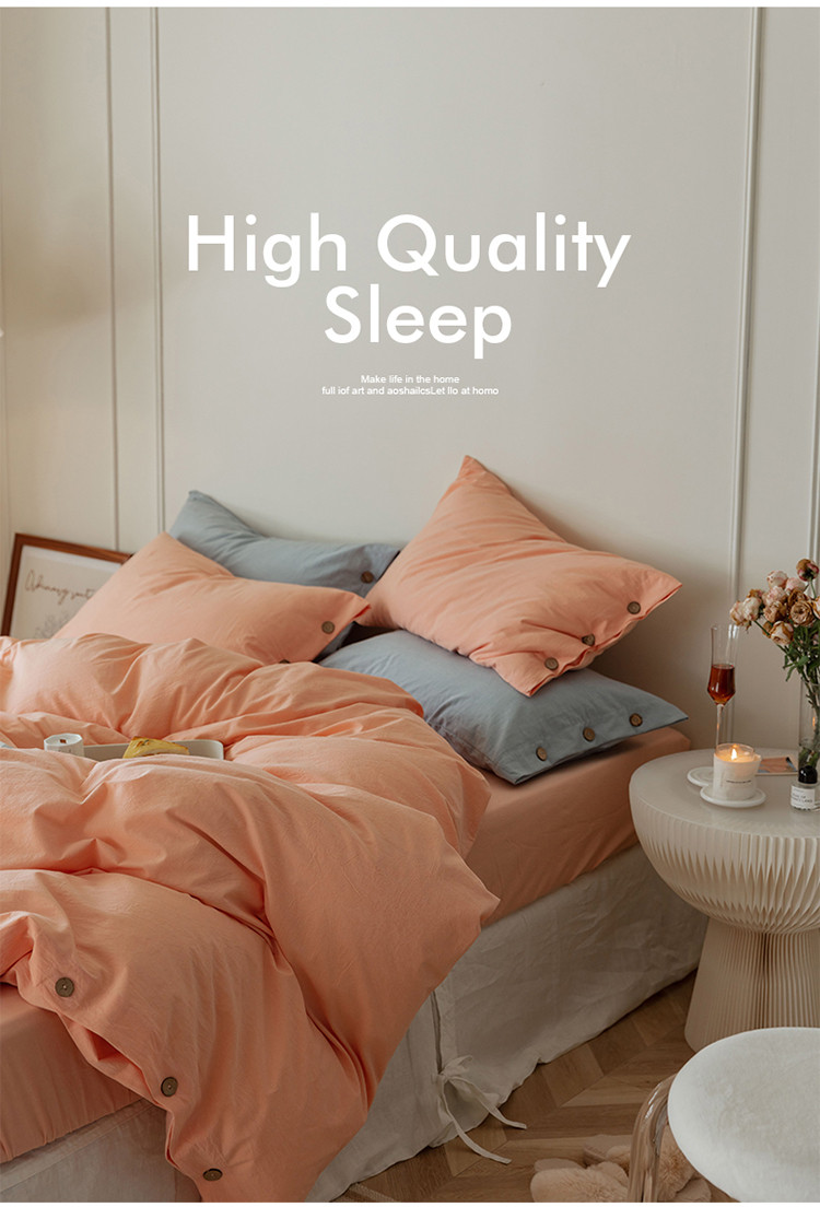 当前位置: 91家纺网 > 商品网购 > 床品套件 > 四件套 > 水洗棉四件套 > 寐眠 22年A类水洗棉全棉纽扣款四件套 橘粉纯色纽扣款