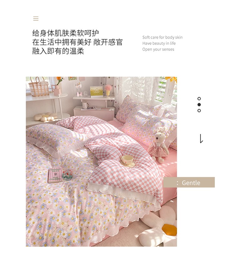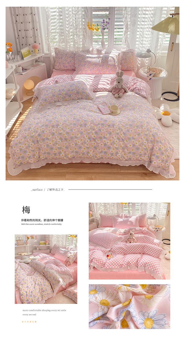 商品名称:大米家居双面用小雏菊雪纺花边海岛棉四件套 小雏菊-梅(粉色)
