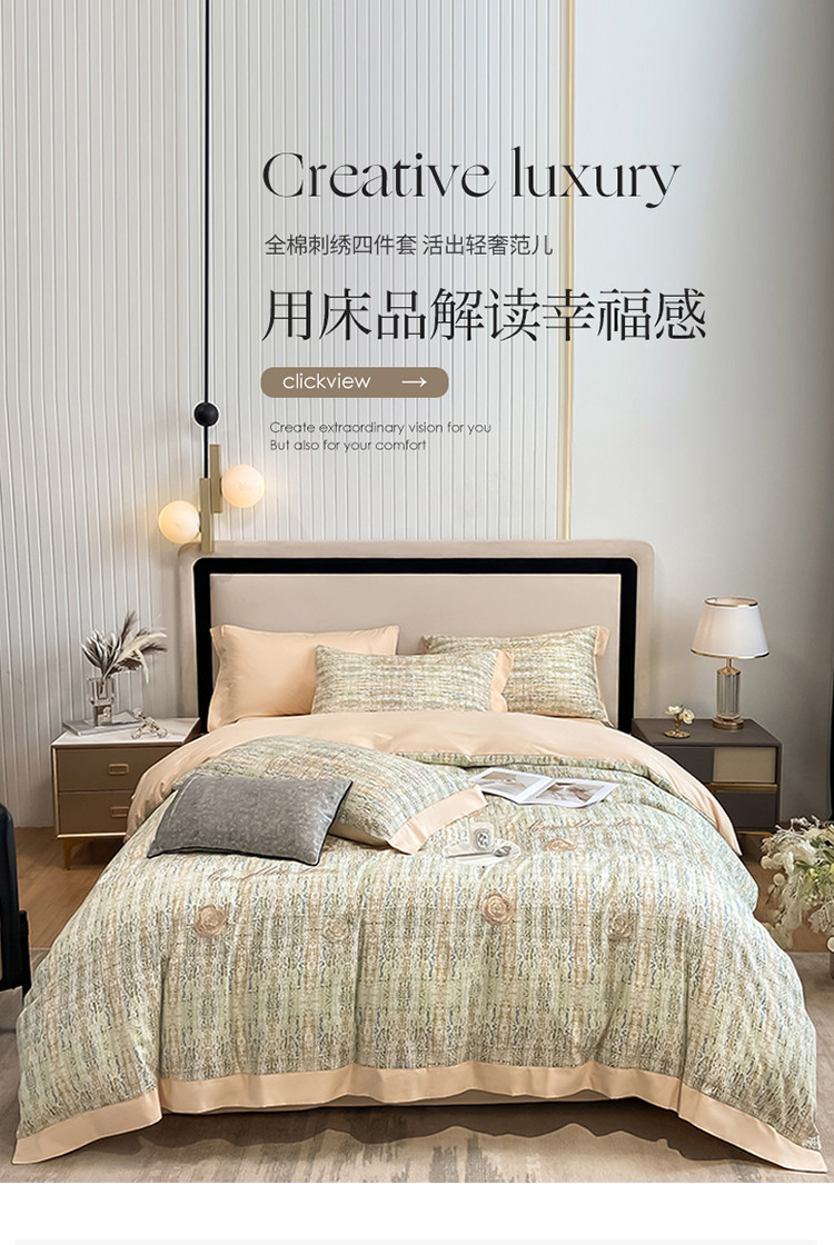 (总)涵宸家纺 2025新款全棉磨毛刺绣四件套系列-普莉,普莉-粉,普莉-绿,普莉-奶白