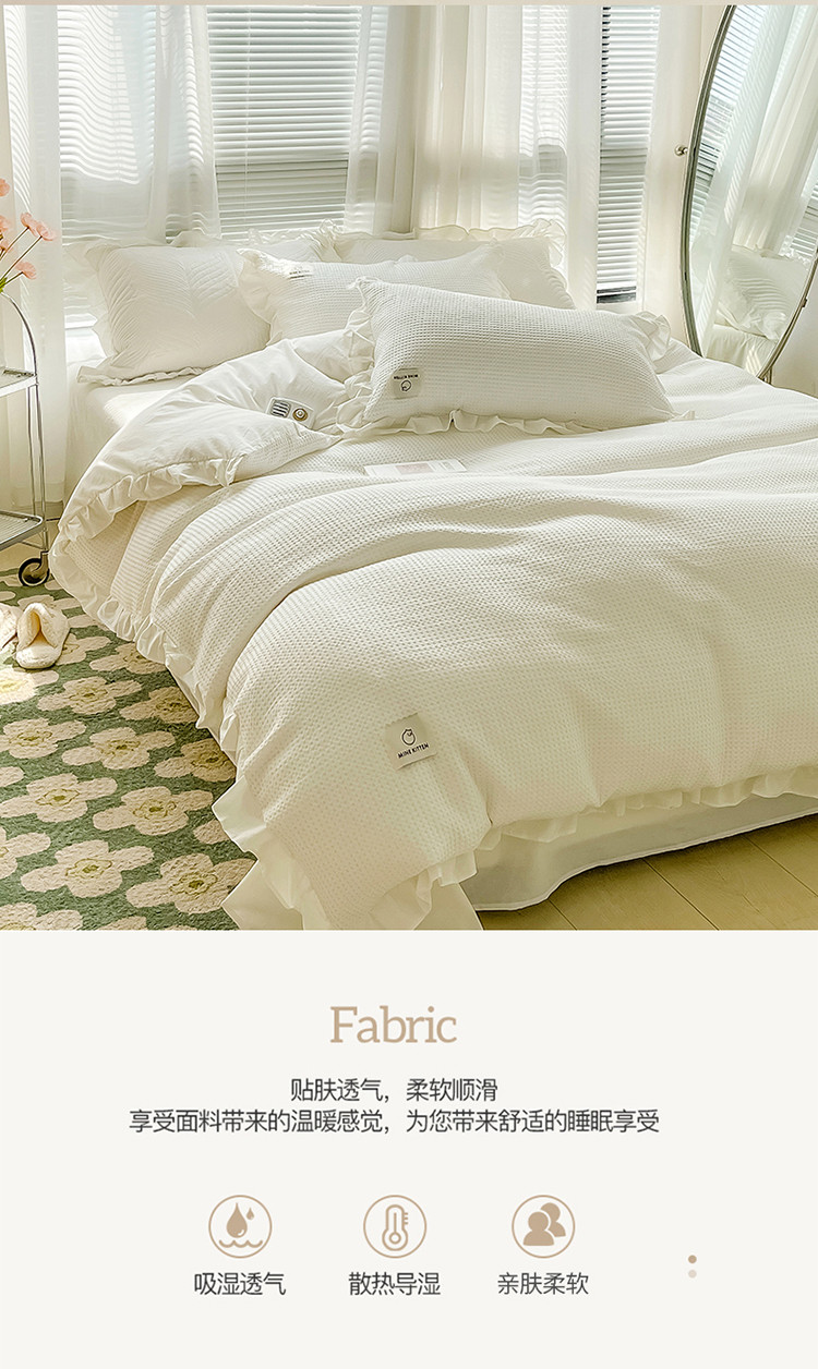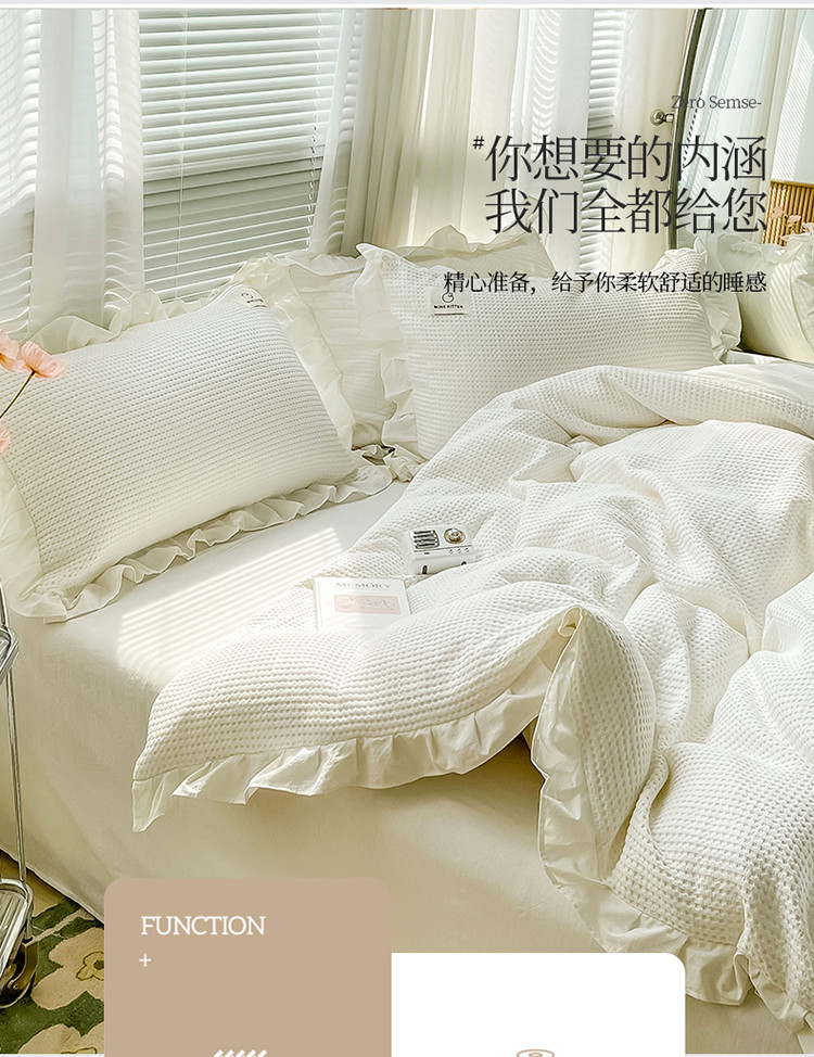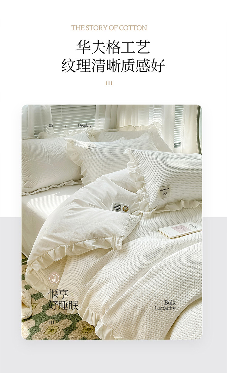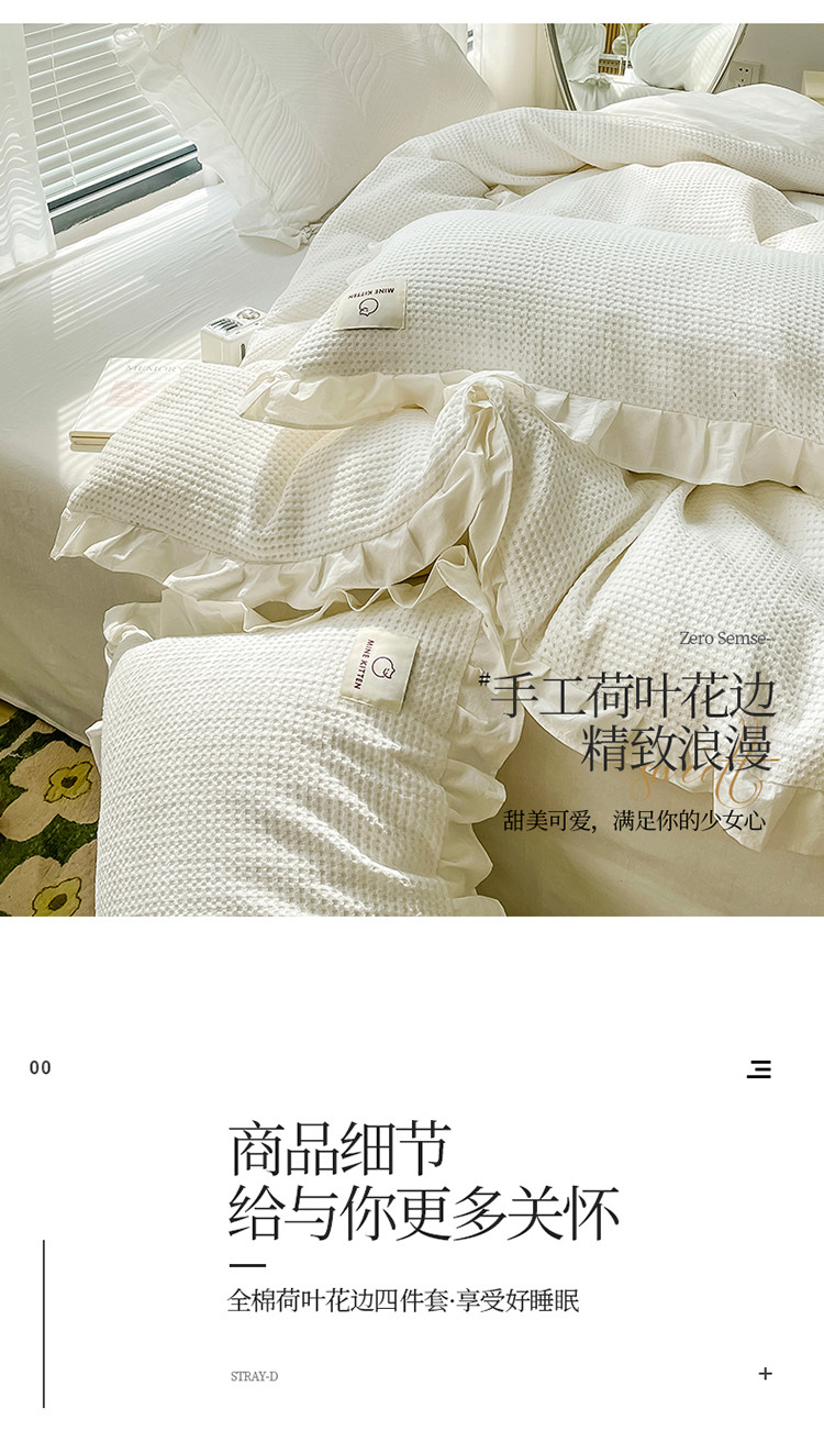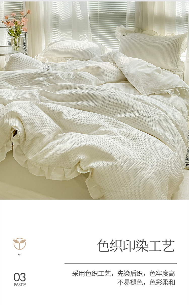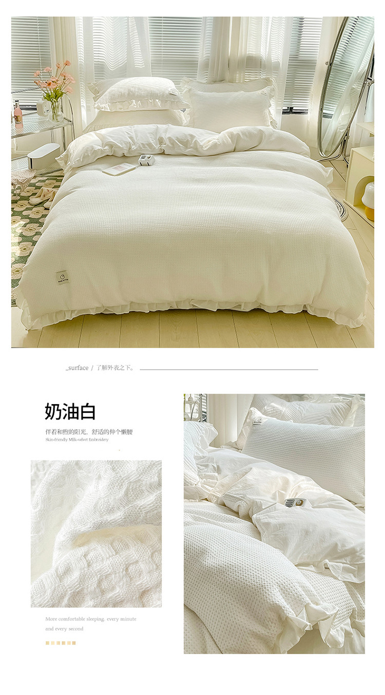 雅萱 2022新款全棉华夫格水洗棉四件套花边款 奶油白