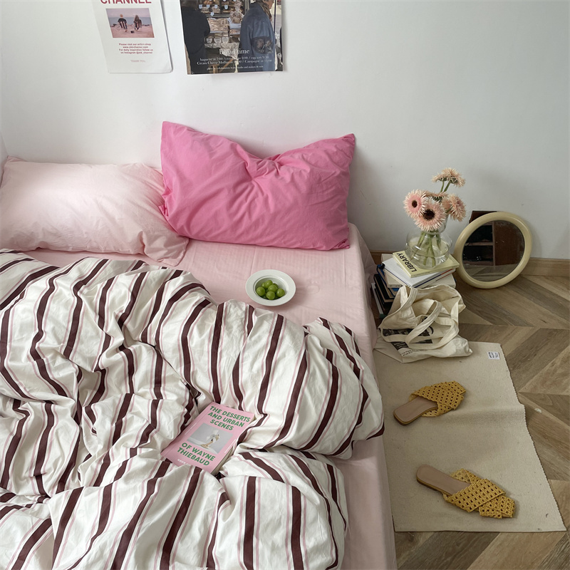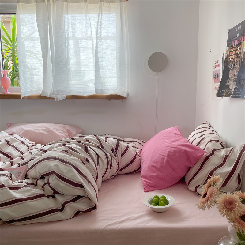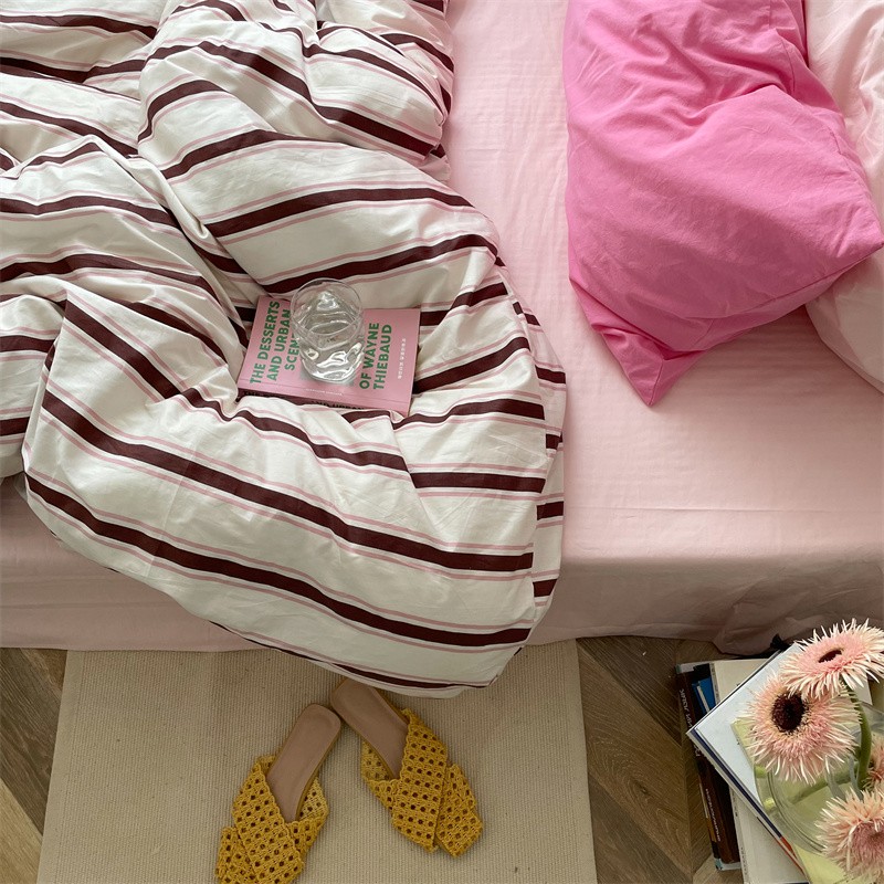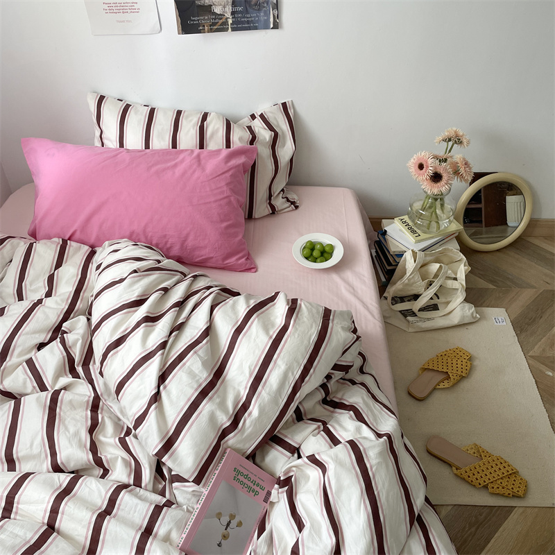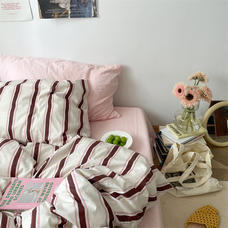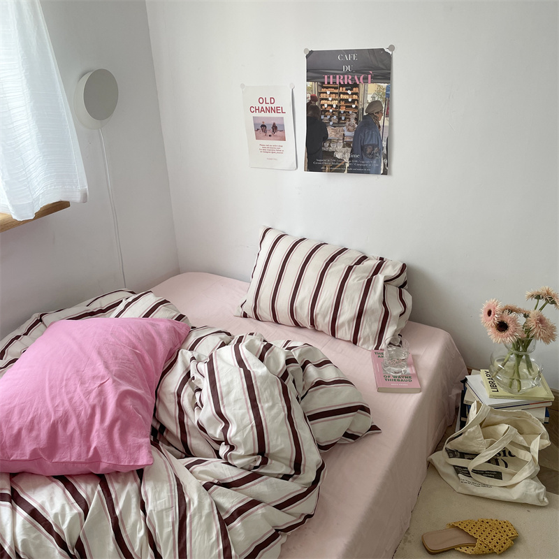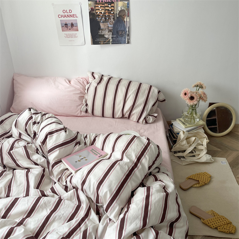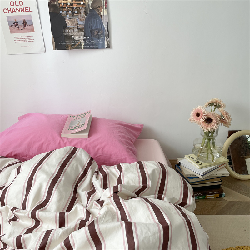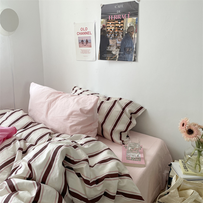 当前位置: 91家纺网 > 商品网购 > 床品套件 > 四件套 > 水洗棉四件套 > 恋恋三季 2024新款ins韩国粉色复古条纹四件套 棕粉象