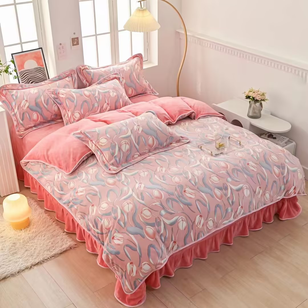 韩秀2024新款金貂牛奶法莱绒床裙款四件套加厚保暖8.5斤 郁金香
