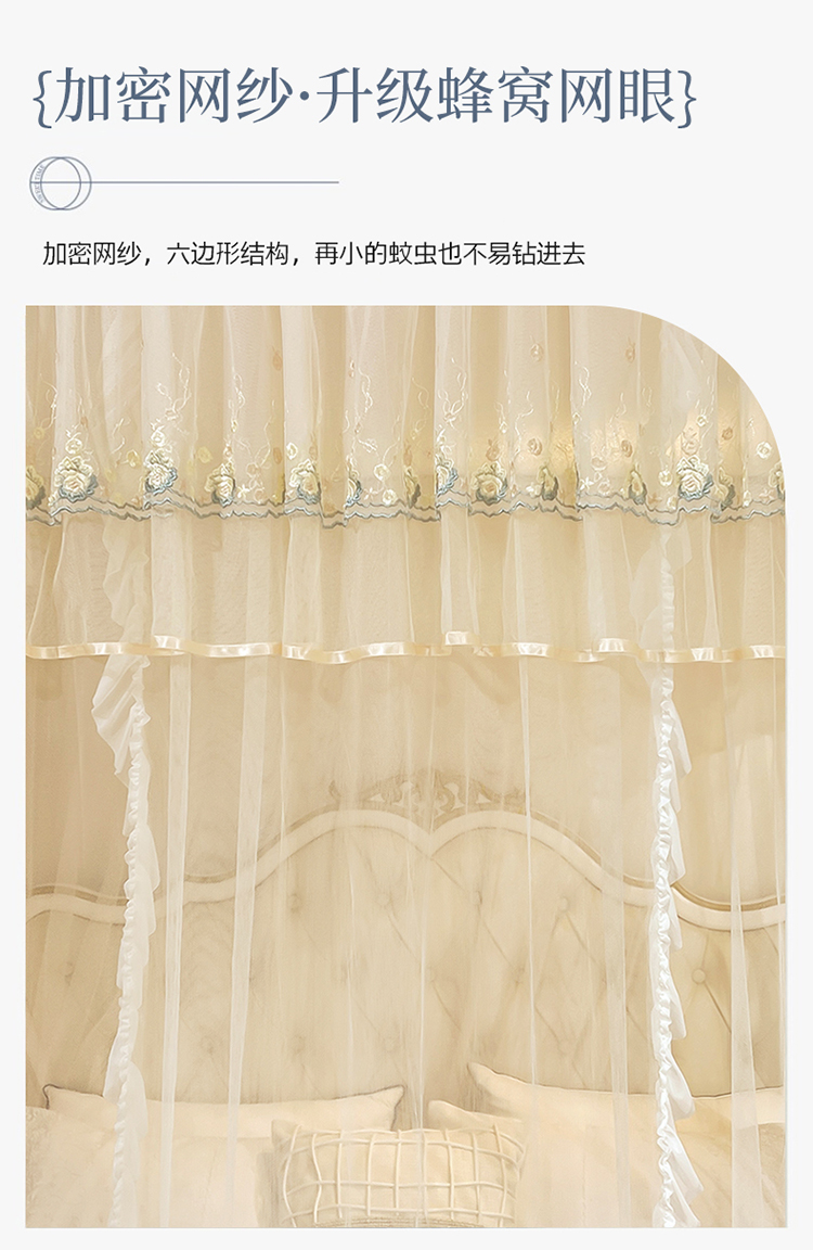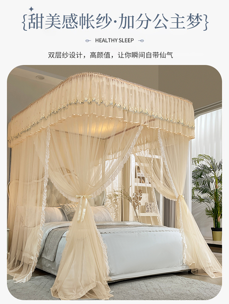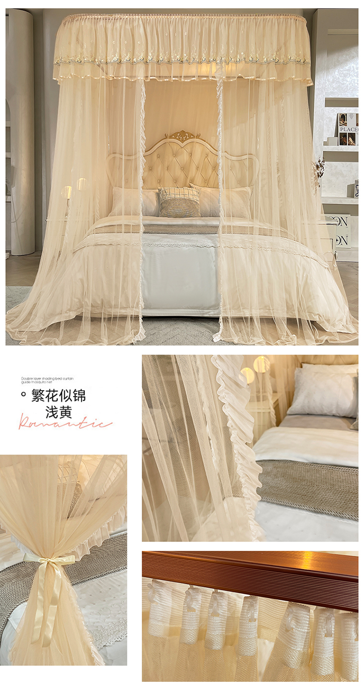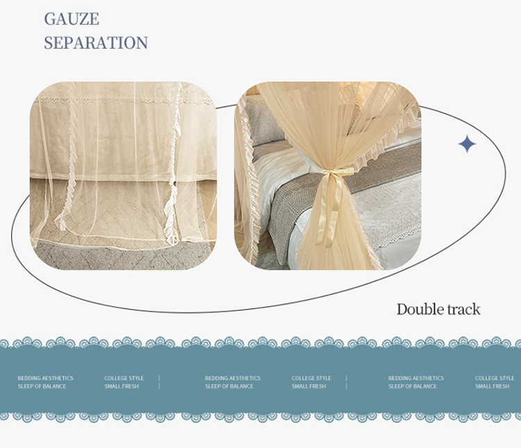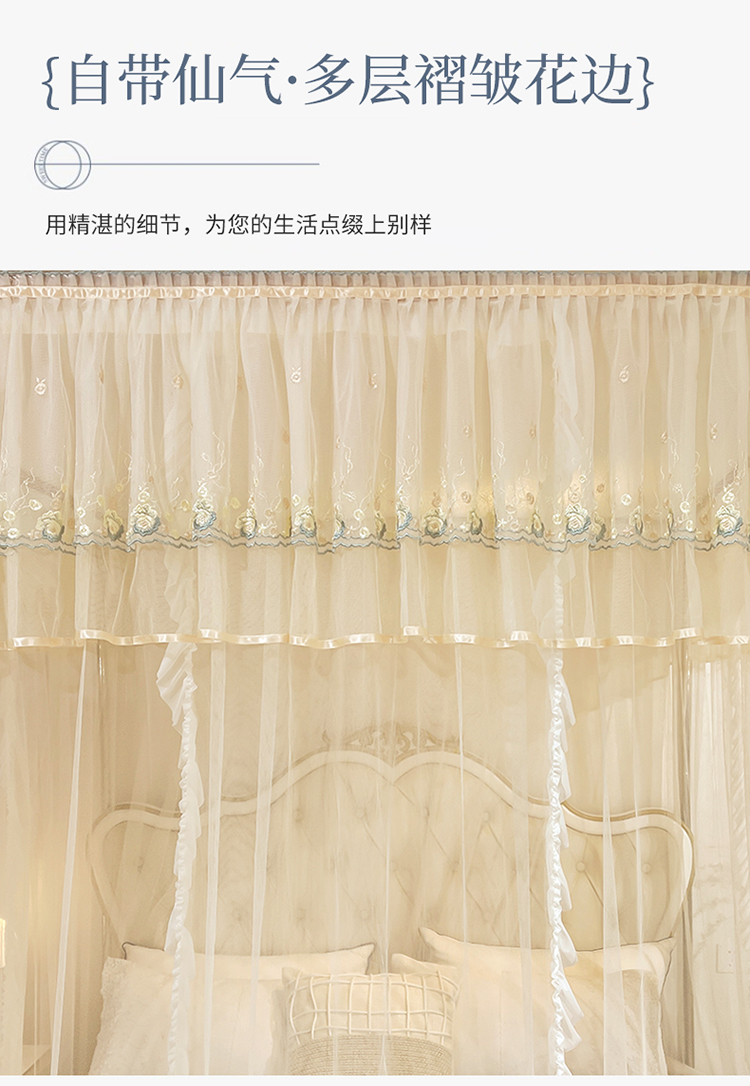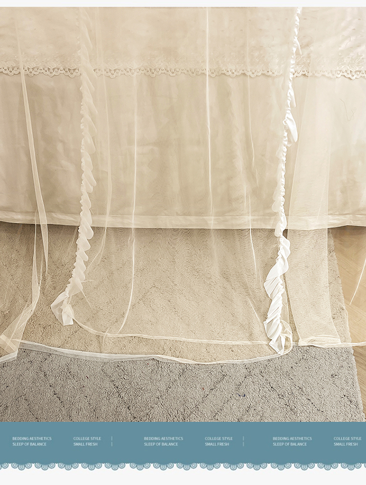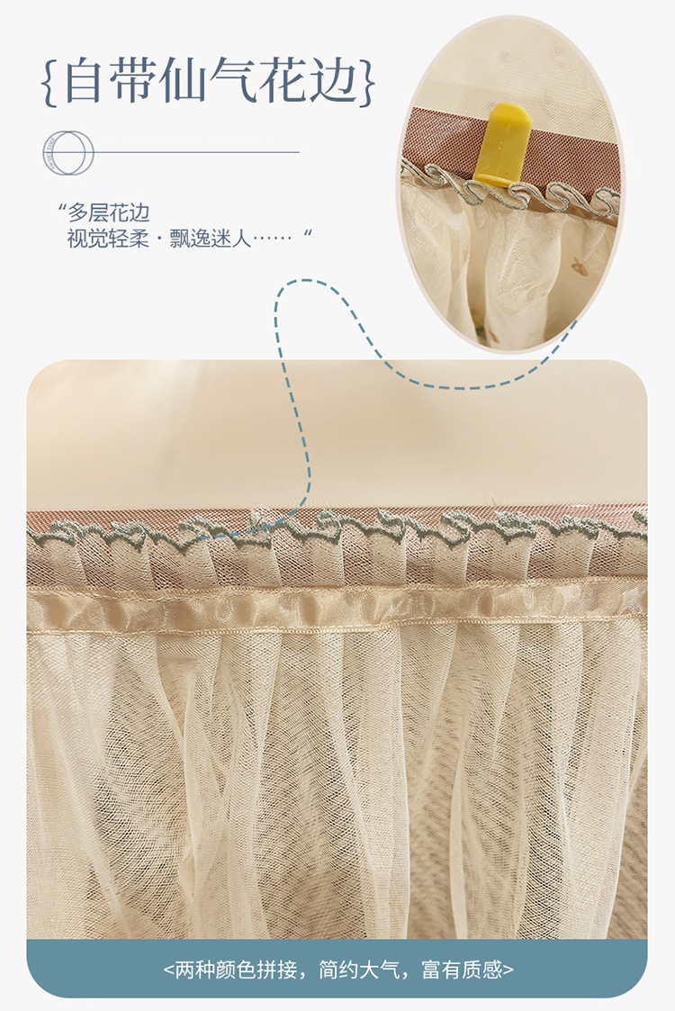 (总)2025新款双层花边全包围床笠款三开门蚊帐-幽梦星辰,奶黄,藕玉,颜淡蓝