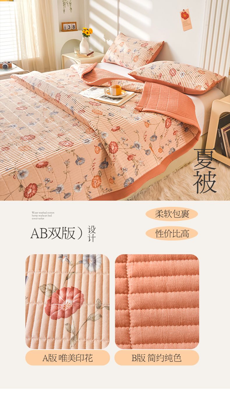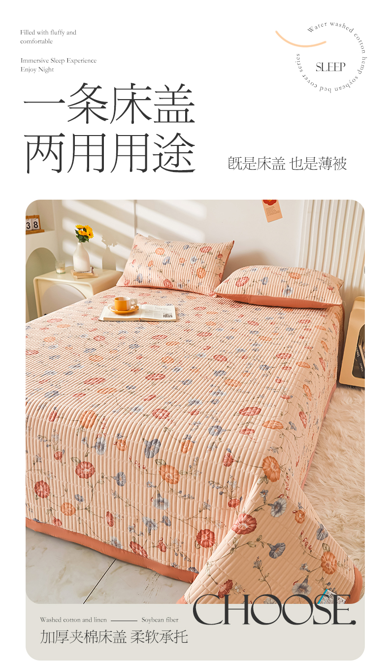 水洗棉麻床盖大豆纤维夹棉加厚宿舍铺盖两用床单床裙保护垫牵牛花