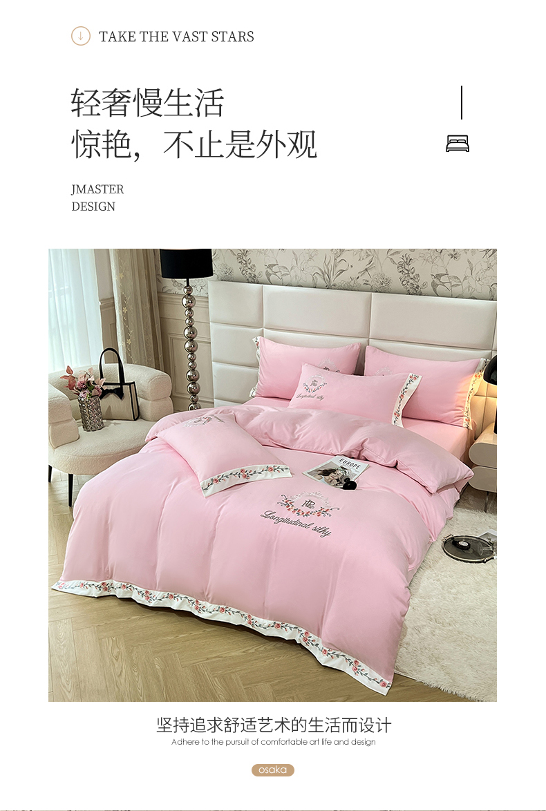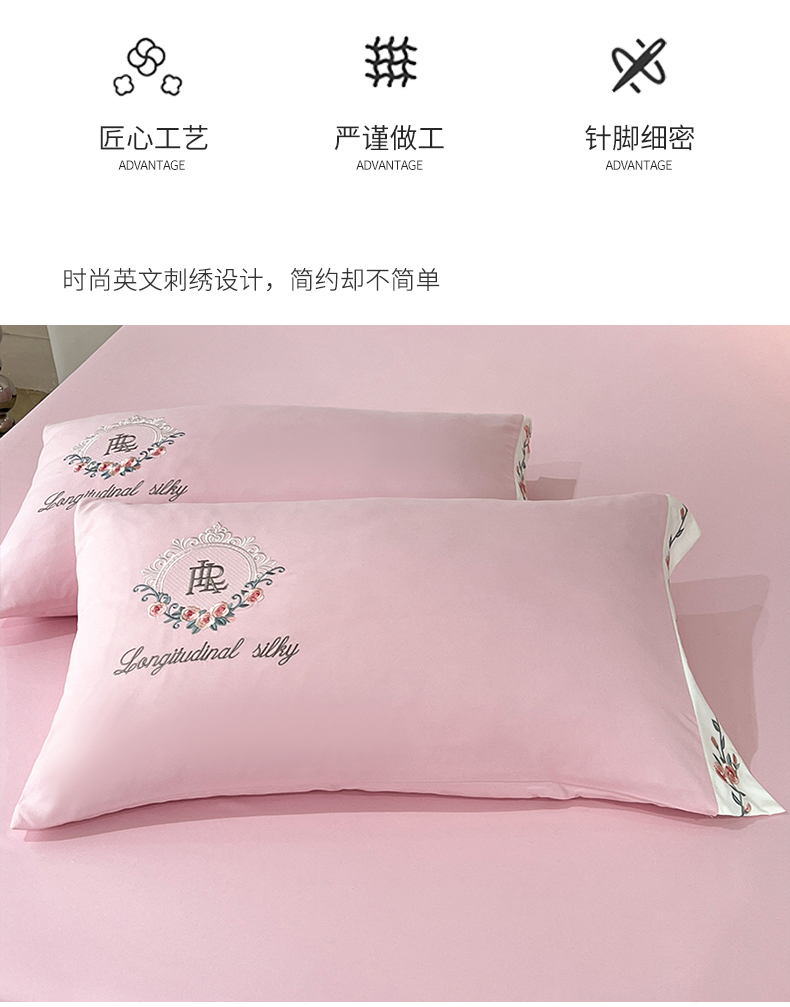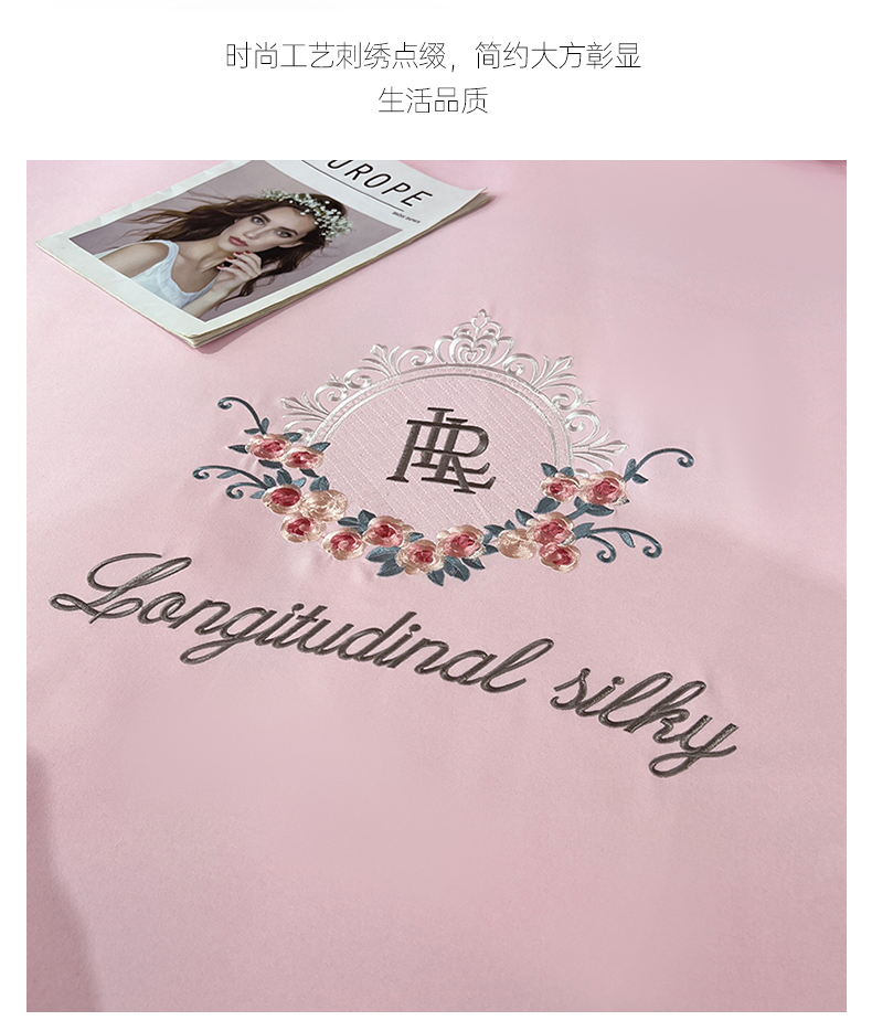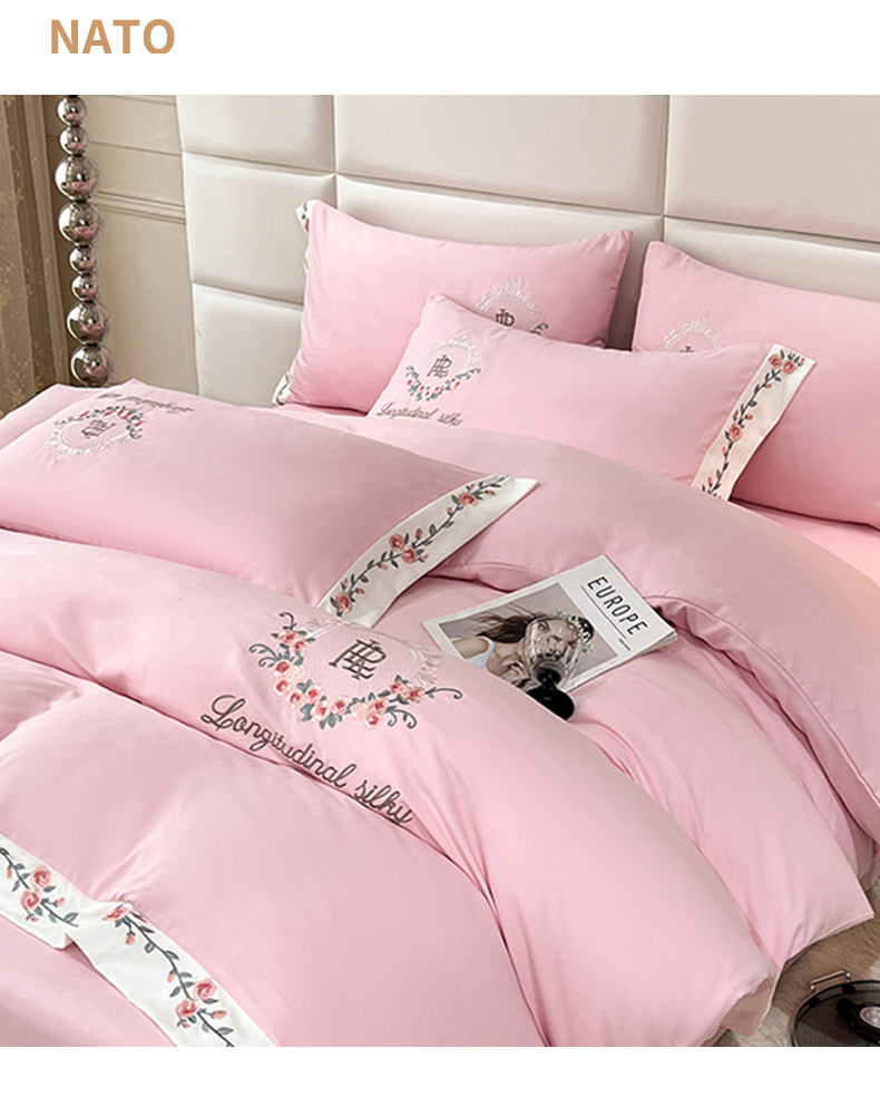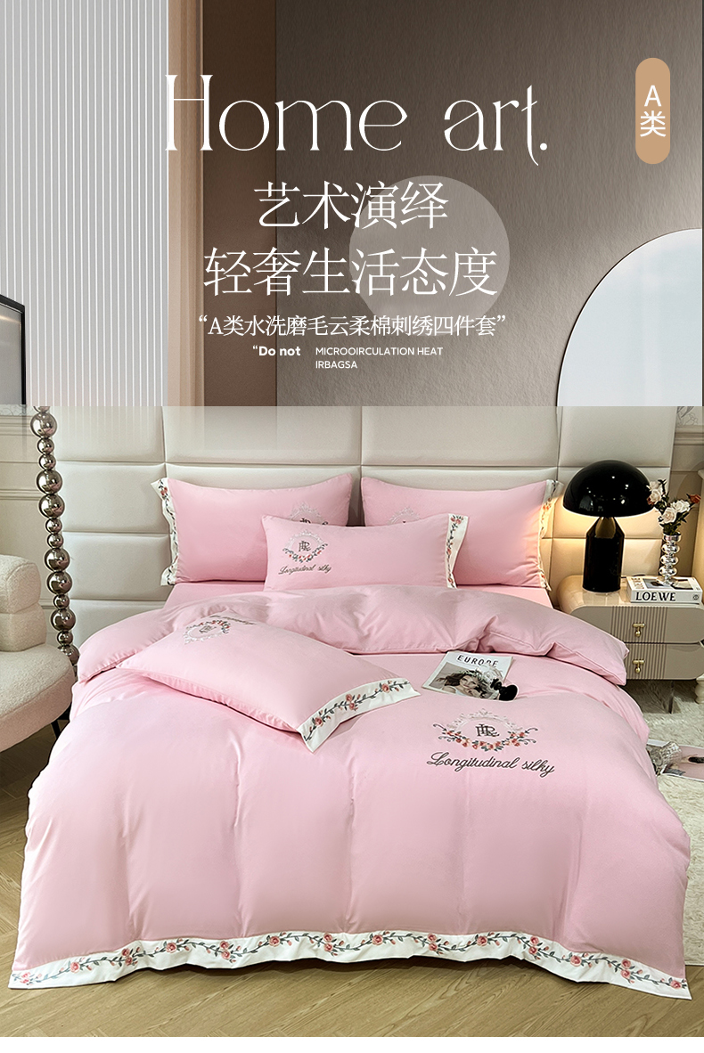 商品名称:易辰美 2024新款A类高克重水洗磨毛云柔棉刺绣四件套 樱花粉
