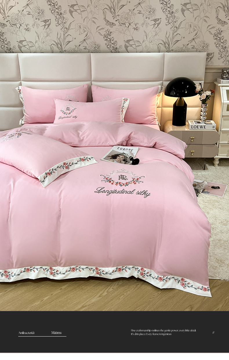 易辰美 2024新款A类高克重水洗磨毛云柔棉刺绣四件套 樱花粉