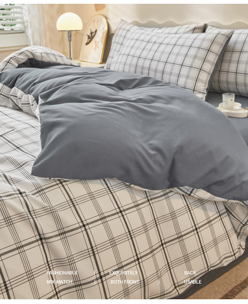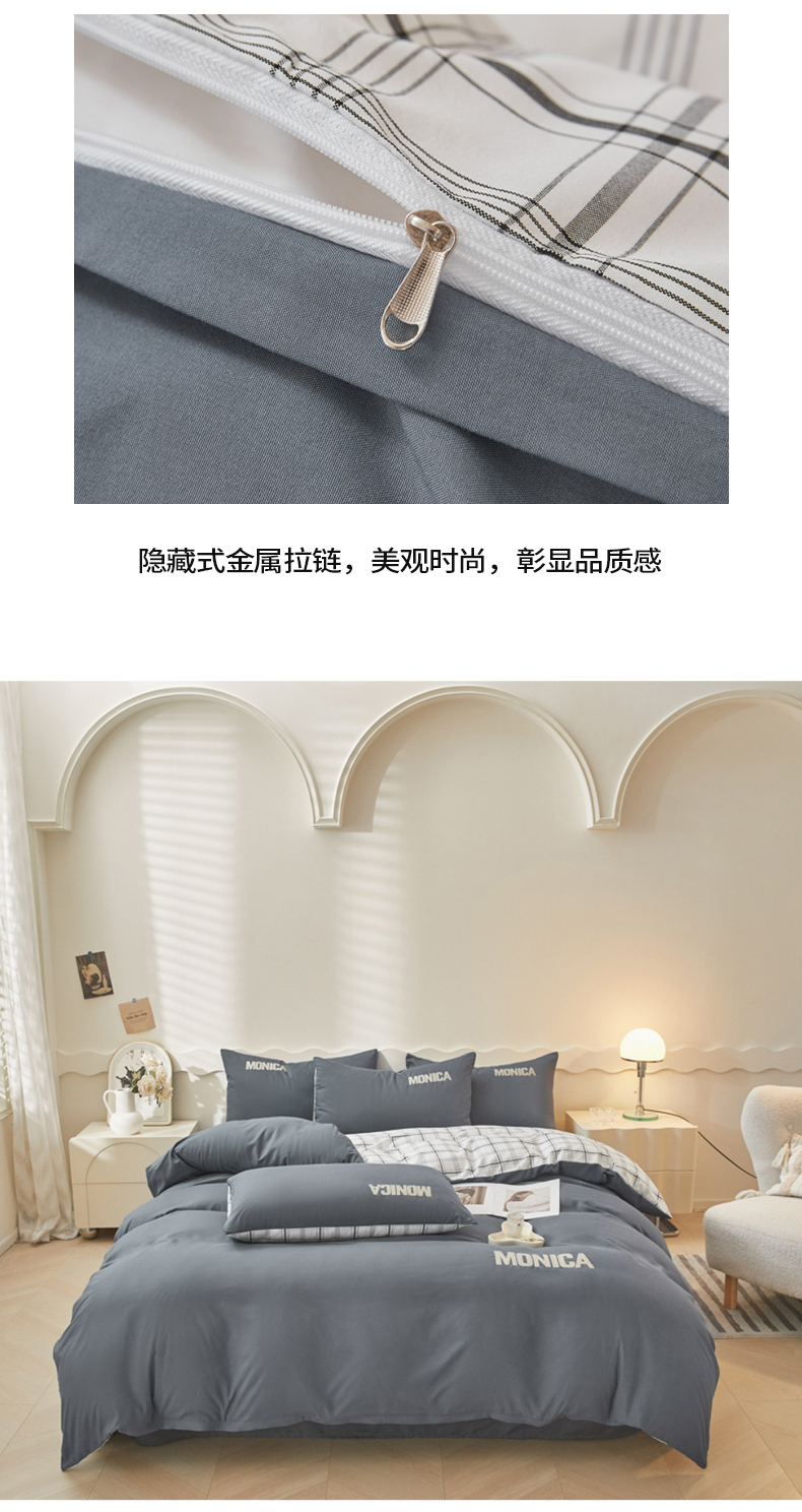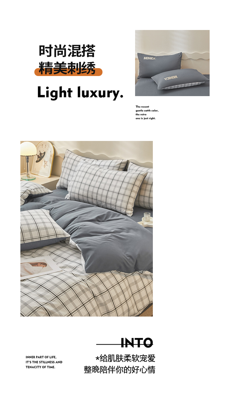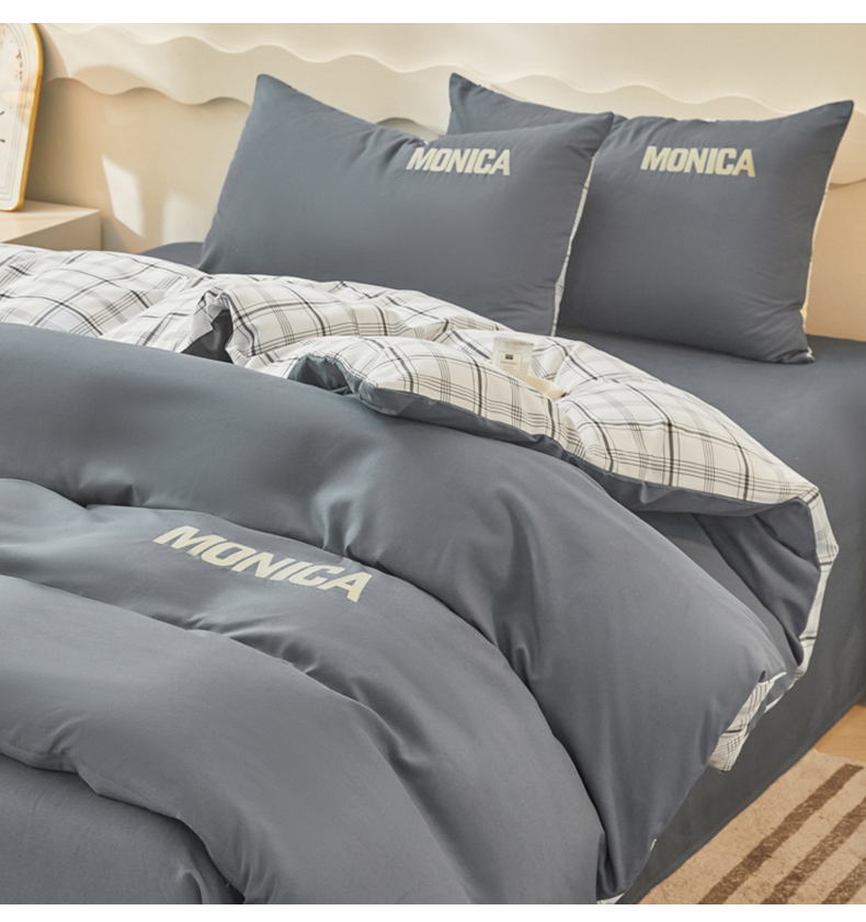 欣晴家纺 2023新品色织水洗棉磨毛刺绣四件套 灰白格
