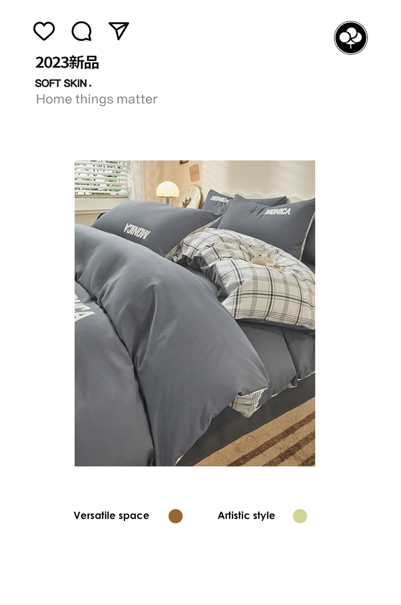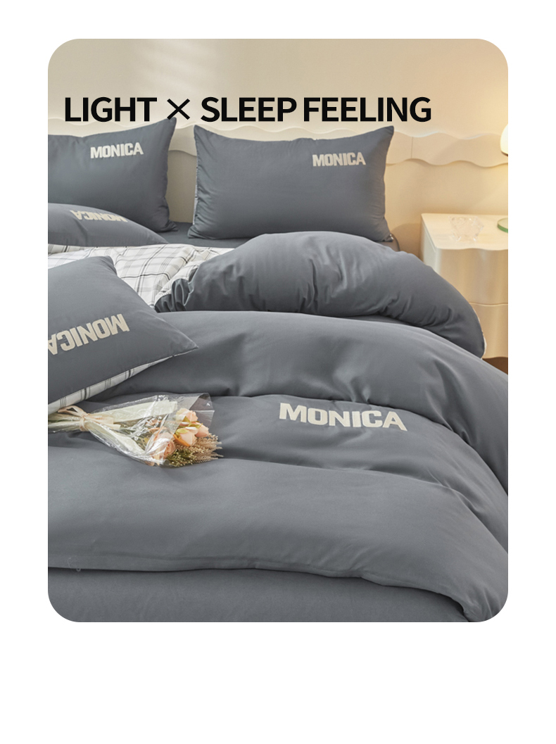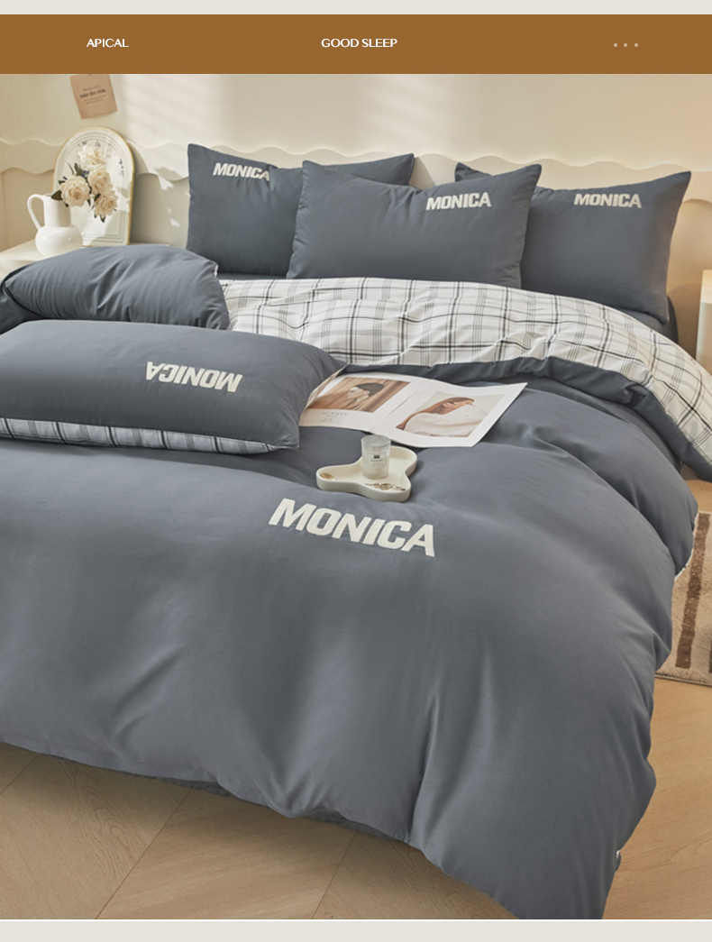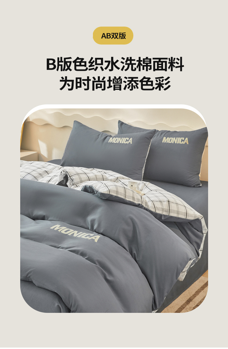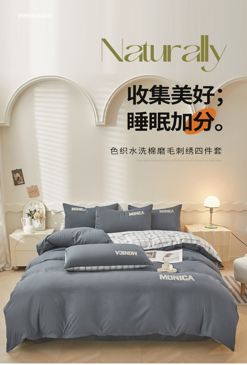 欣晴家纺 2023新品色织水洗棉磨毛刺绣四件套 灰白格