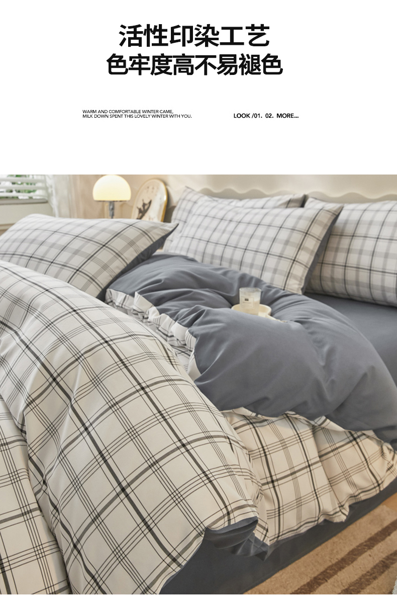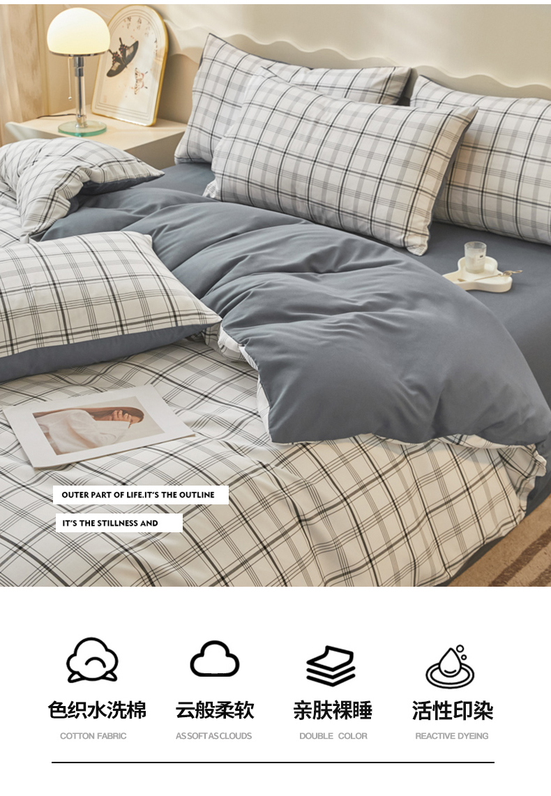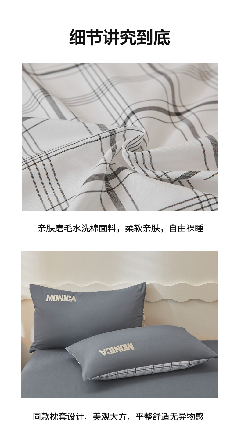 商品名称:欣晴家纺 2023新品色织水洗棉磨毛刺绣四件套 灰白格