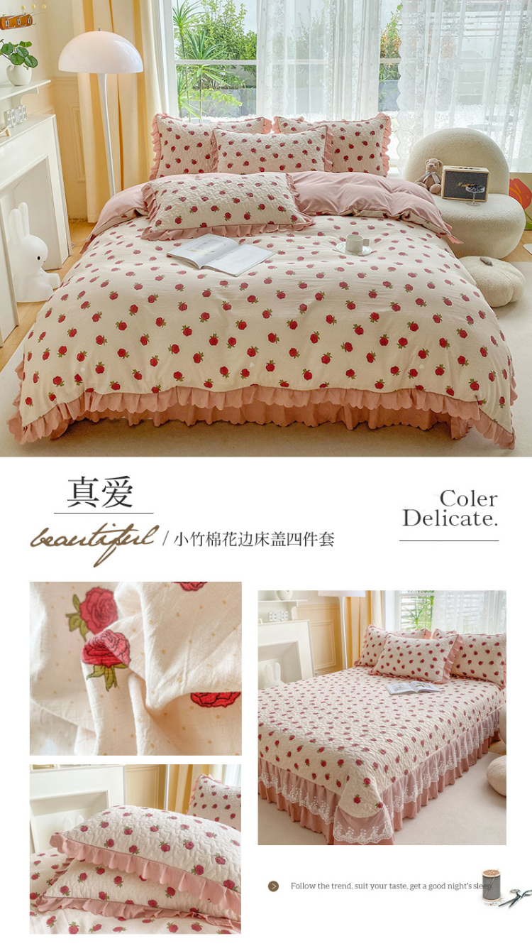 (总)艺慕 2025新款双层纱水洗棉麻蕾丝花边床盖,春意,粉色玫瑰,红豆,青花瓷,太阳花绿,屋顶花园,夕颜,夏日仙草,心动绿,萌兔子,花丛兔