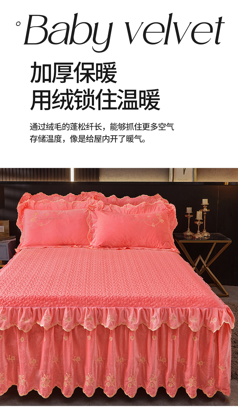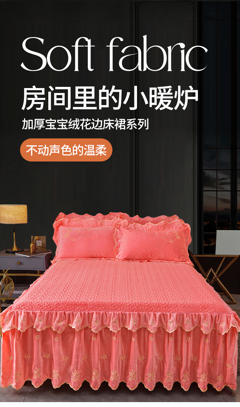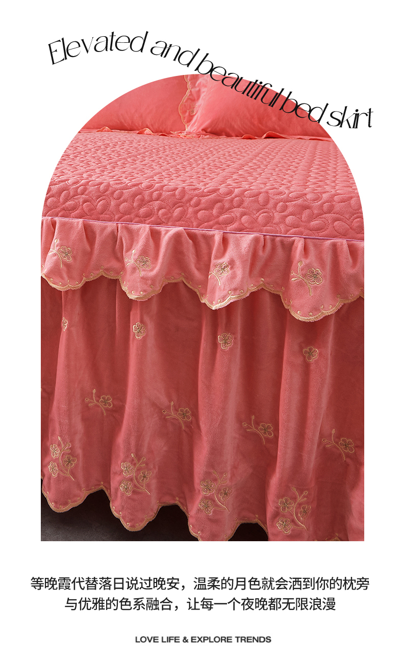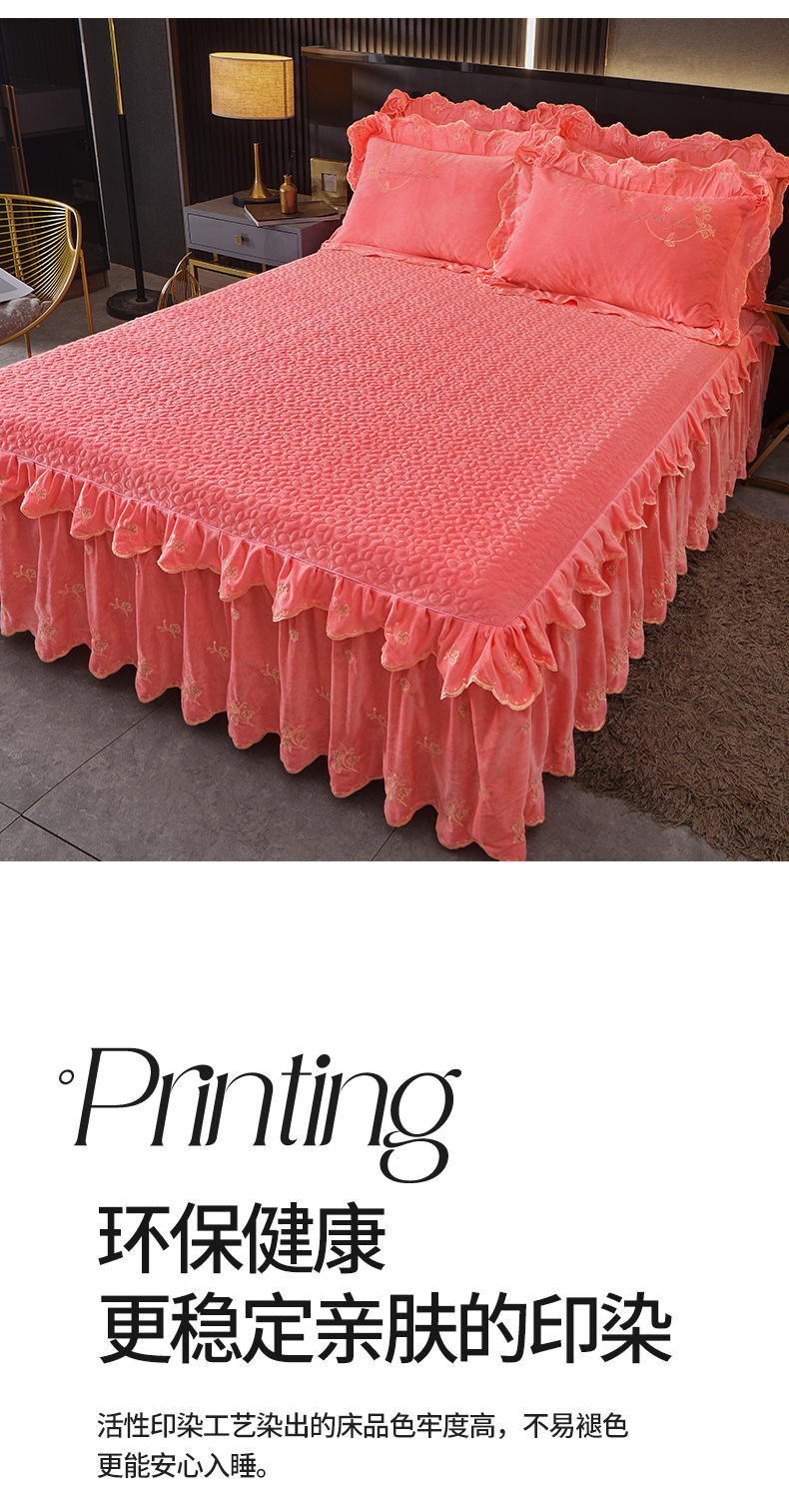 (总)恒爱 2022秋冬水晶绒翩翩花舞夹棉单床裙,大红色,豆沙红,橄榄绿,公主粉,桔色,咖啡色,孔雀绿,拉菲红,罗兰紫,玫红色,美人玉,米白色,米驼色,抹茶绿,浅灰色,紫色