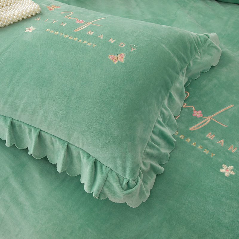 商品名称:优姿家纺 2024新品8.5斤德芙绒韩版床裙绣花保暖四件套 今生有约浅绿