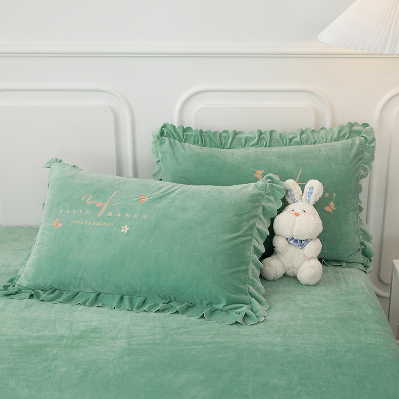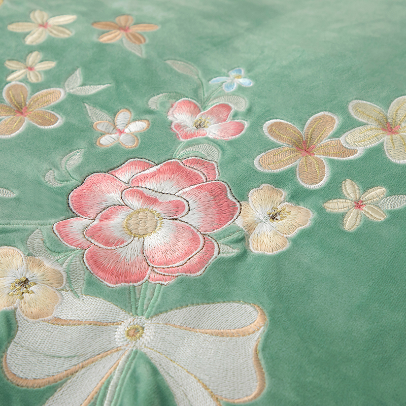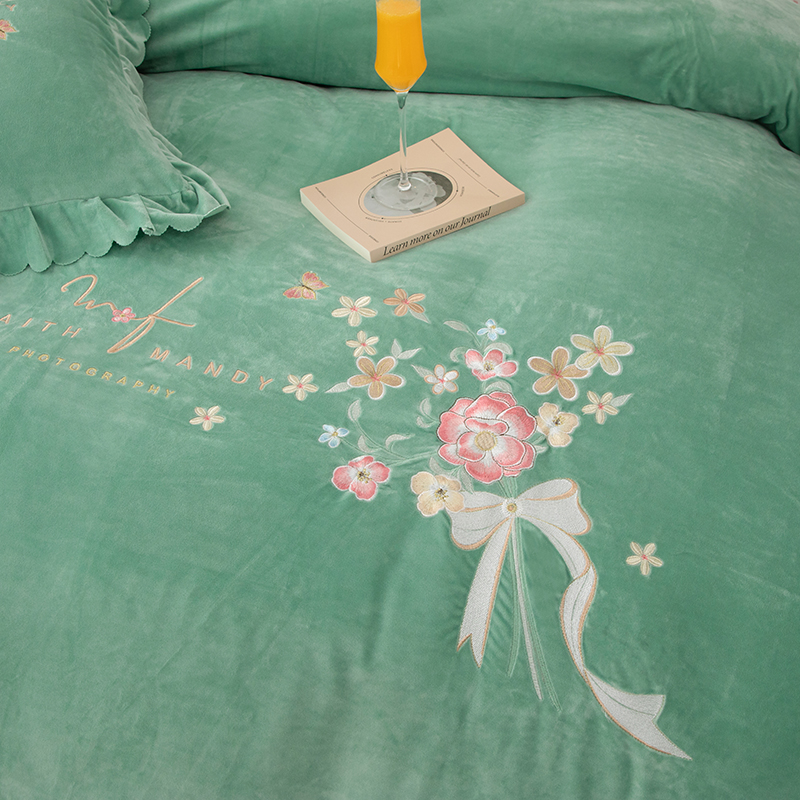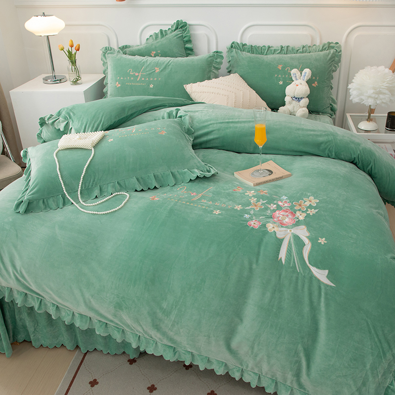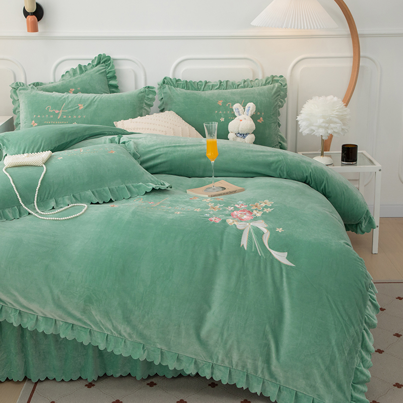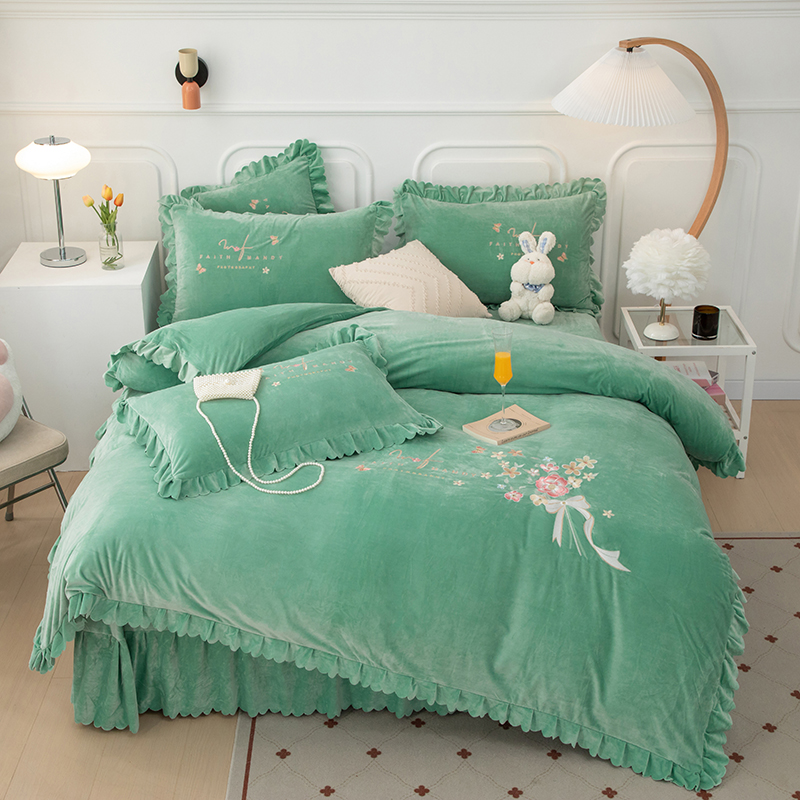 优姿家纺 2024新品8.5斤德芙绒韩版床裙绣花保暖四件套 今生有约浅绿