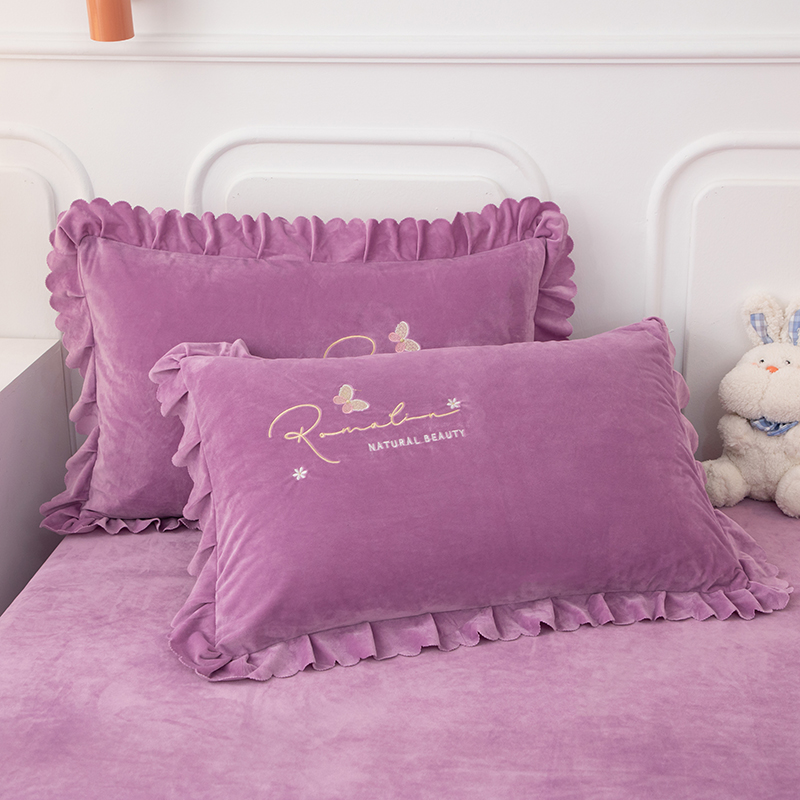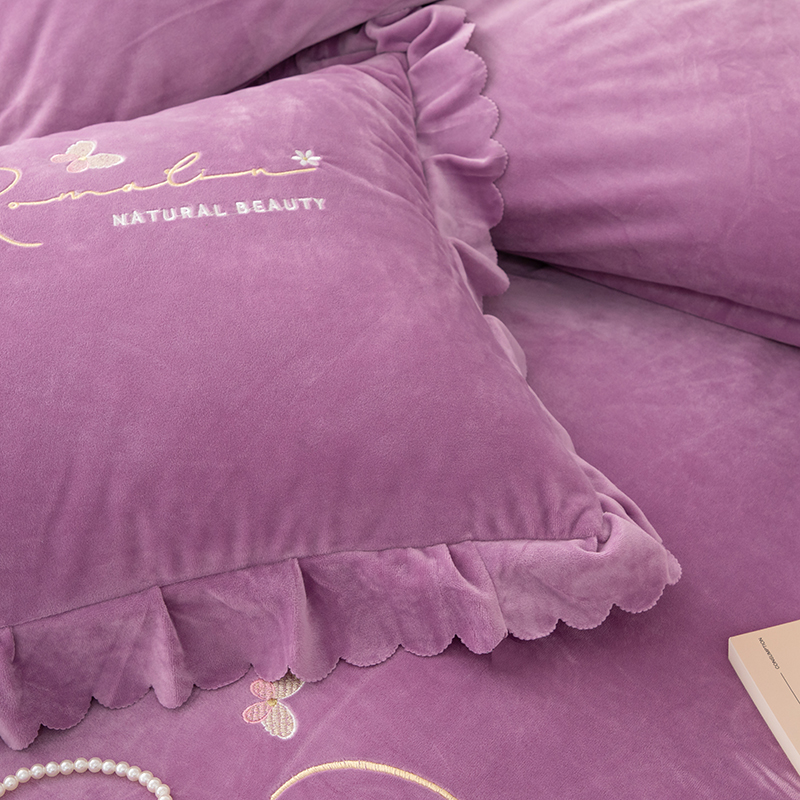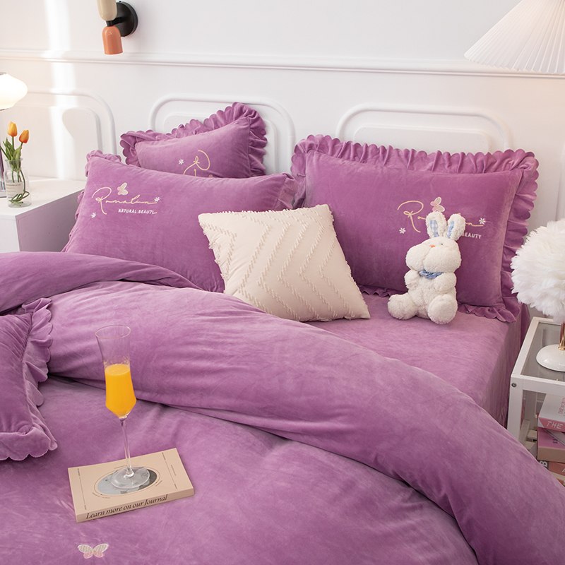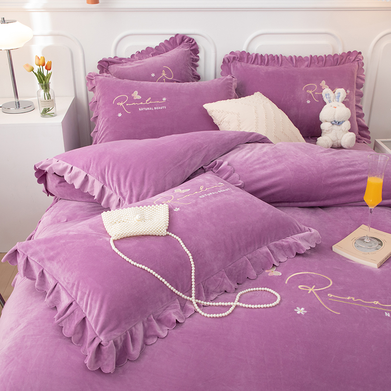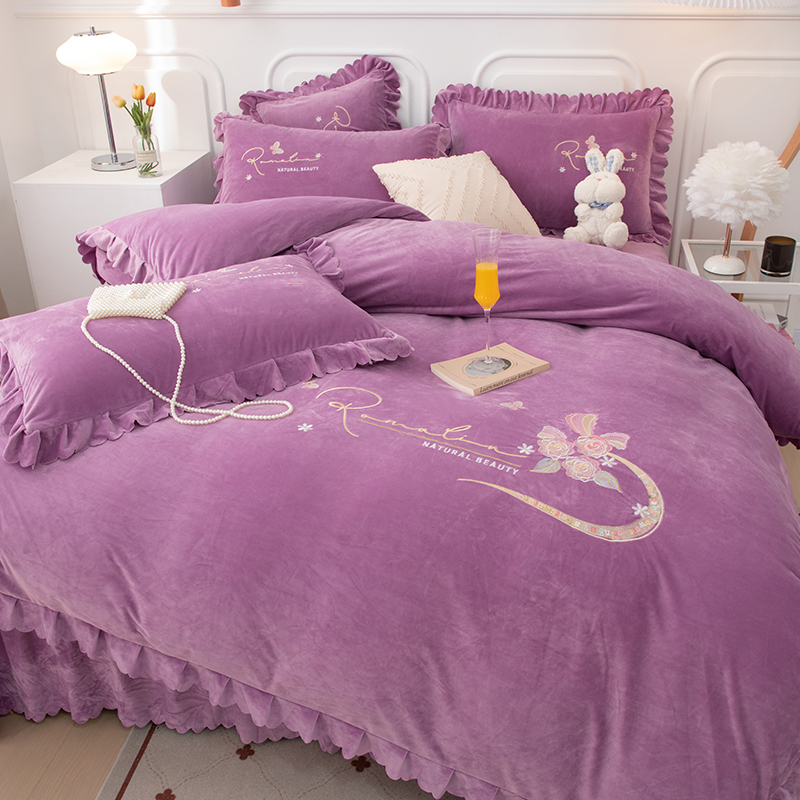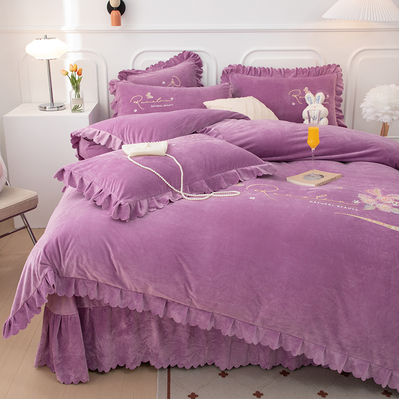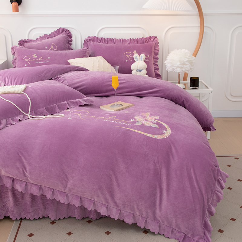 优姿家纺 2024新品8.5斤德芙绒韩版床裙绣花保暖四件套 时尚玫瑰紫色