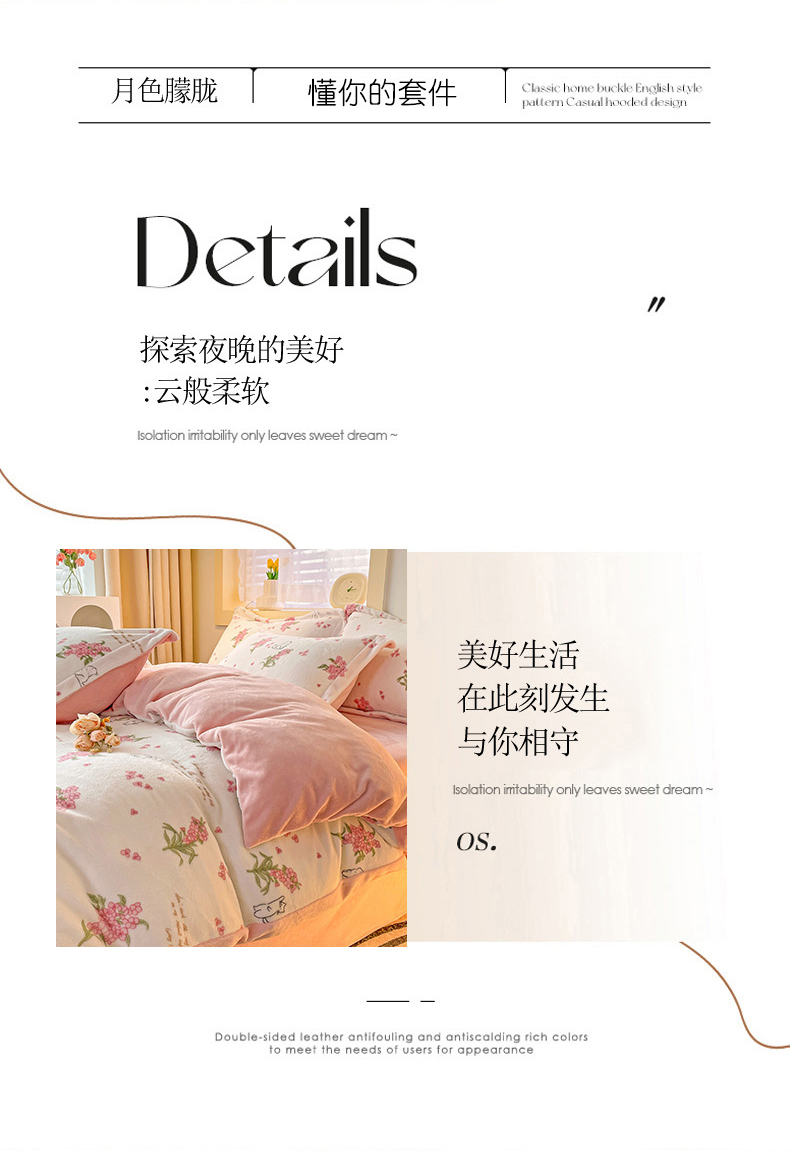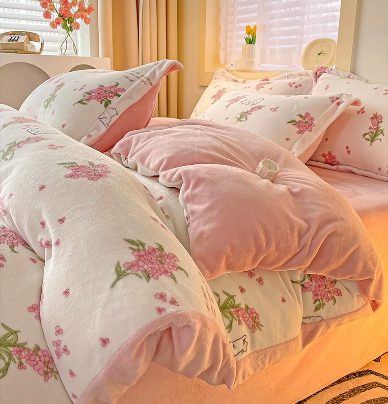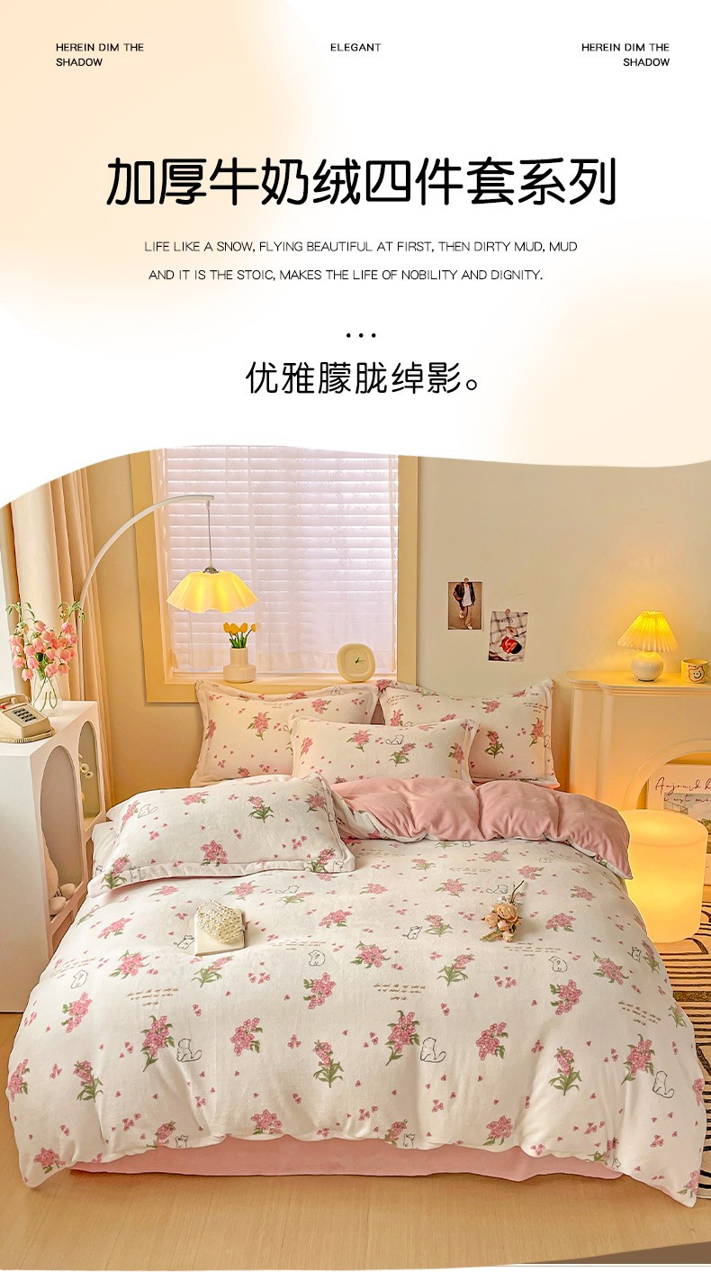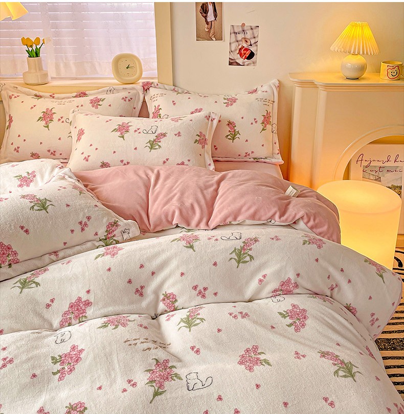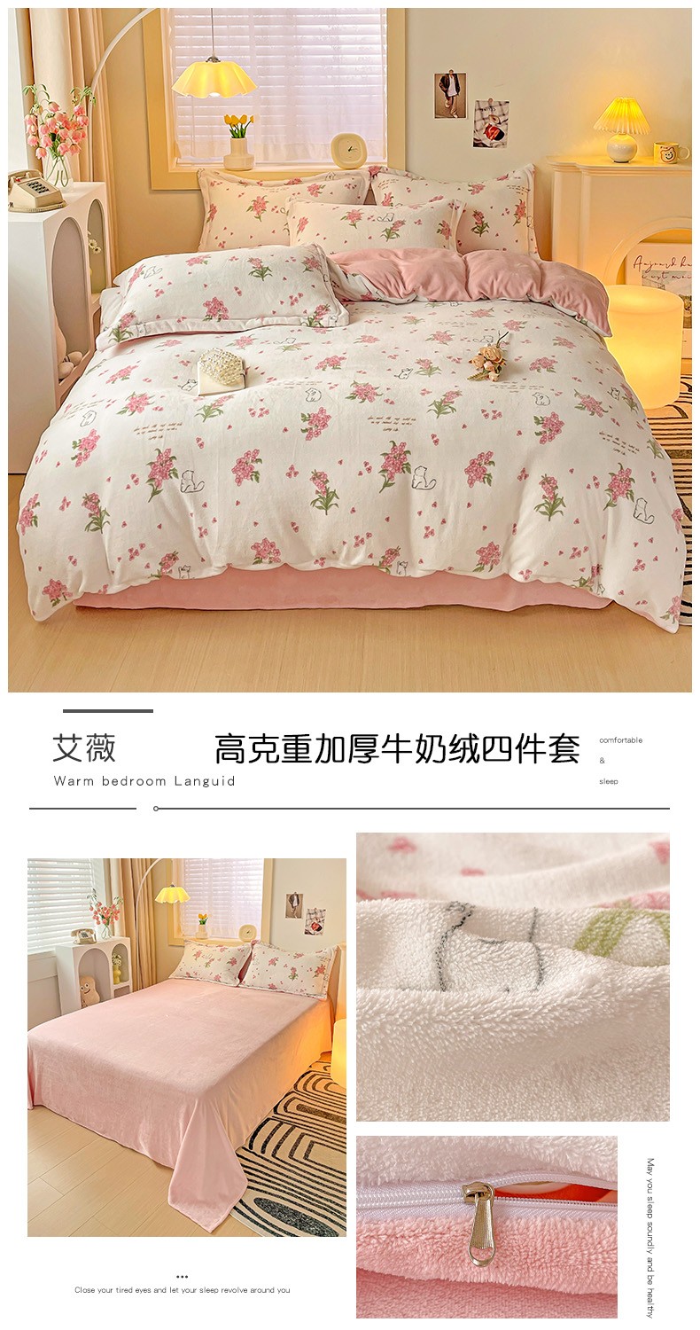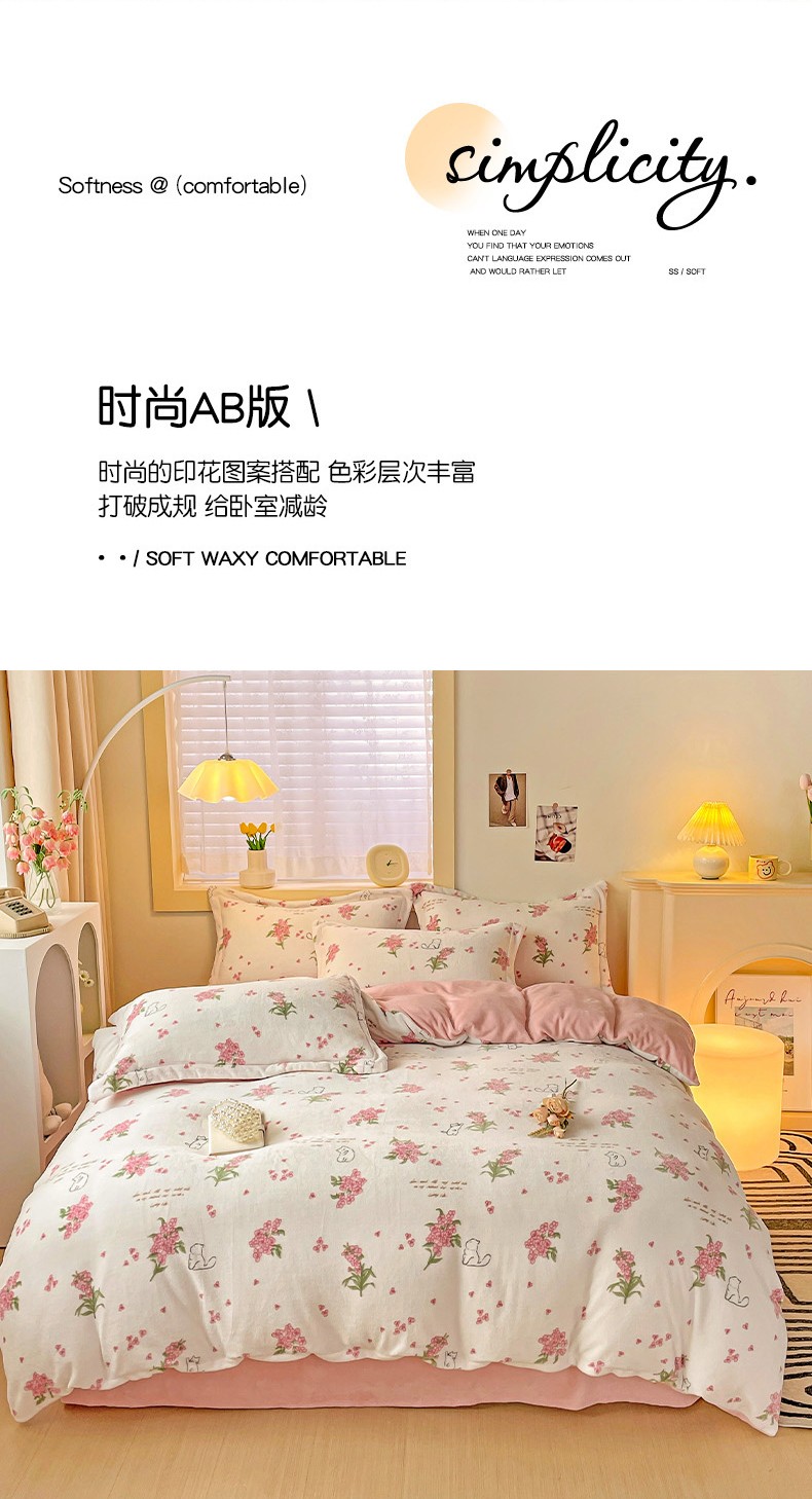 当前位置: 91家纺网 > 商品网购 > 床品套件 > 四件套 > 牛奶绒四件套 > 畅畅家纺 2023新款活性印花小清新AB版加厚高克重法莱绒牛奶绒四件套 艾薇