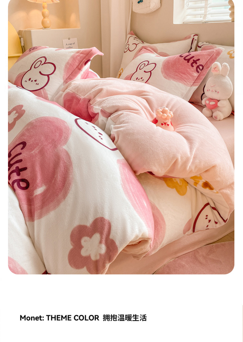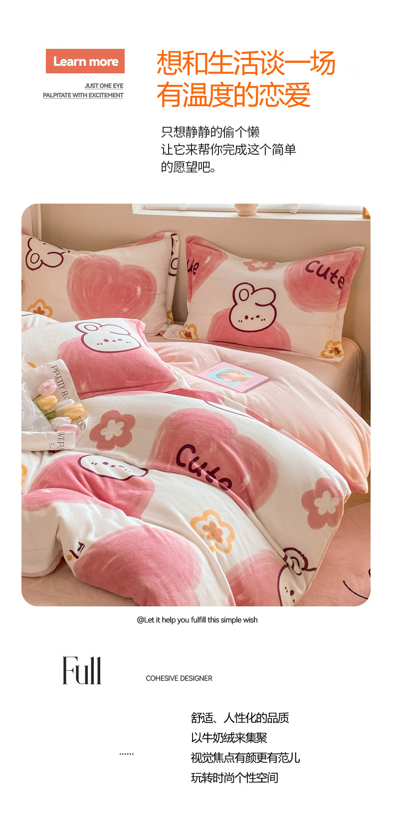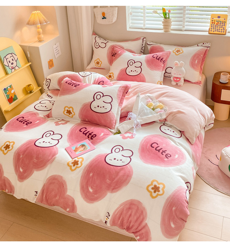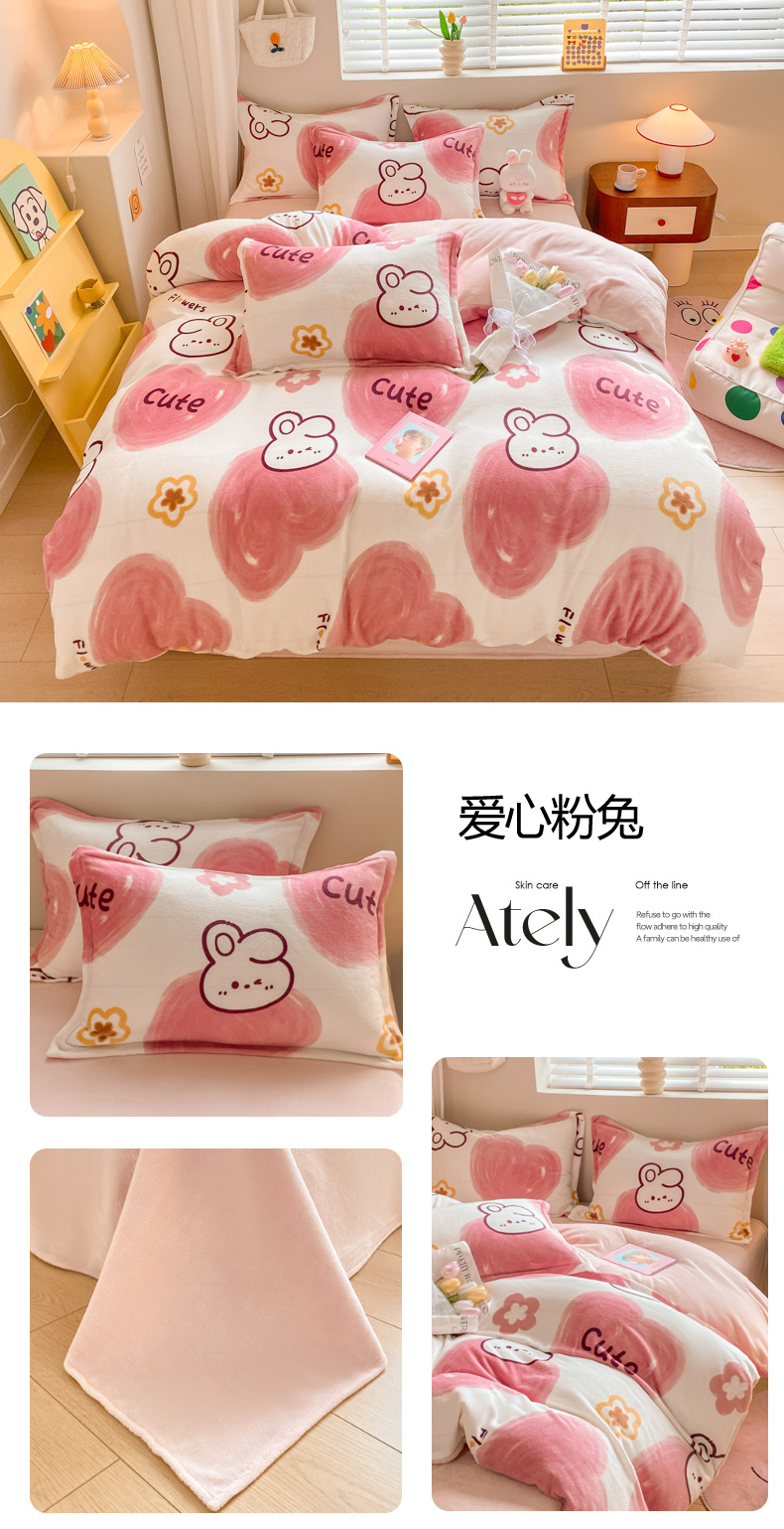 当前位置: 91家纺网 > 商品网购 > 床品套件 > 四件套 > 牛奶绒四件套 > 沐慕 2024新款牛奶绒加厚保暖卡通印花四件套 爱心粉兔