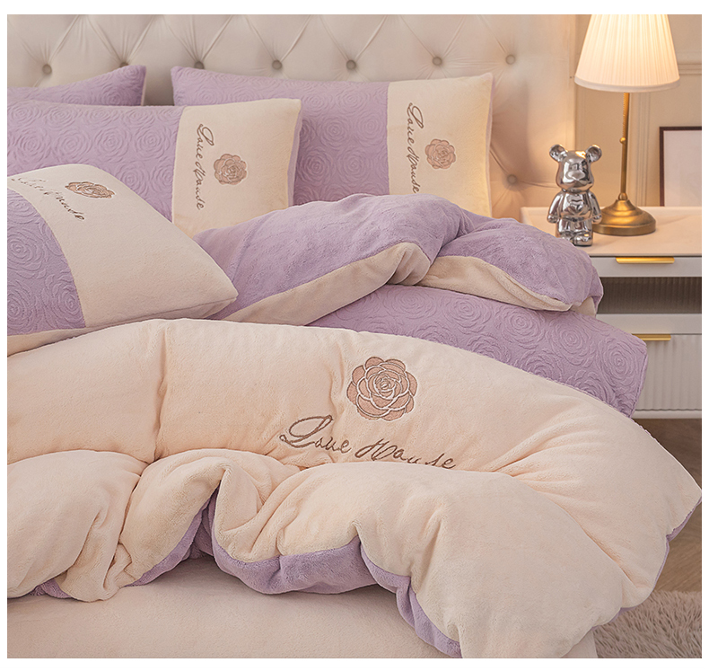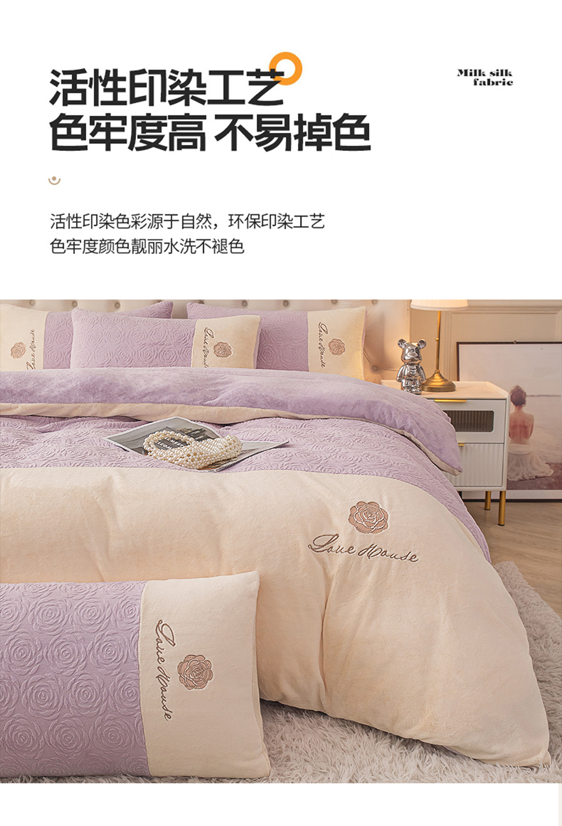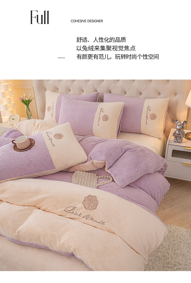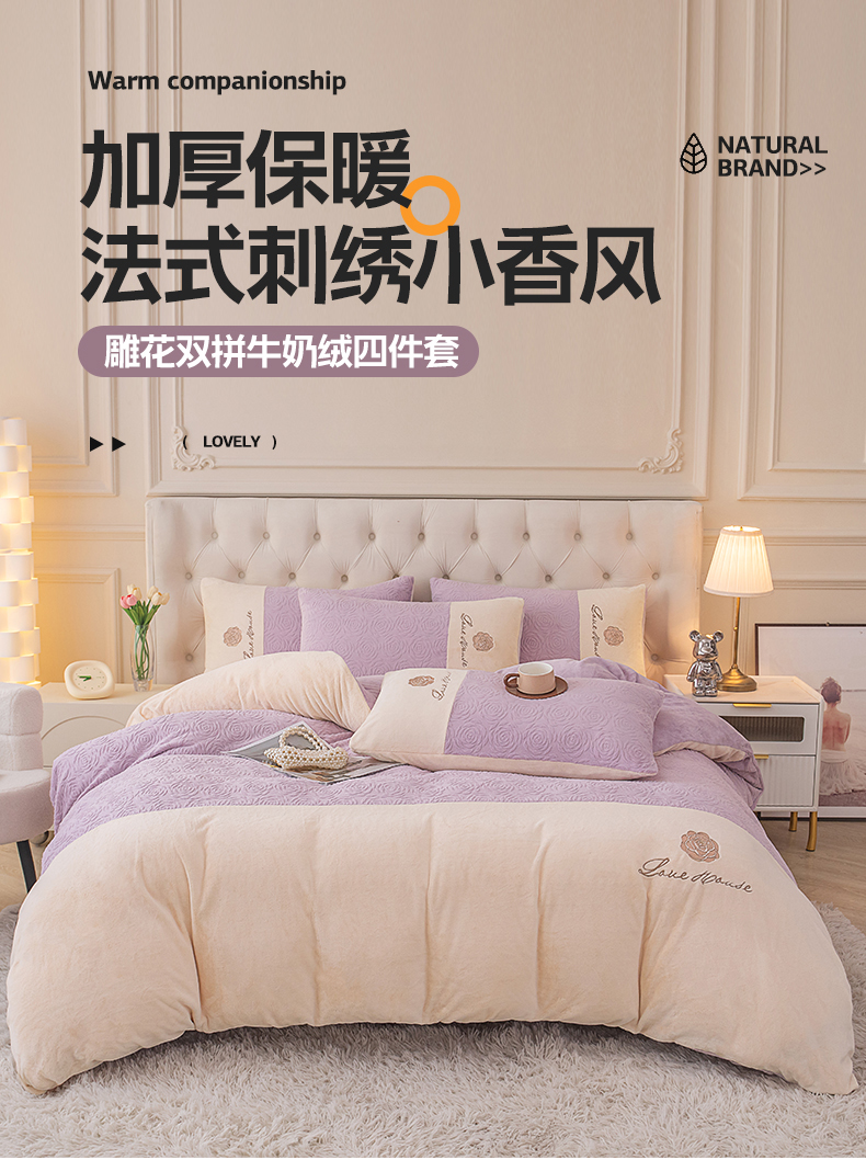 商品名称:好阁 2023新款法式刺绣小香风雕花双拼牛奶绒四件套 微紫+香黛玉