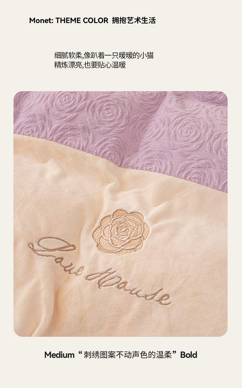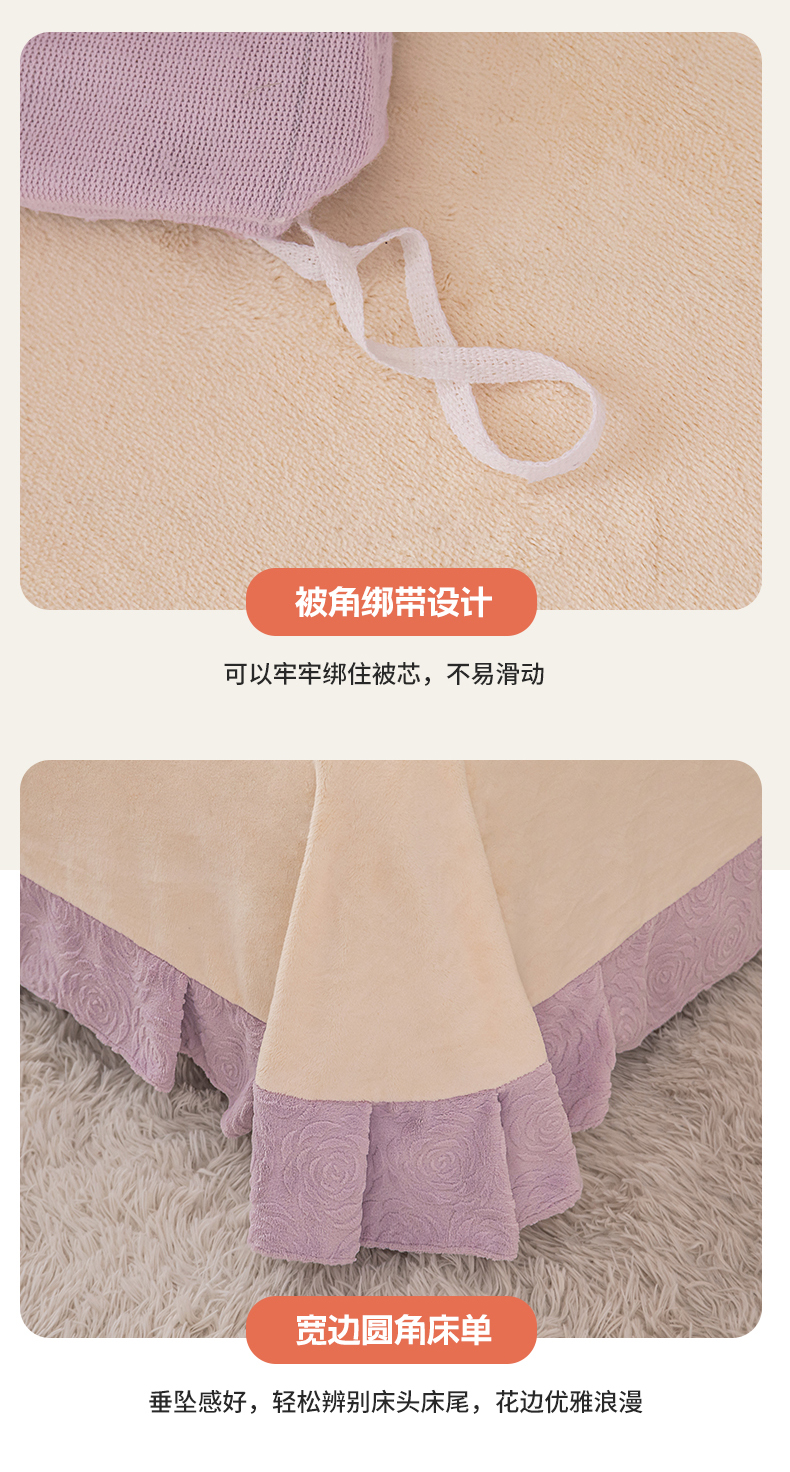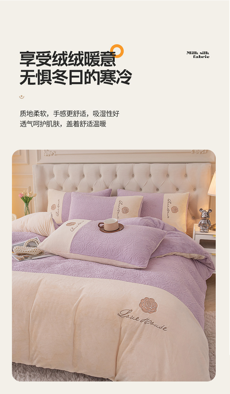商品名称:好阁 2023新款法式刺绣小香风雕花双拼牛奶绒四件套 微紫+香黛玉