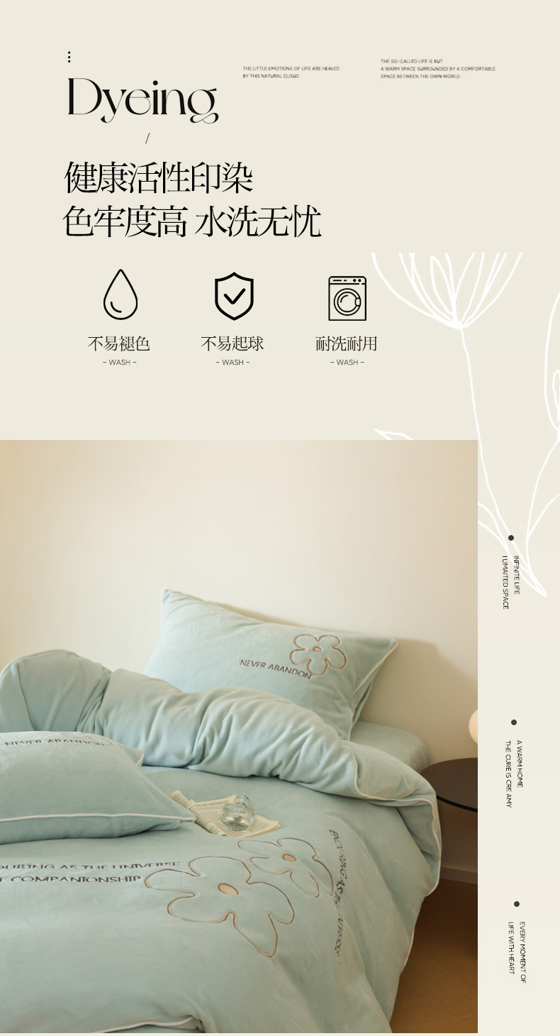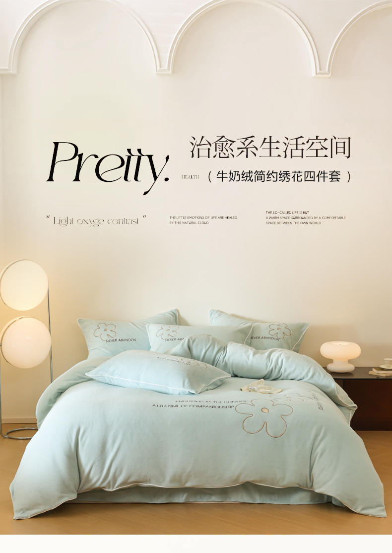 (总)万盛家纺 2025新款牛奶绒简约绣花四件套,艾草绿,豆沙色,高级灰,奶油黄,香草白,杏仁色,悠悠粉