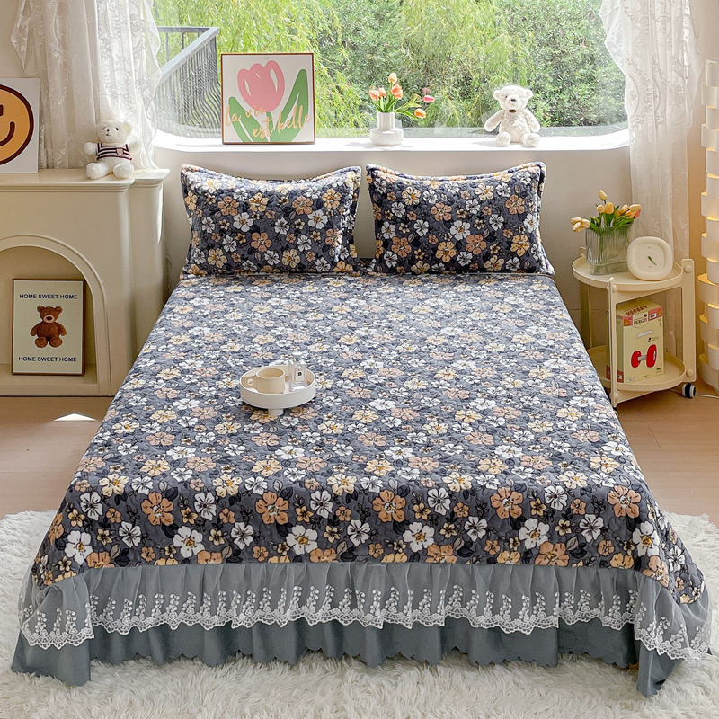 雅眠居 2023新款直播爆款牛奶绒双层蕾丝床盖夹棉床裙款 繁花似锦