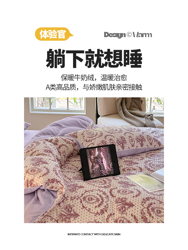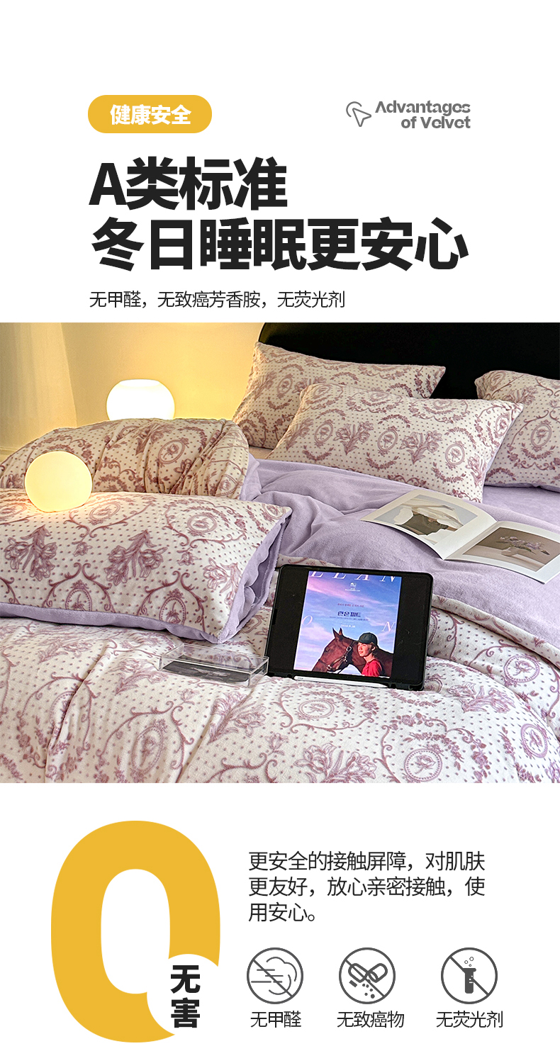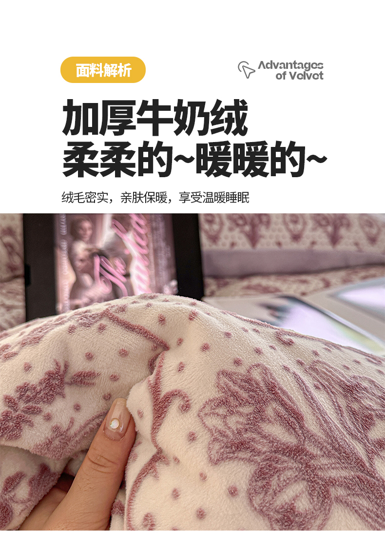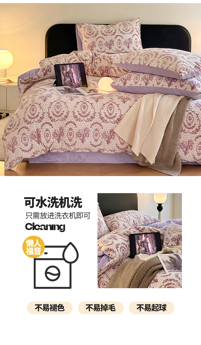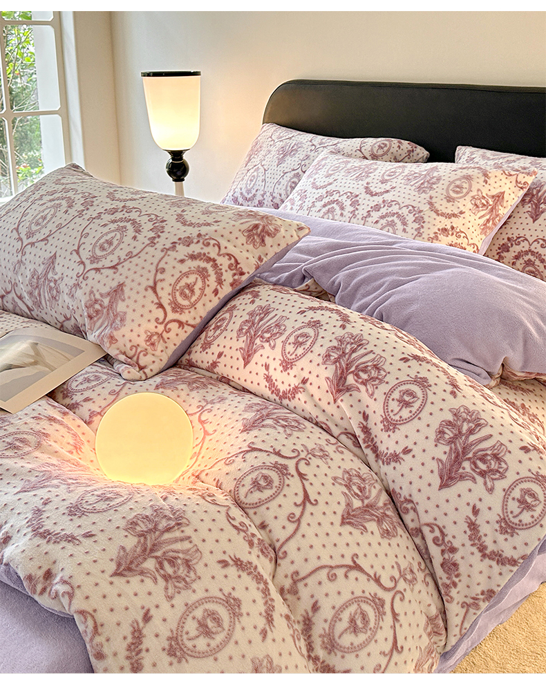 商品名称:桃子家居 2023新款A类高克重230克法式轻奢复古着色烂花雕花缦格加厚牛奶绒四件套 缦格丁香紫