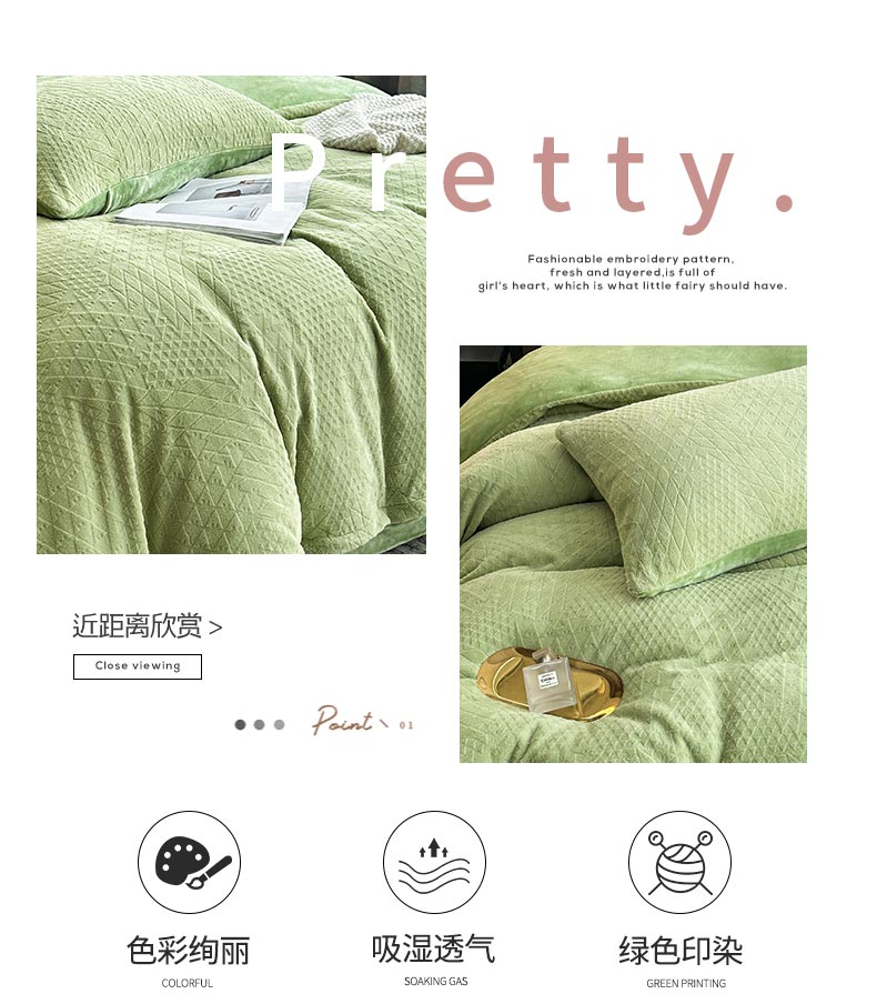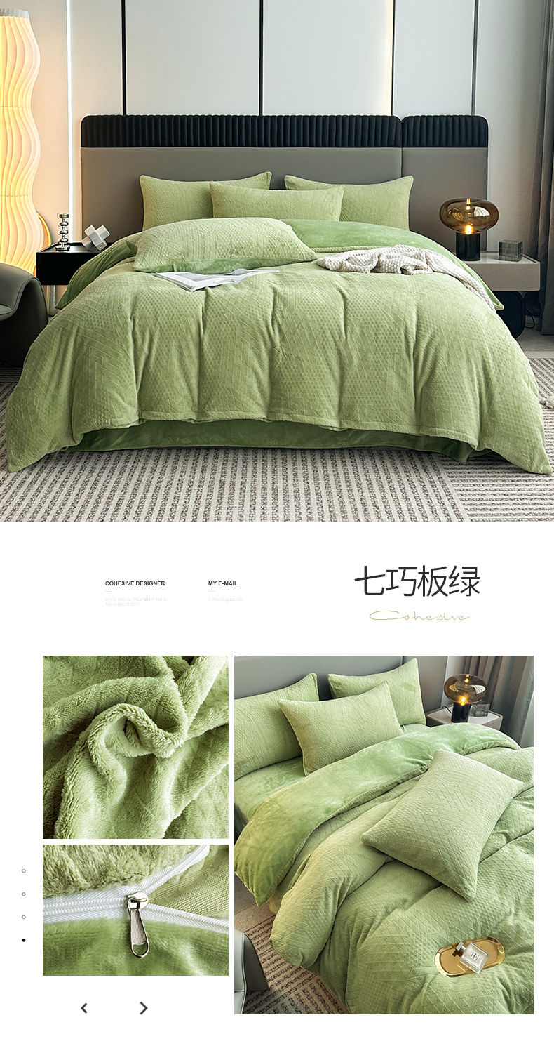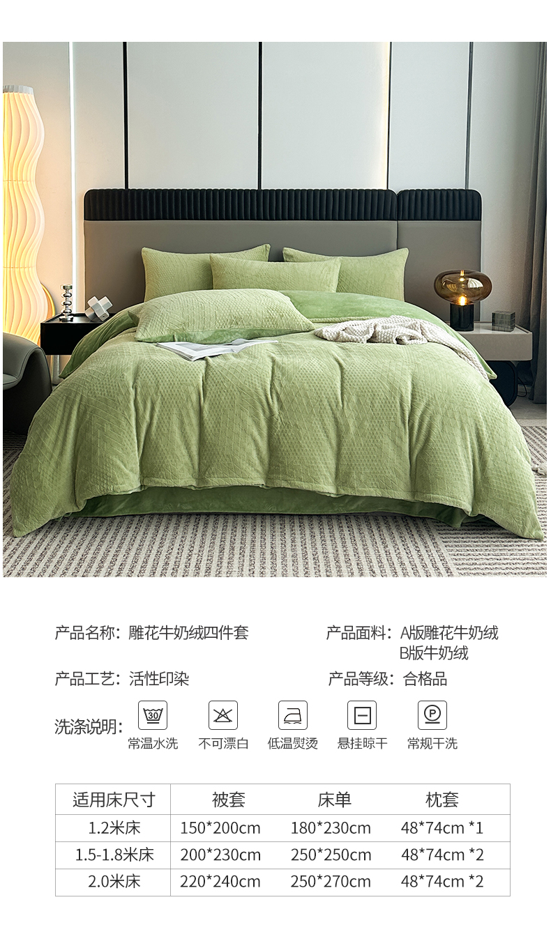 商品名称:铠畅家纺 2023爆款A类230g立体雕花牛奶绒四件套 七巧板绿