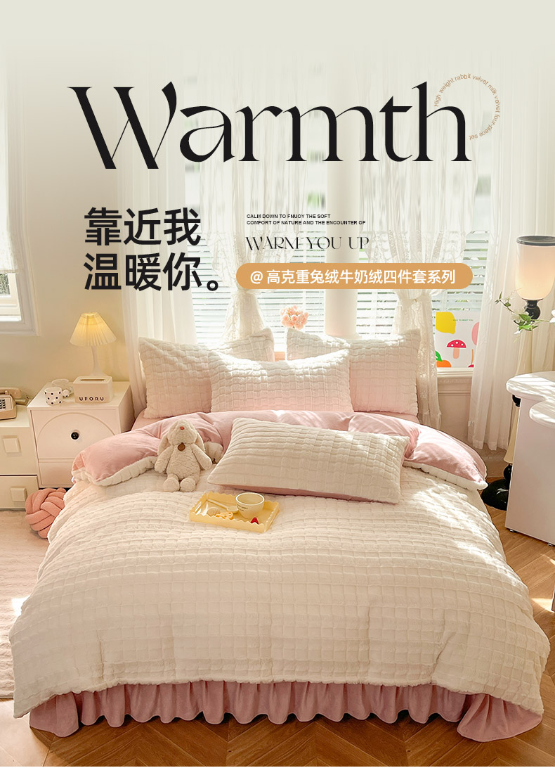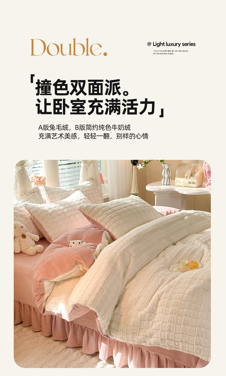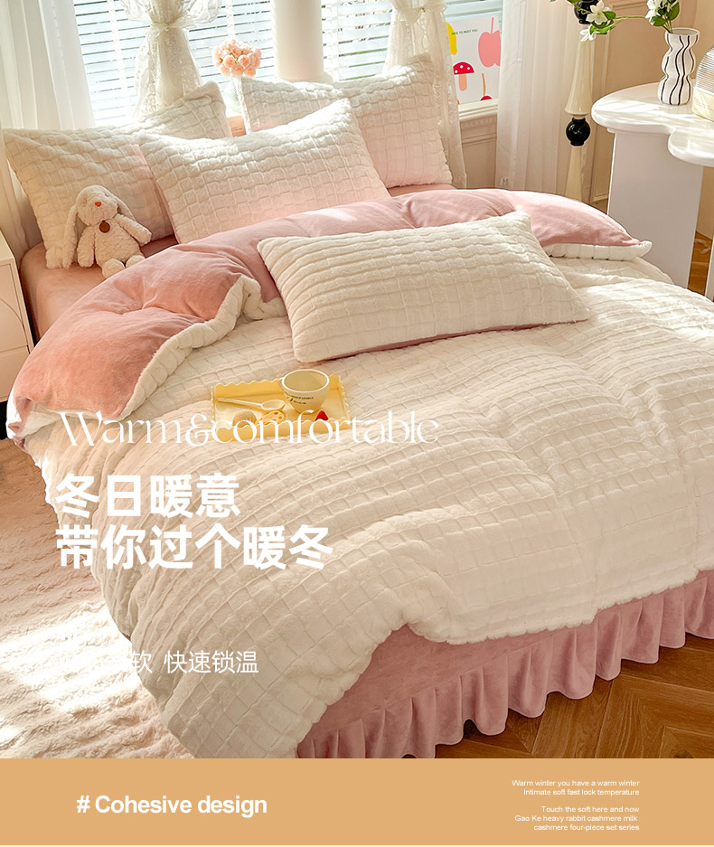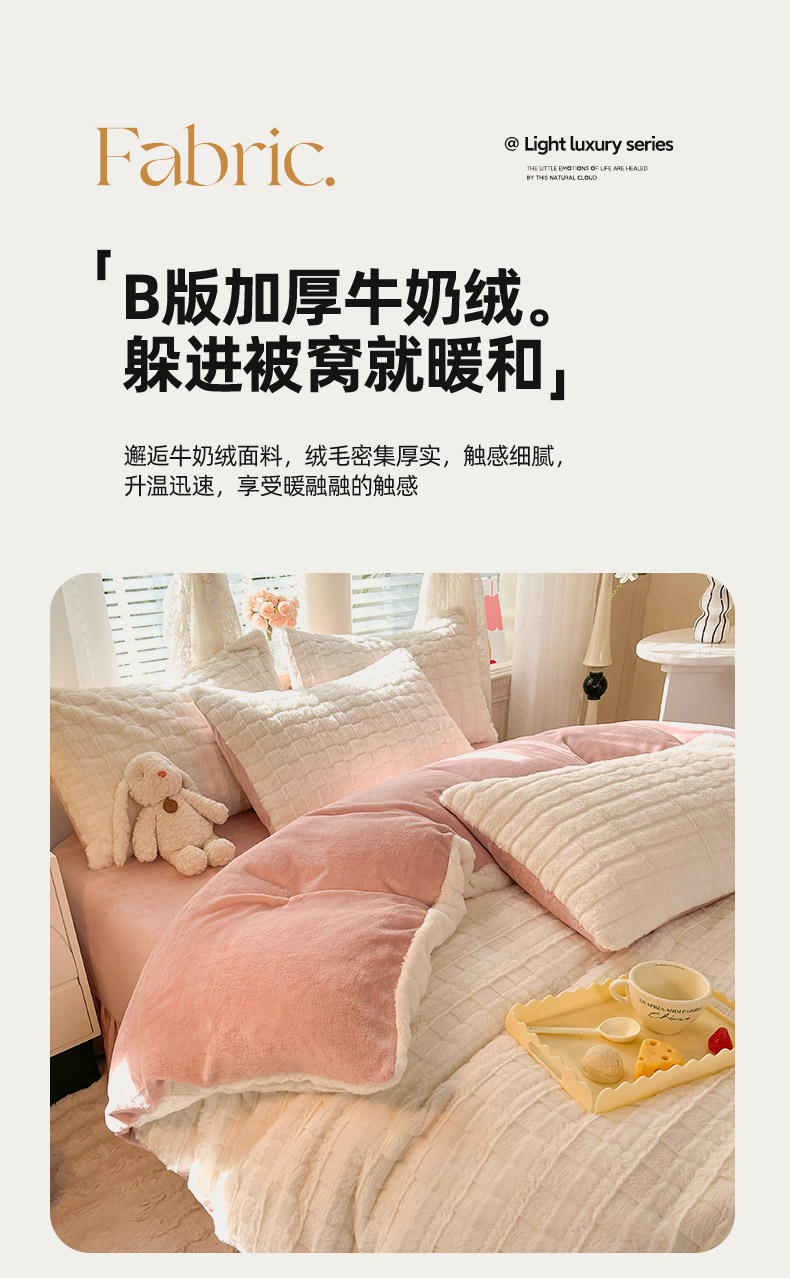 欧冠家纺 2023新款高克重兔绒牛奶绒四件套 月光白粉