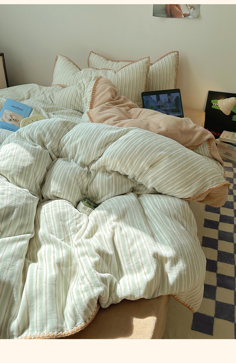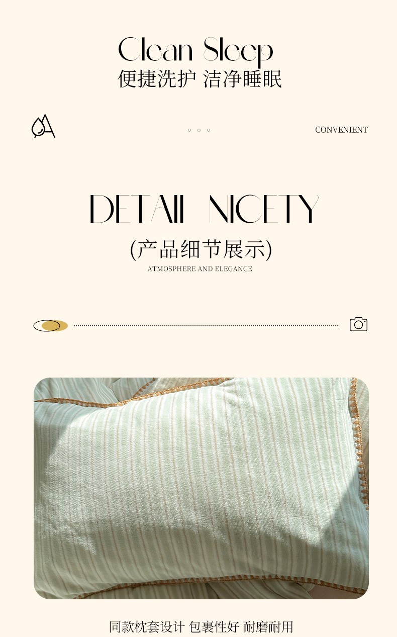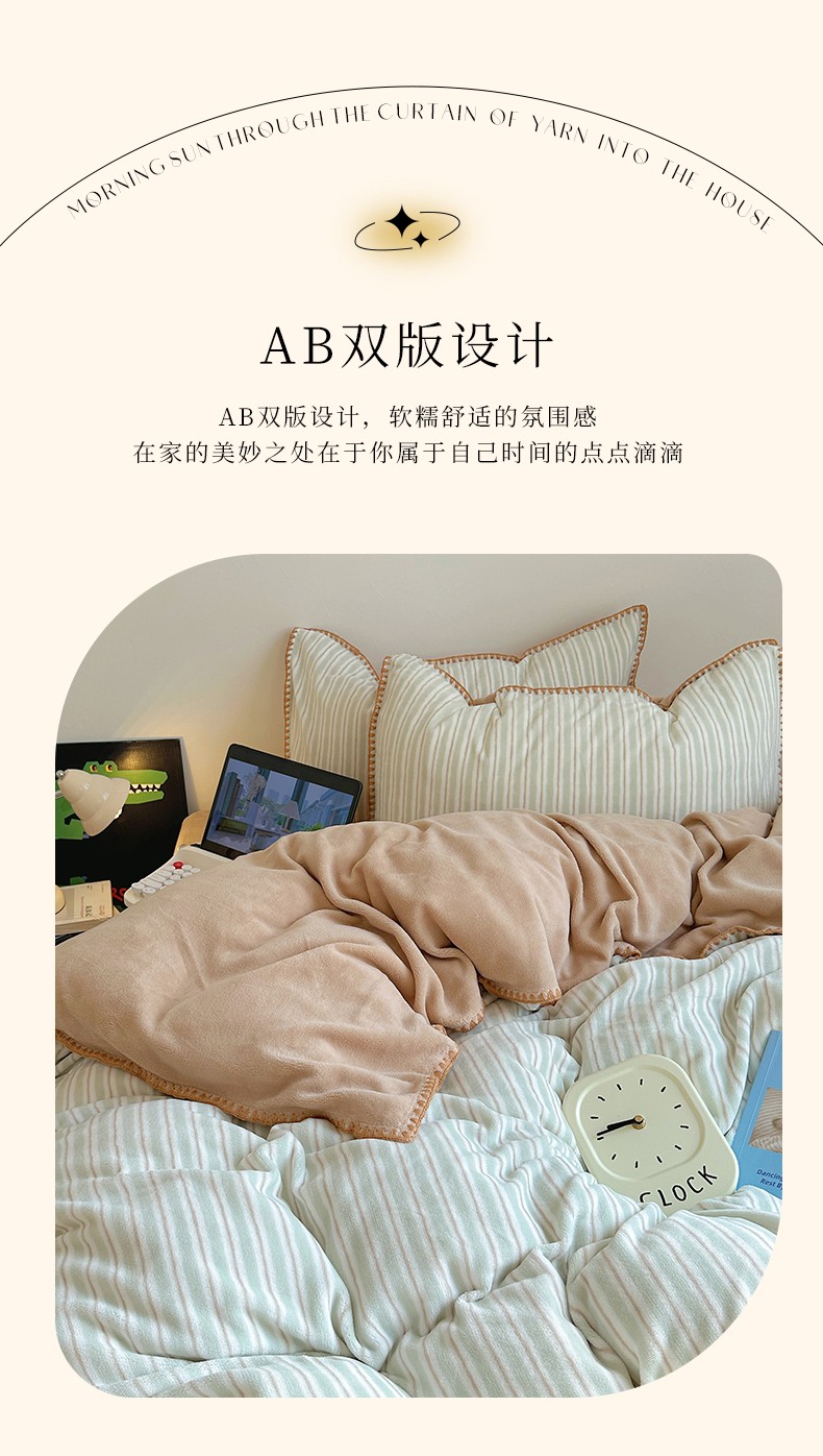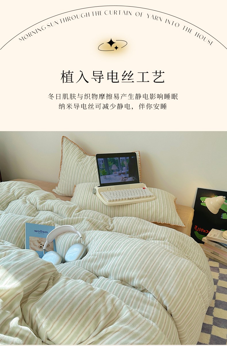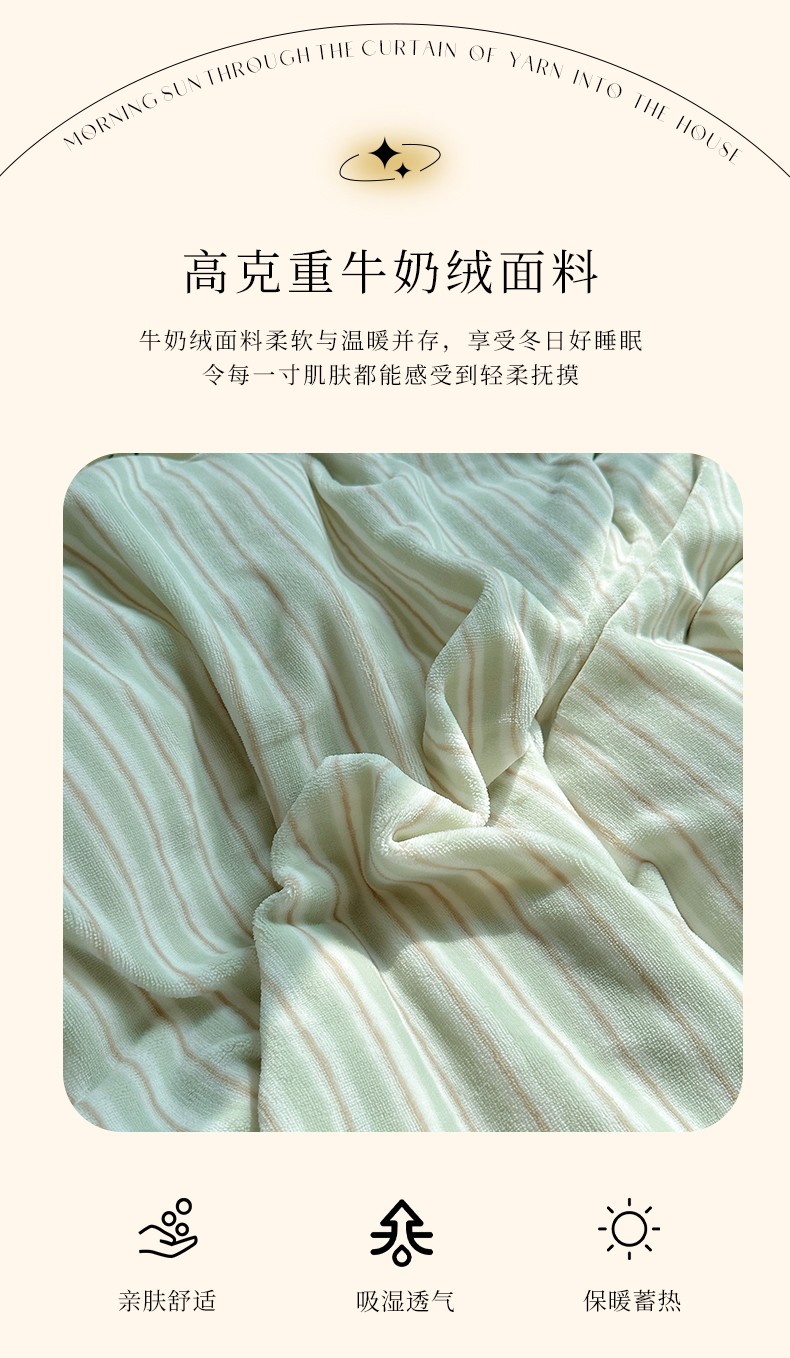 商品名称:三朵 2023新款无印风牛奶绒四件套 豆豆绿细条