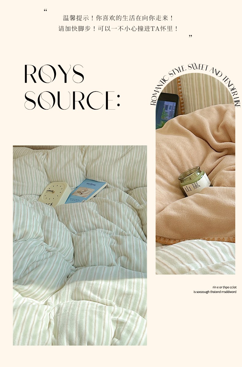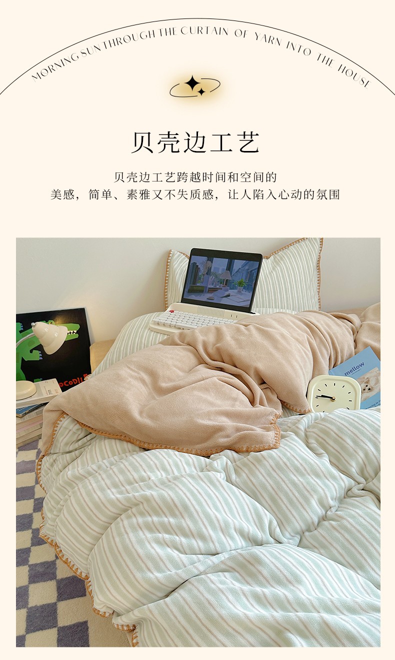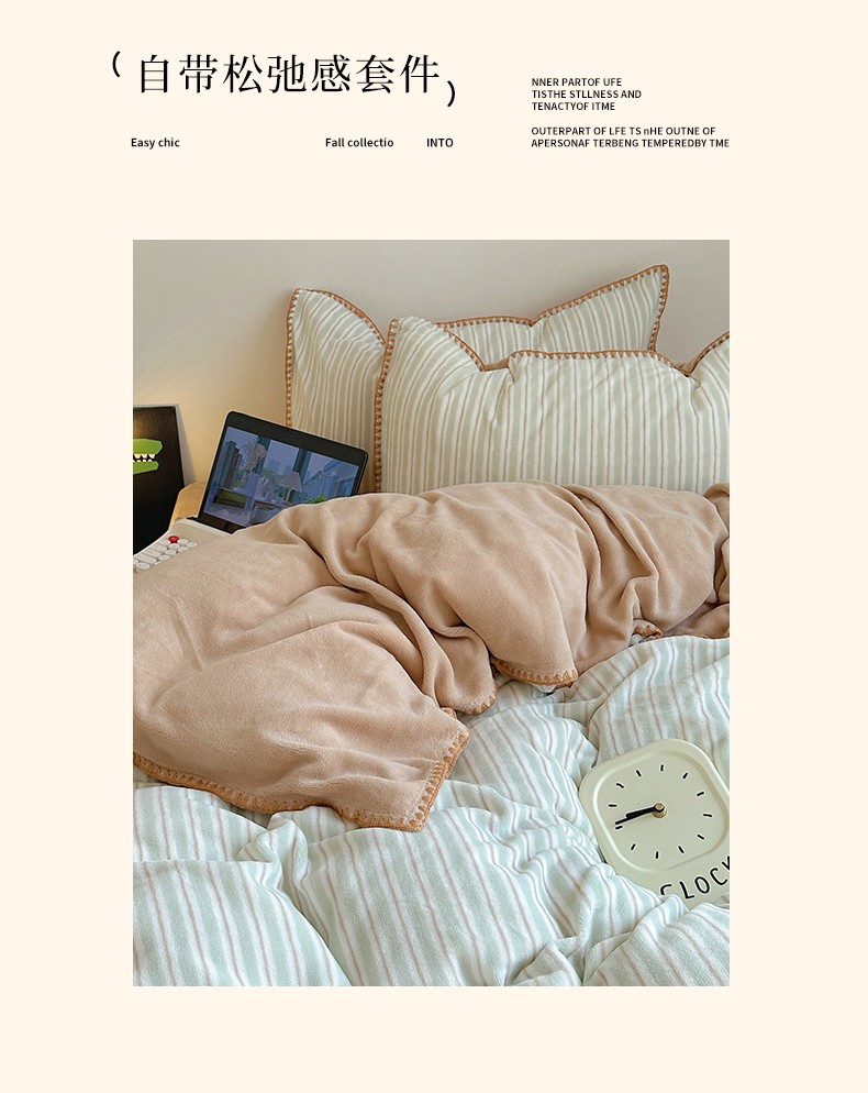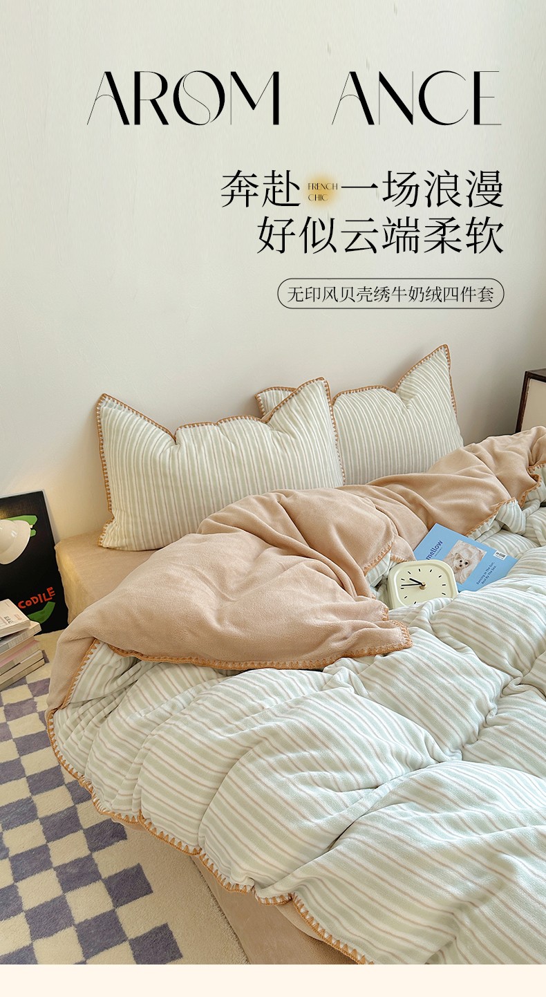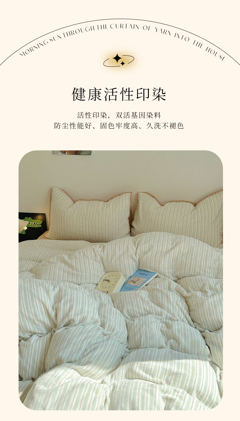 商品名称:三朵 2023新款无印风牛奶绒四件套 豆豆绿细条