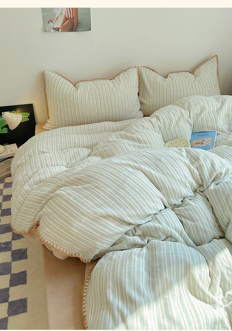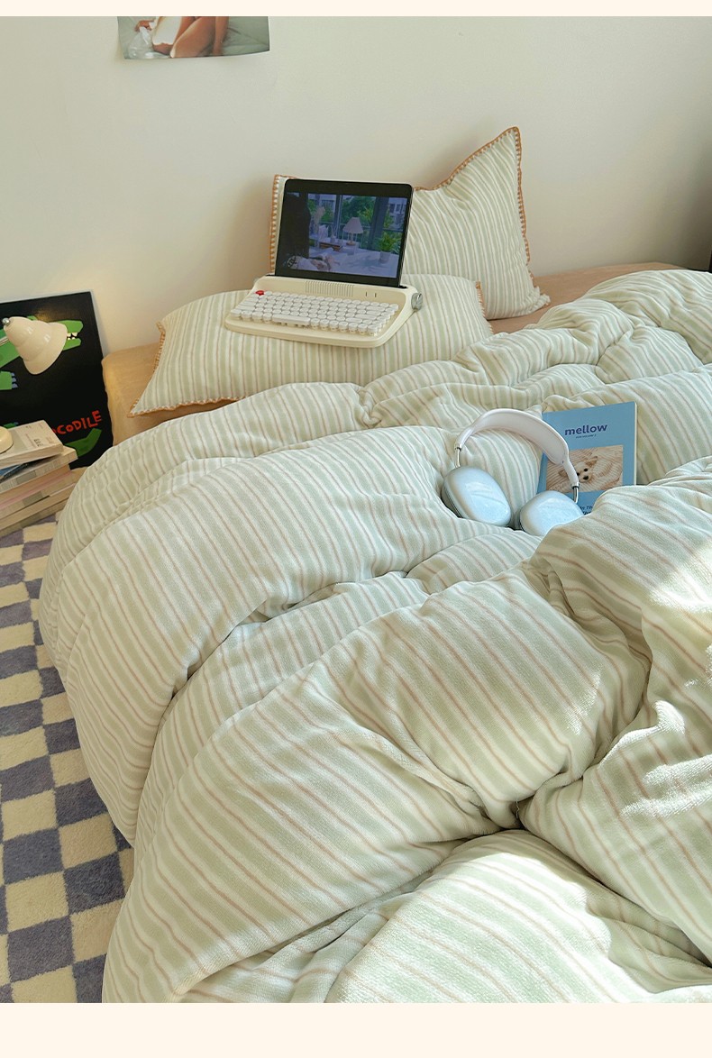 三朵 2023新款无印风牛奶绒四件套 豆豆绿细条