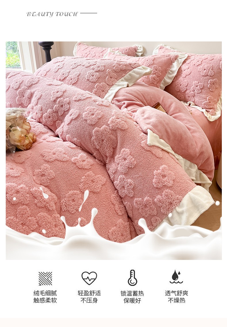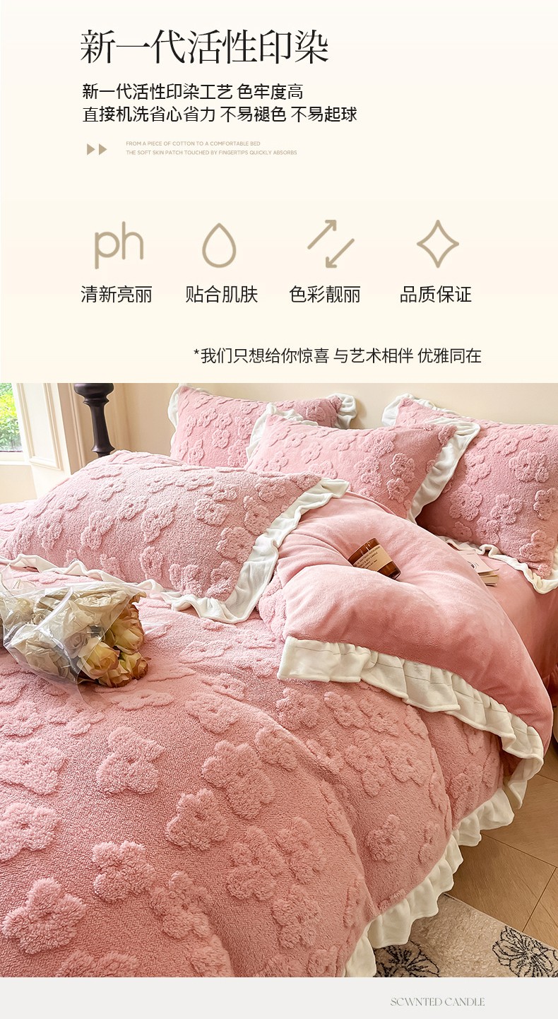 芯贝儿 2024款小清新花边加厚保暖牛奶绒毛巾绣花宝宝绒雕花绒法莱绒四件套 莫奈花园--粉