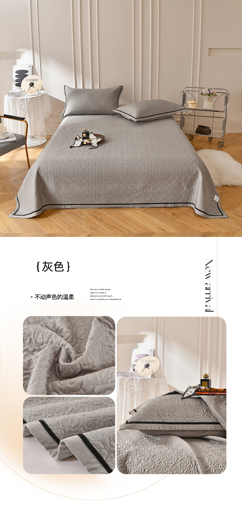 商品名称:上喜 热卖纯色玫瑰花莫代尔床盖 灰色