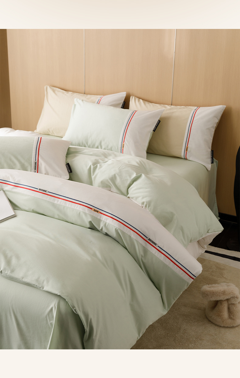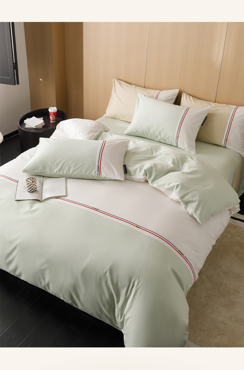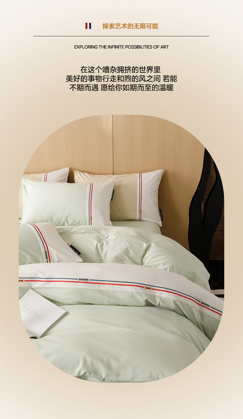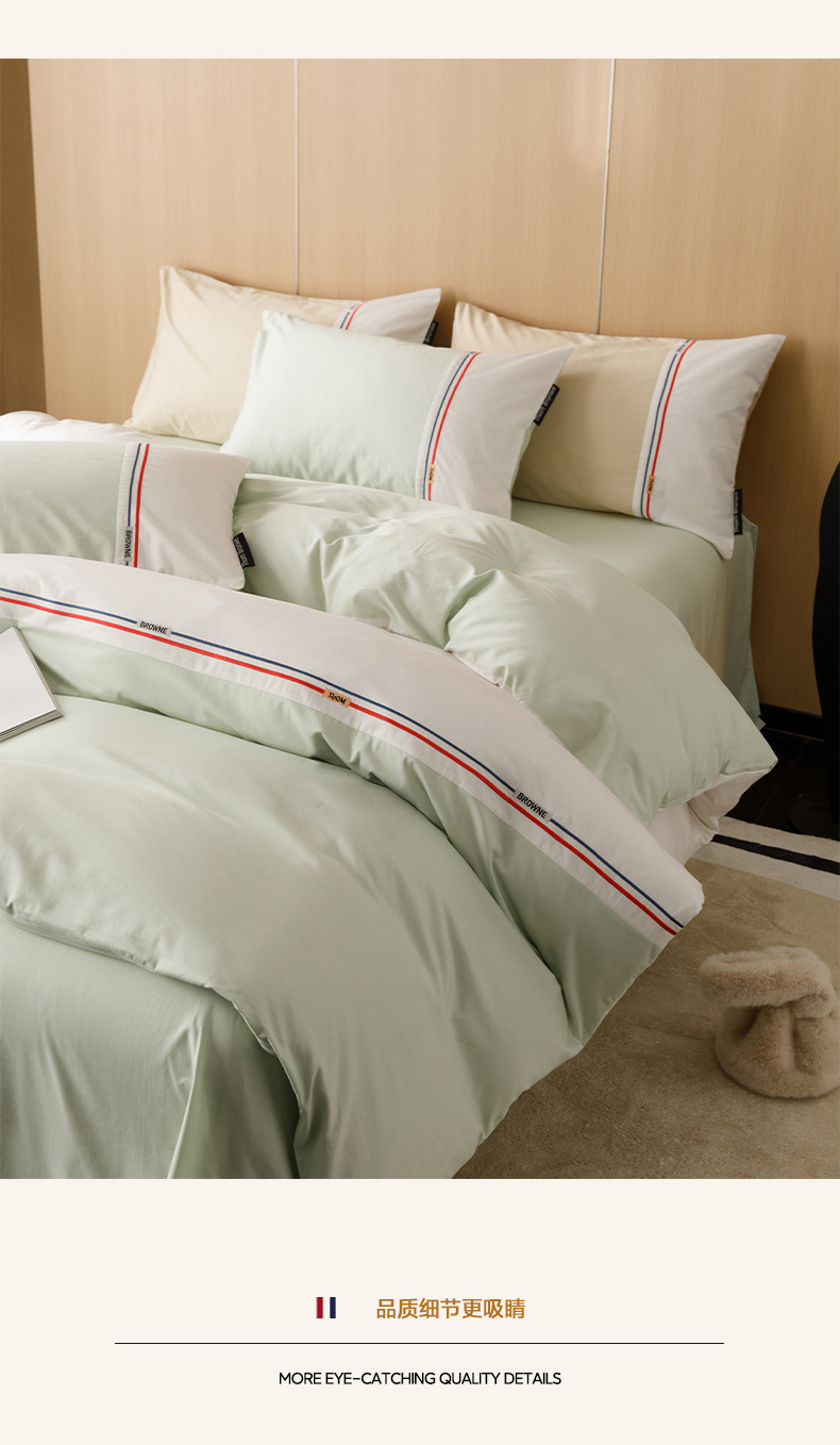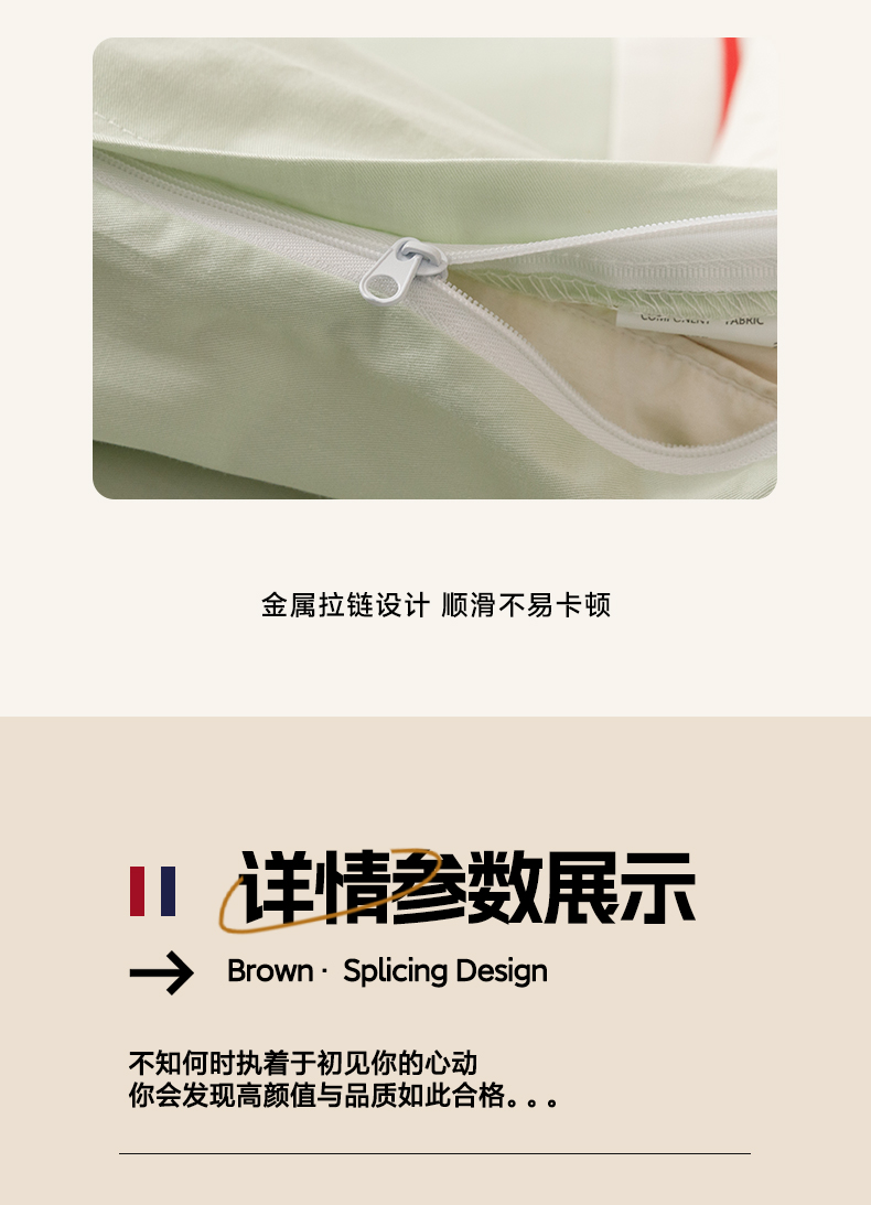 商品名称:卡巴伦家纺 2025新款全棉A类绣花拼接款四件套-布朗 布朗-青草绿
