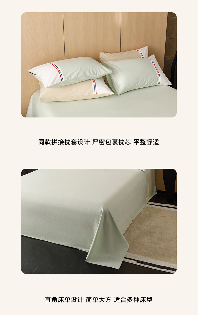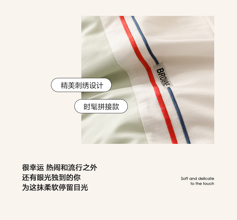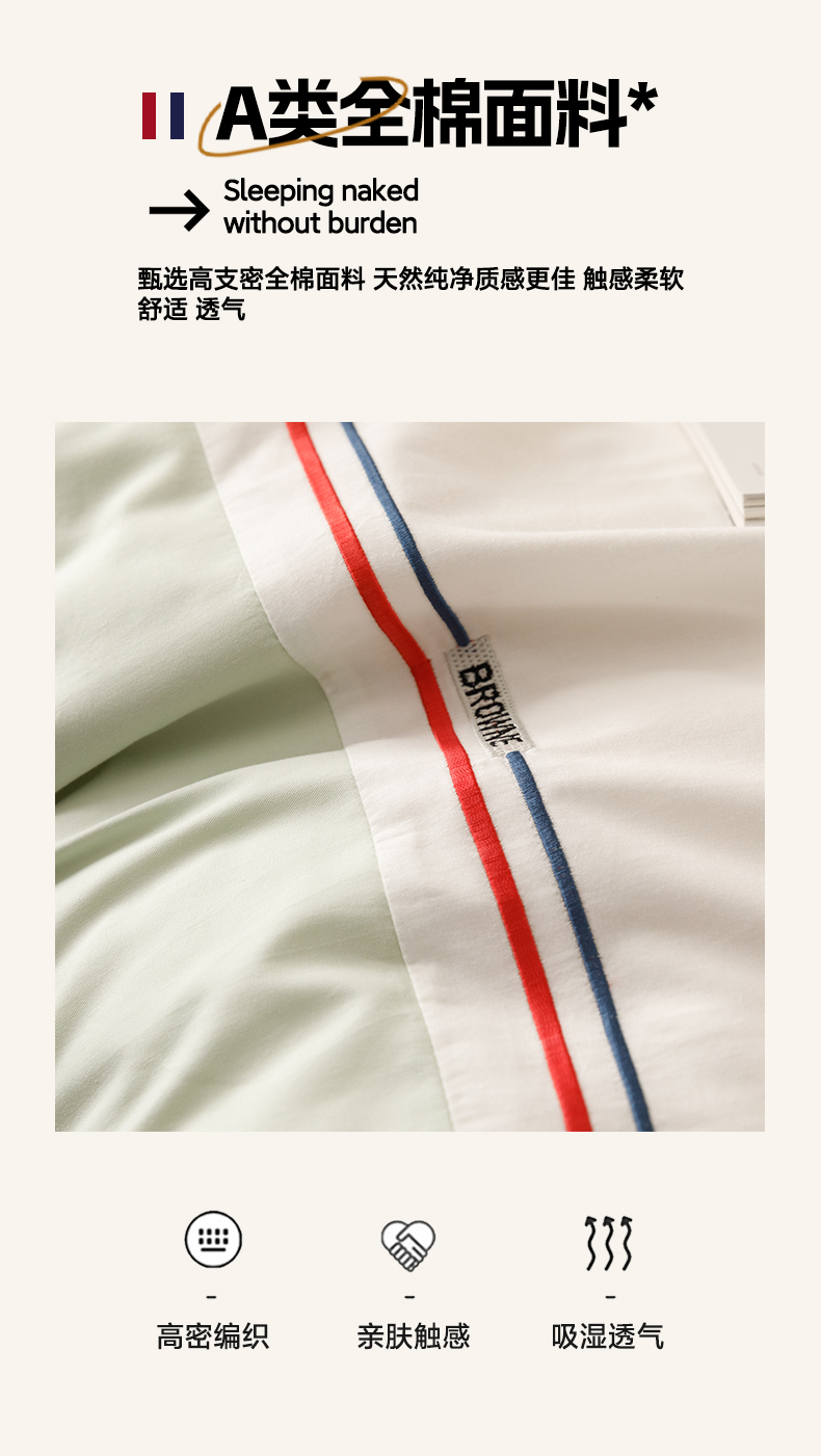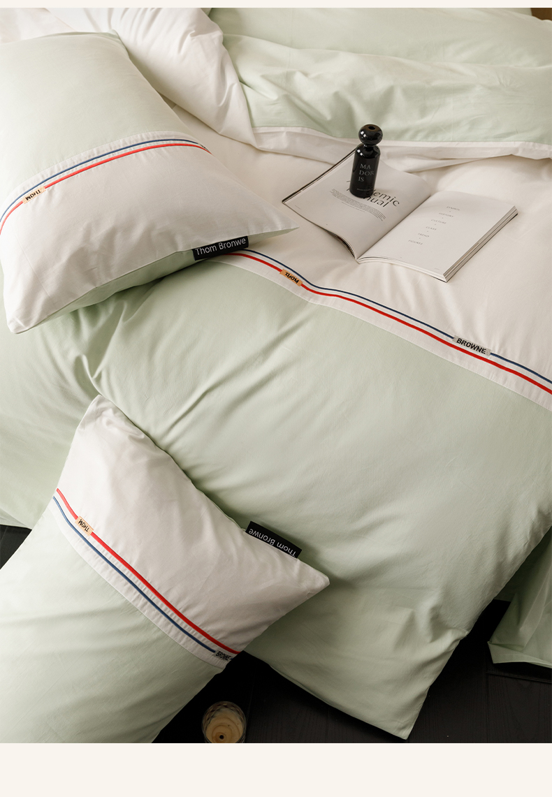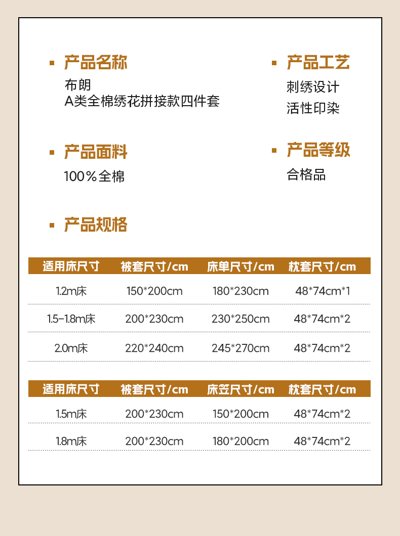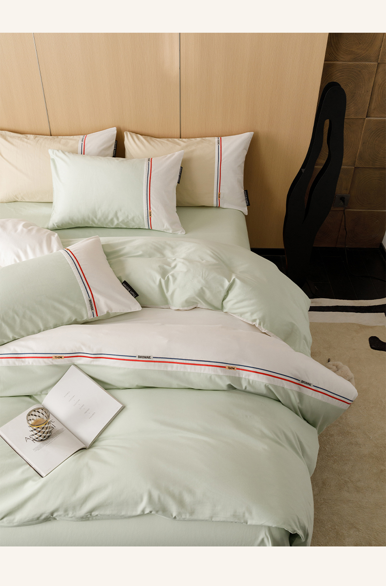 商品名称:卡巴伦家纺 2025新款全棉A类绣花拼接款四件套-布朗 布朗-青草绿