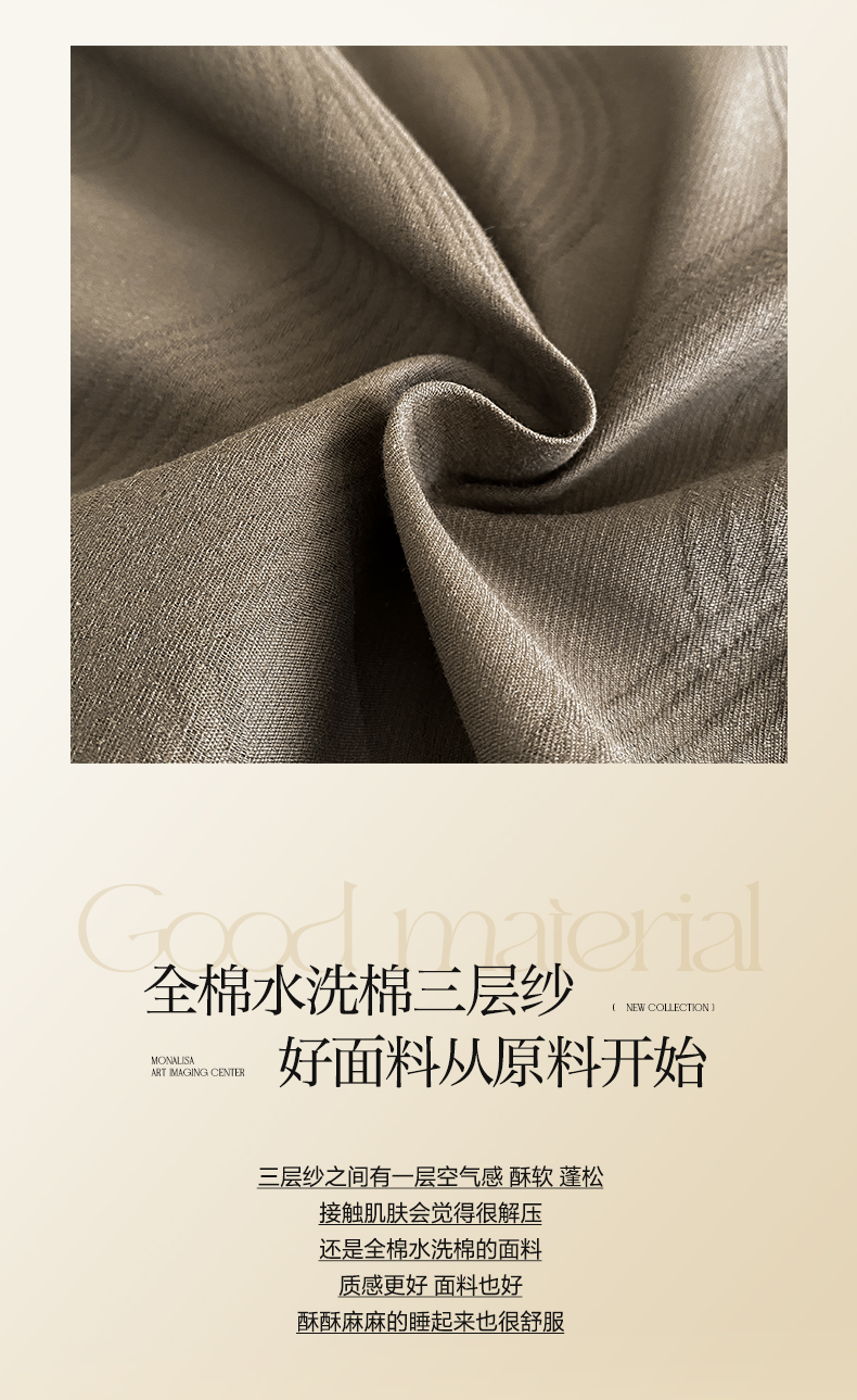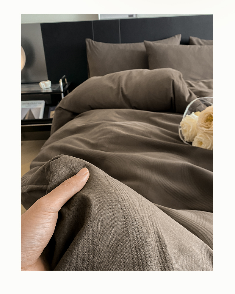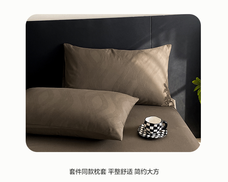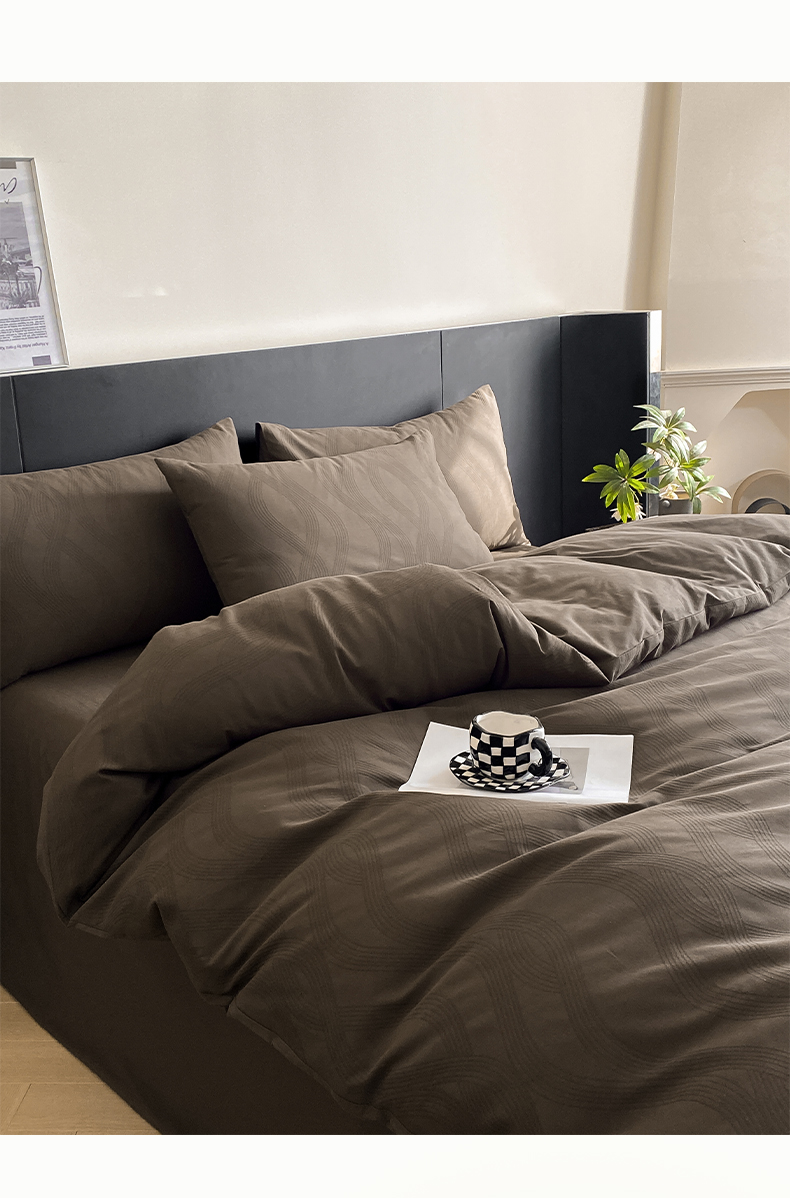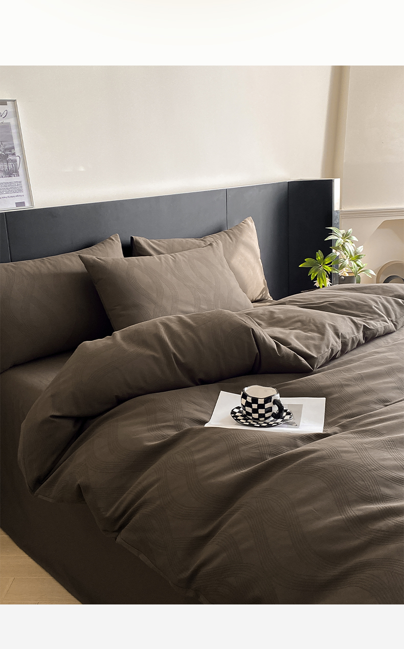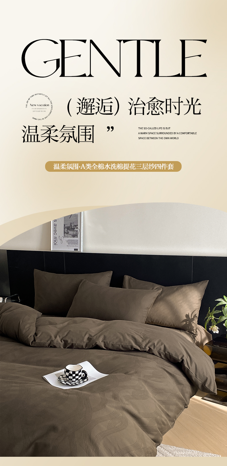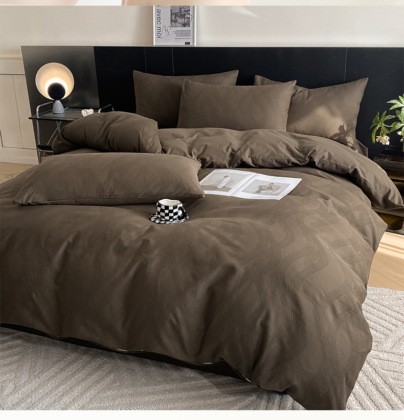 当前位置: 91家纺网 > 商品网购 > 床品套件 > 四件套 > 全棉普通四件套 > 莱登卡奴 2024新款全棉A类水洗棉提花三层纱四件套 艾利-深咖