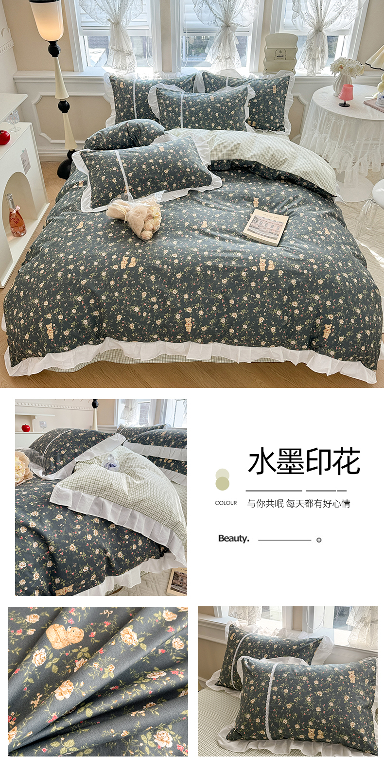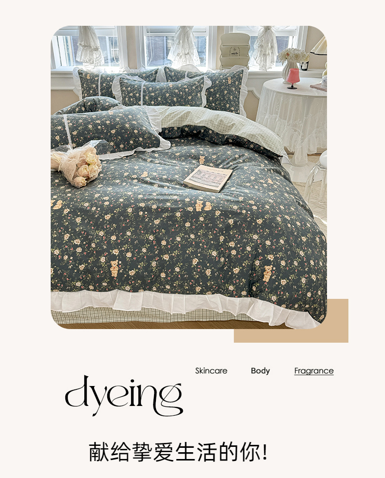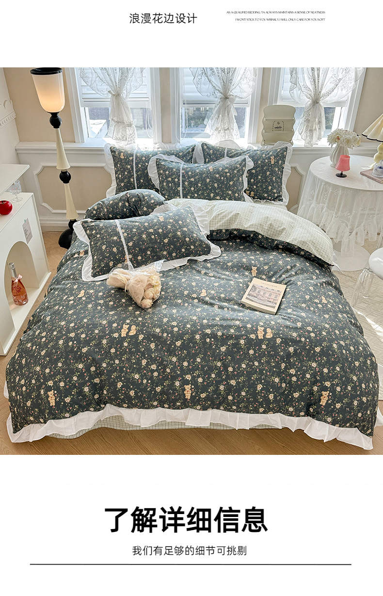 商品名称:简宜家居(朝初家纺) 2025新款40支斜纹全棉花边款四件套 水墨印花