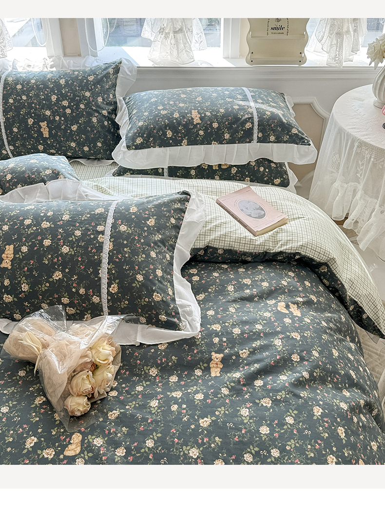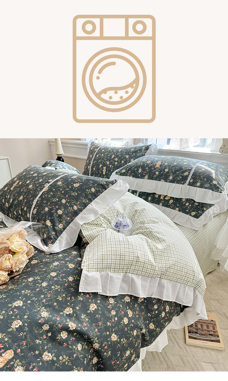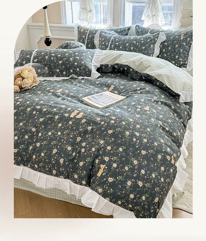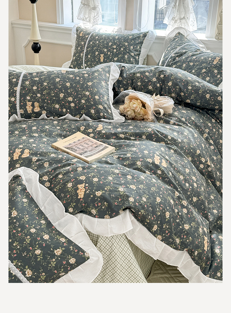 商品名称:简宜家居(朝初家纺) 2025新款40支斜纹全棉花边款四件套 水墨印花