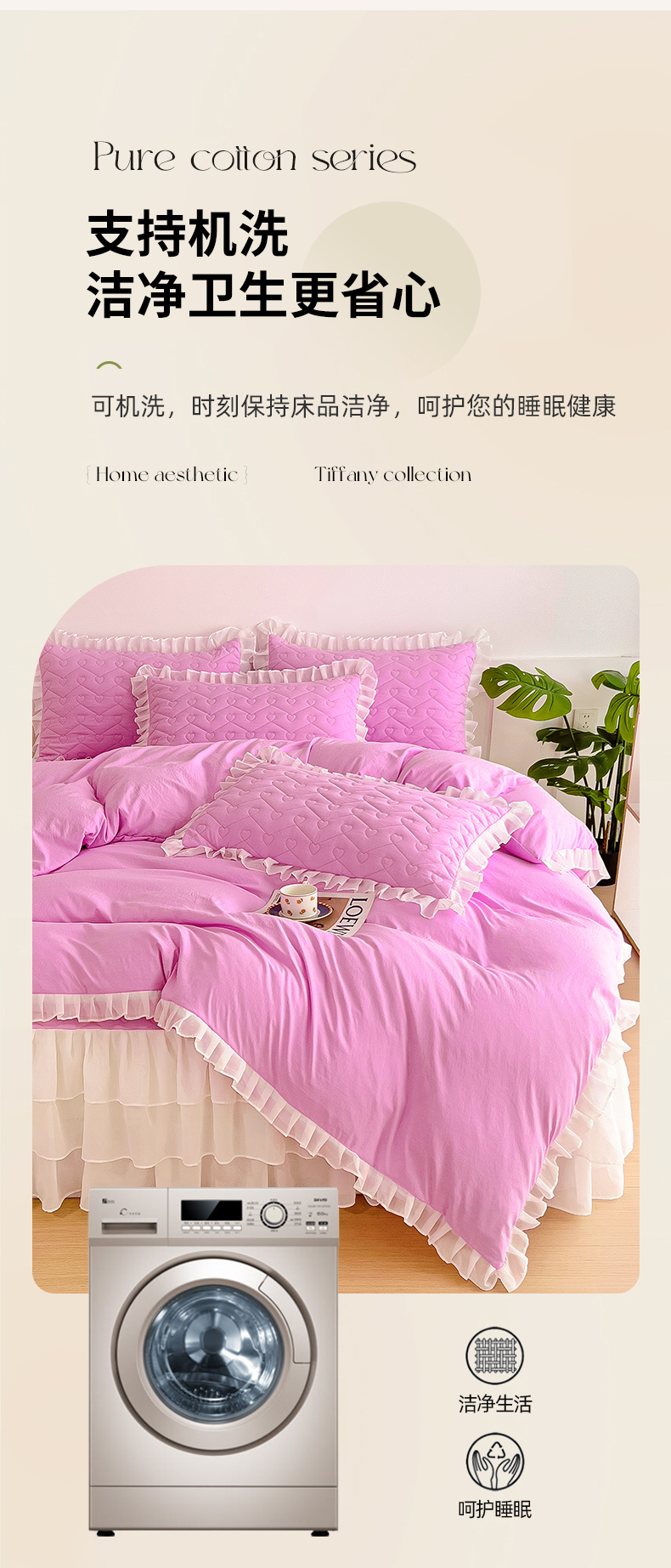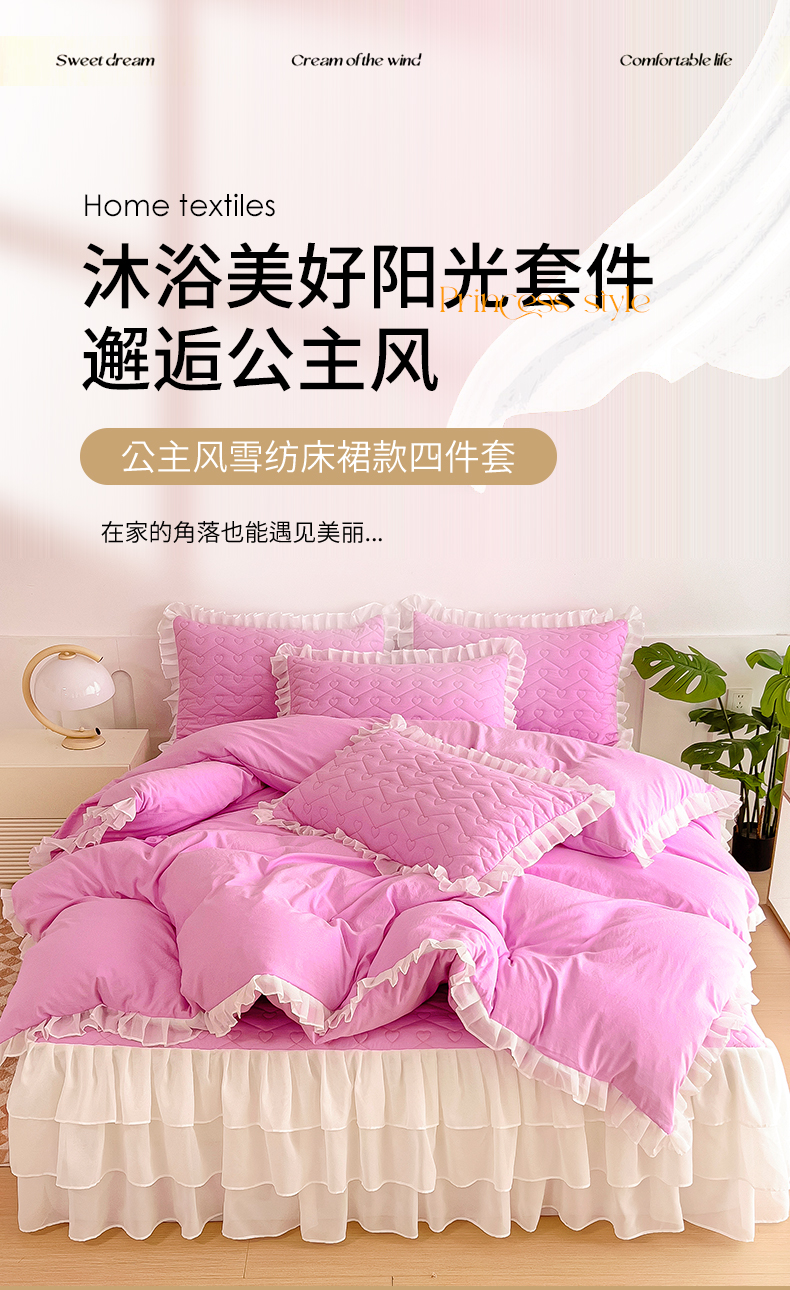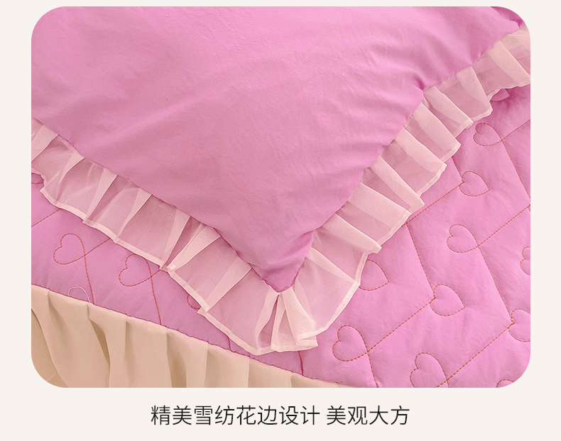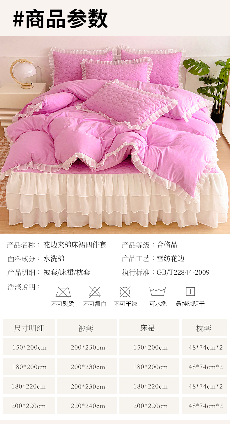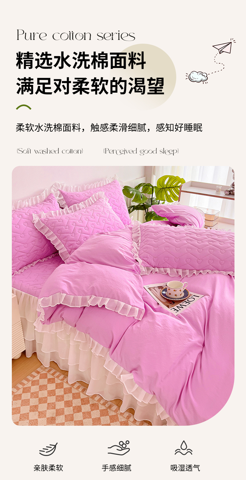 商品名称:屹成 2024新款水洗棉雪纺丽莎款床裙款四件套 粉红