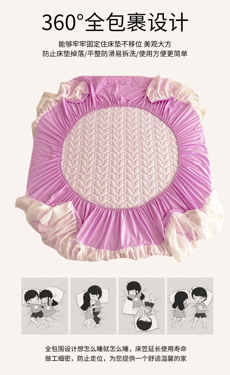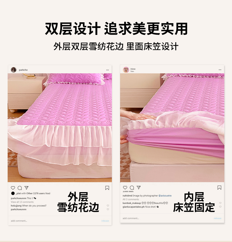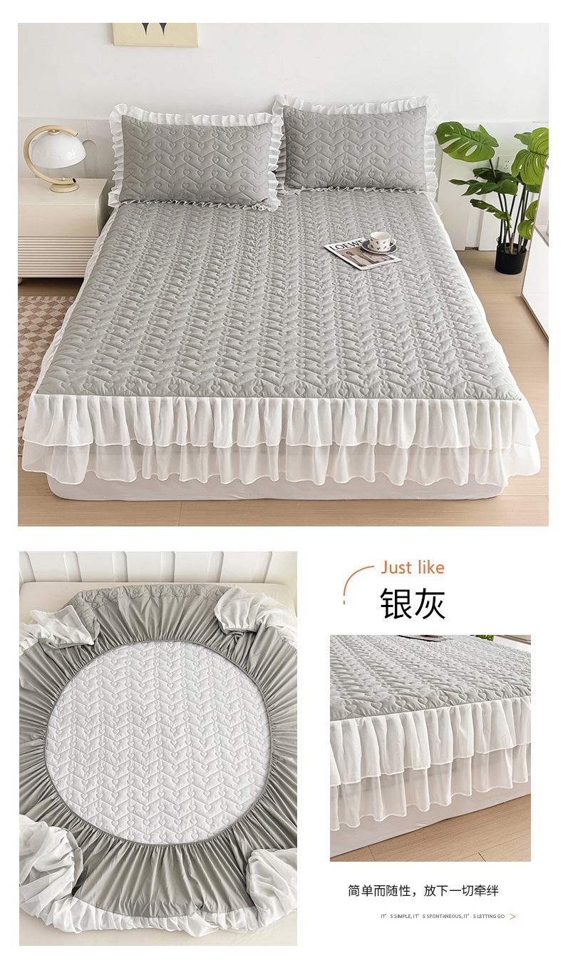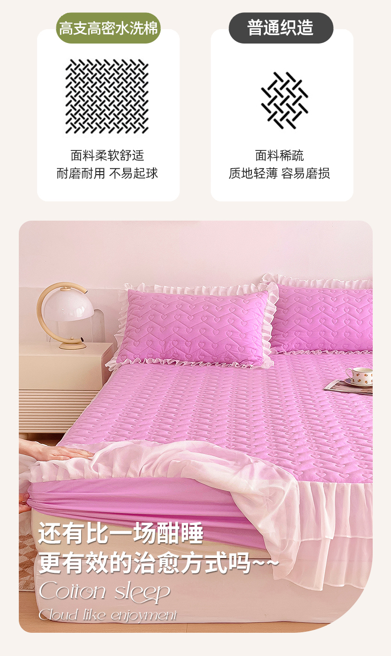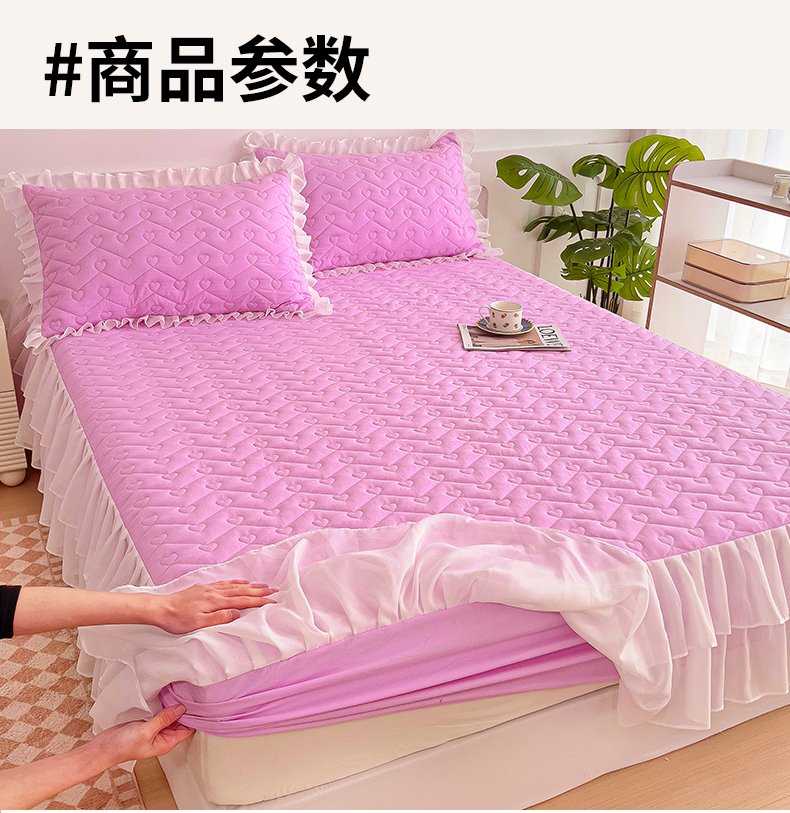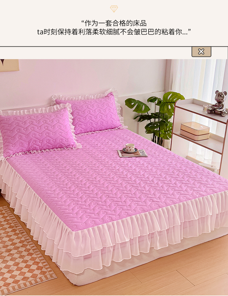 (总)屹成家纺2025新款水晶绒夹棉绗缝蕾丝床裙三件套(塞纳河畔)床裙单件起售价不低于105元,大红,豆沙,翡翠绿,粉玉,橄榄绿,蔚蓝,银灰