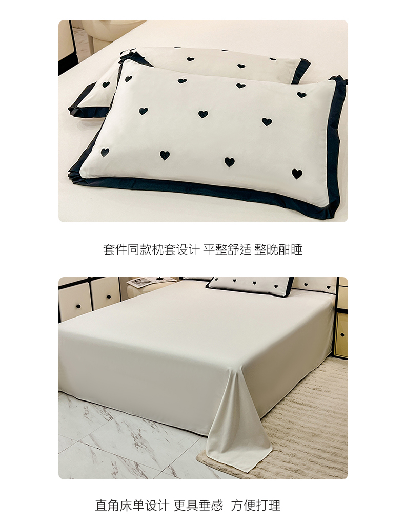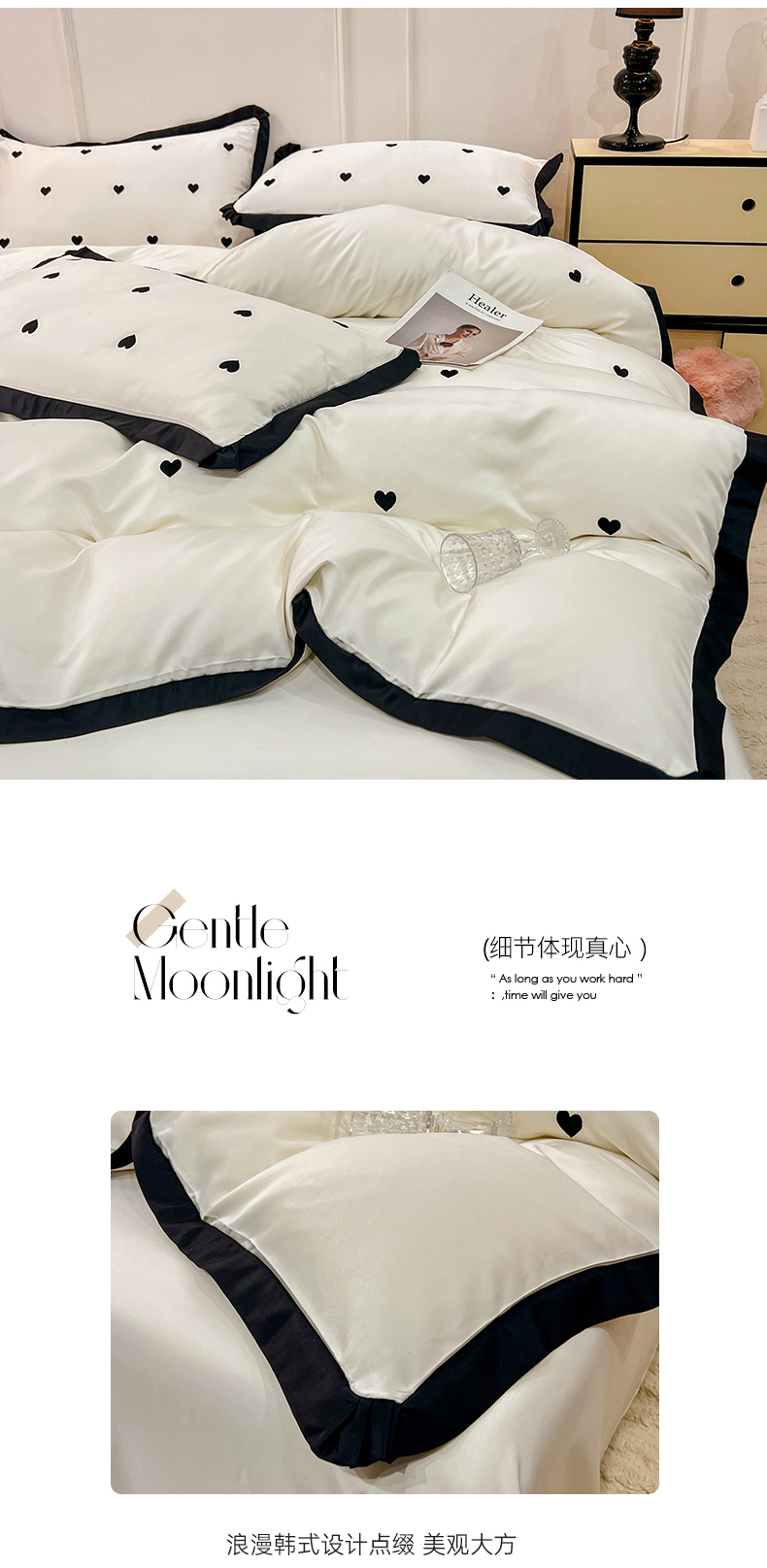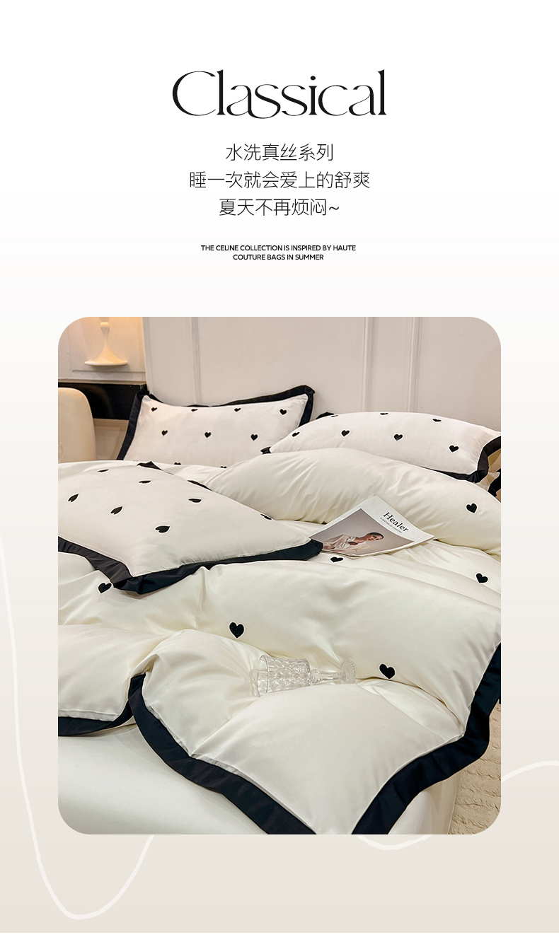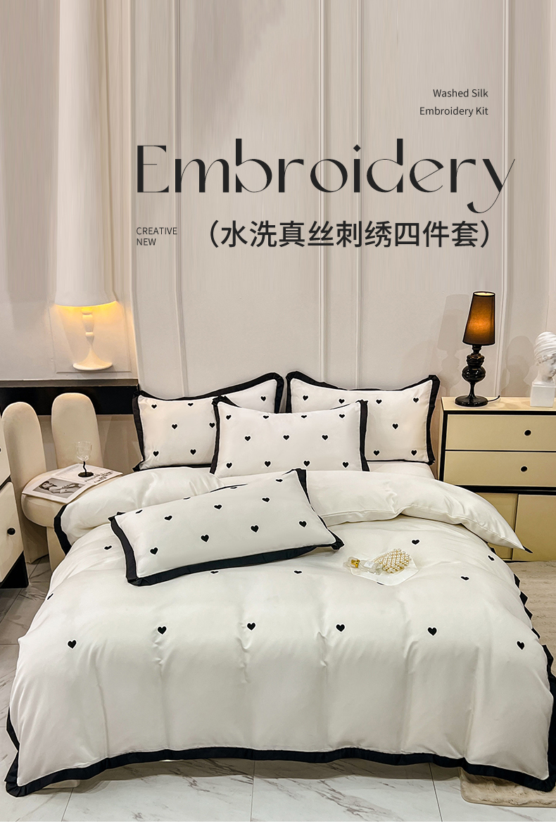 艾米家居 2025新款水洗真丝四件套爱心款 黑色爱心款-白色