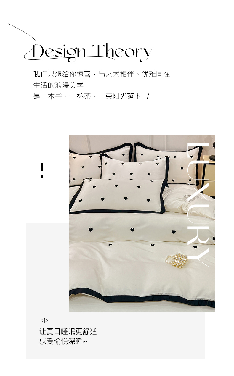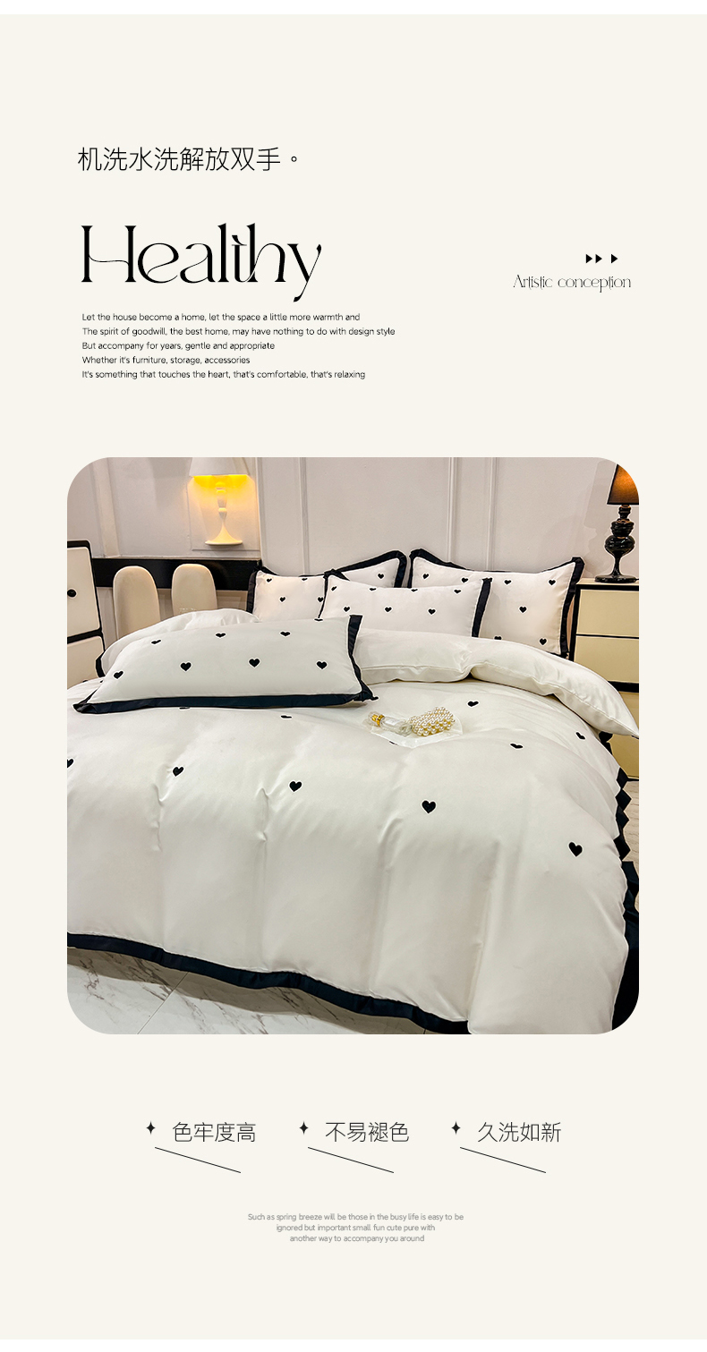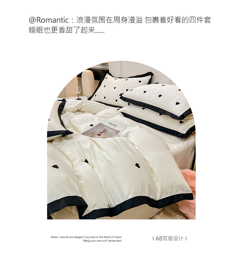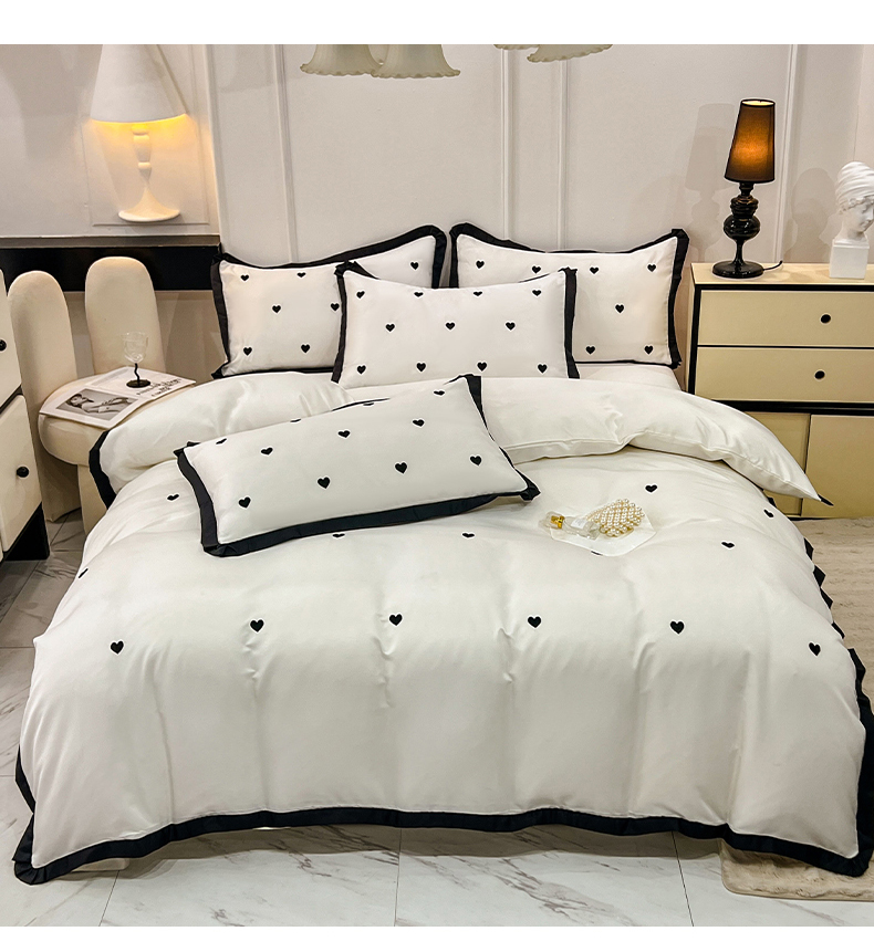 艾米家居 2025新款水洗真丝四件套爱心款 黑色爱心款-白色