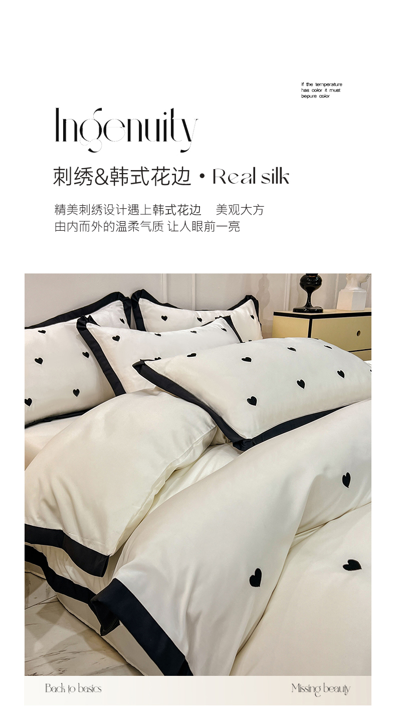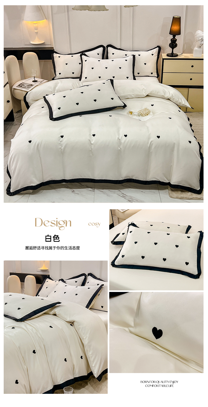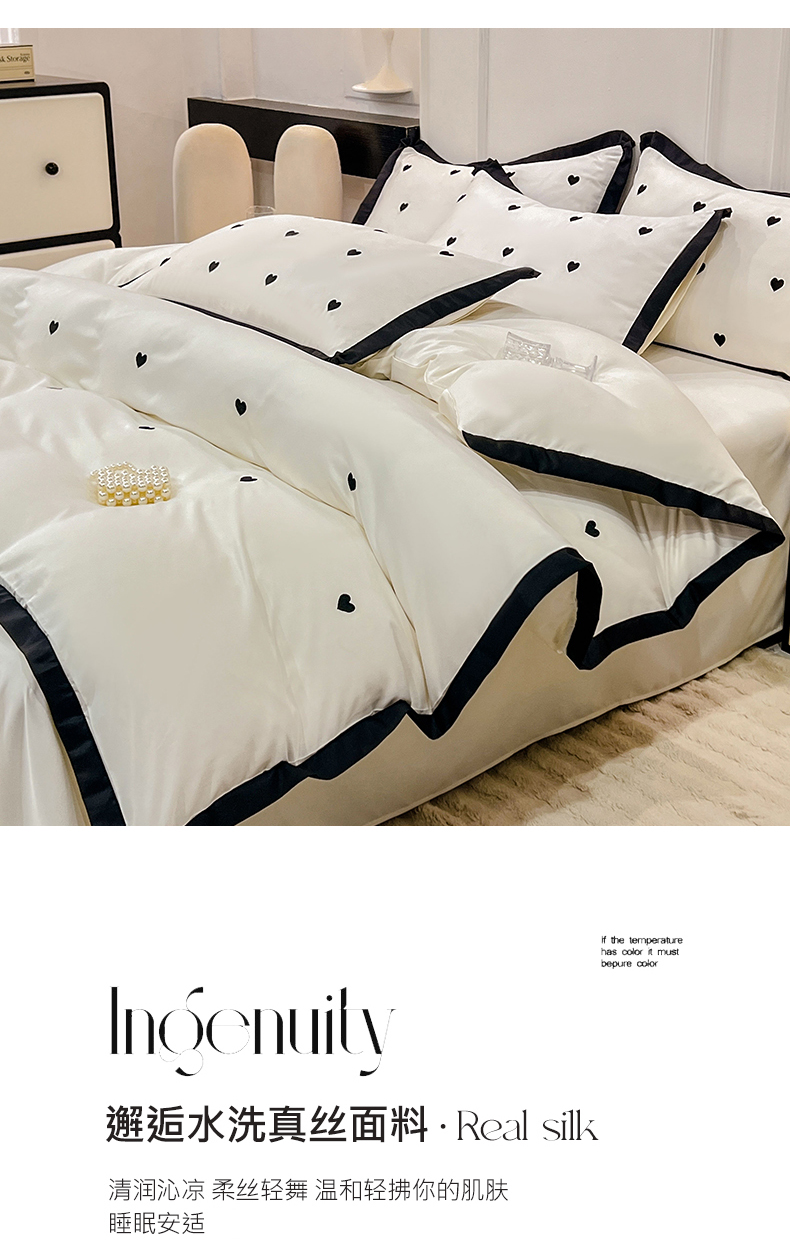 商品名称:艾米家居 2025新款水洗真丝四件套爱心款 黑色爱心款-白色