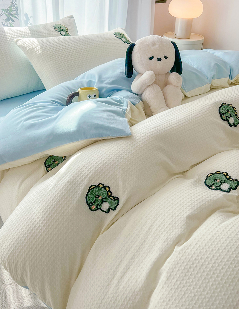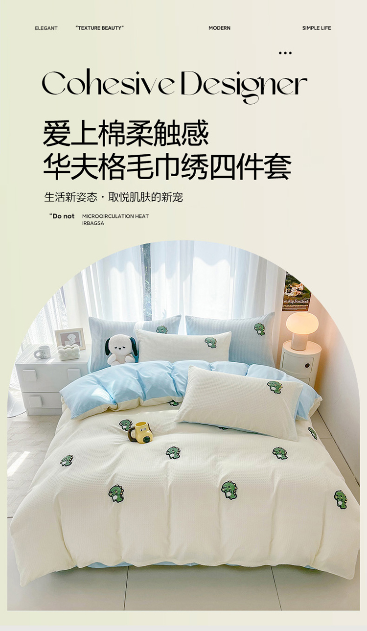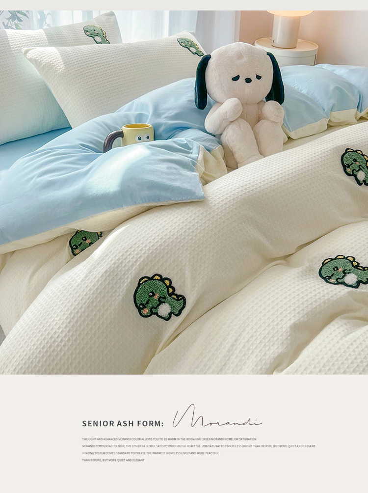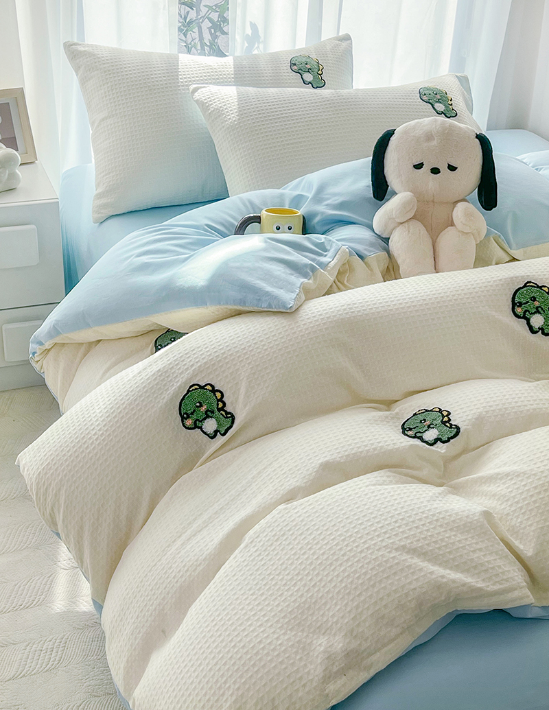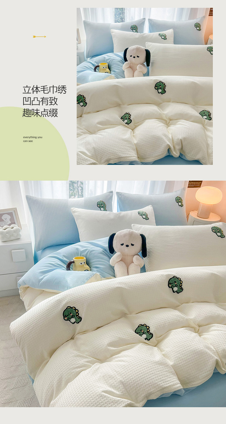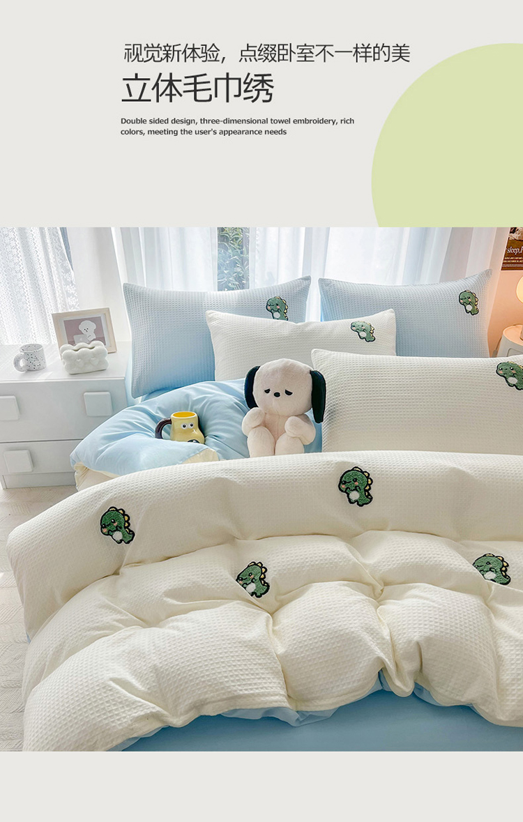 当前位置: 91家纺网 > 商品网购 > 床品套件 > 四件套 > 毛巾绣四件套 > 慕尚 2025新款全棉华夫格毛巾绣四件套 恐龙之王白蓝